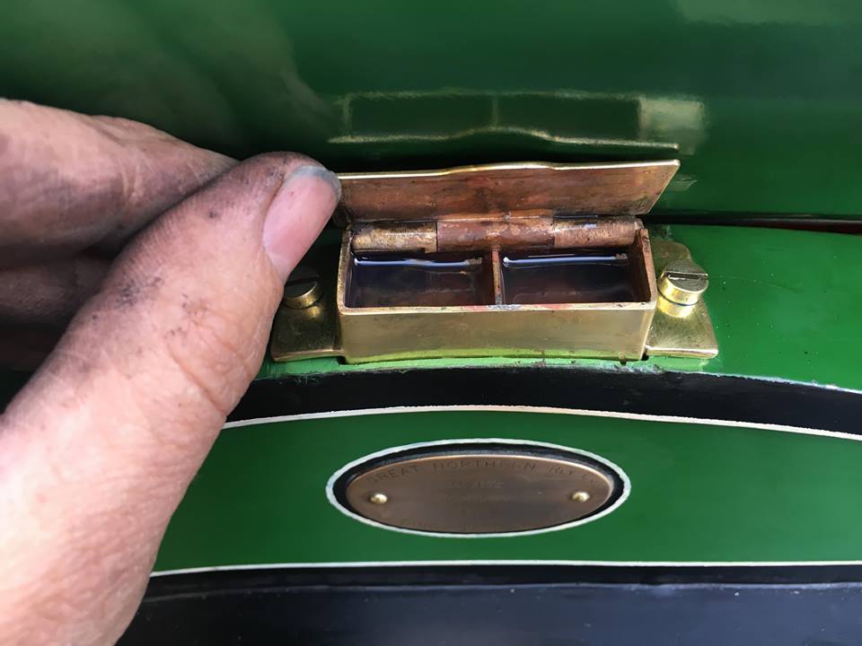 We have made a few subtle alterations, which we thing are both sympathetic and practical. At some point in the early 2000s a slightly clumsy looking large lubricator was added for practical purposes to lubricate the inside valve gear. We've removed it to push the locomotive back to it's original form, as we don't intend to use it in anything like the same, heavy commercial way that she has been run in the past. We decided that the rather crude painted steel oil pots on the top of the splashers weren't particularly pretty, and the full size prototypes had distinctive brass pots there, so we took the decision to re-locate the original steel ones to positions inside the frames, and make new deeper brass ones for the top of the splashers.