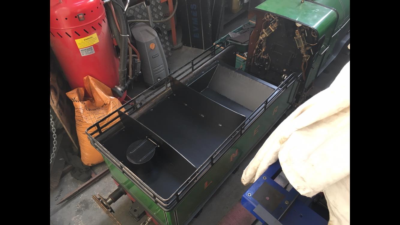 The seating position on the model was a little too cramped and too high. In order to re-locate the seat without cutting any original metal, we have unbolted and removed the original tank top (safely stored at the works), and built a new one where the seat is dropped a few inches into the water space, and moved a good 4 inches backwards. This reduces both the coal and water space but feels a lot more comfortable to drive! We have added a sump under the tender to replace the reduced water capacity, and tweaked the coal space backwards and around the driver's back to maintain sufficient coal.