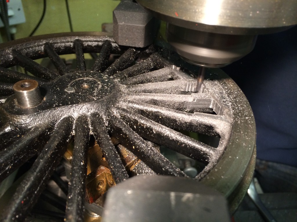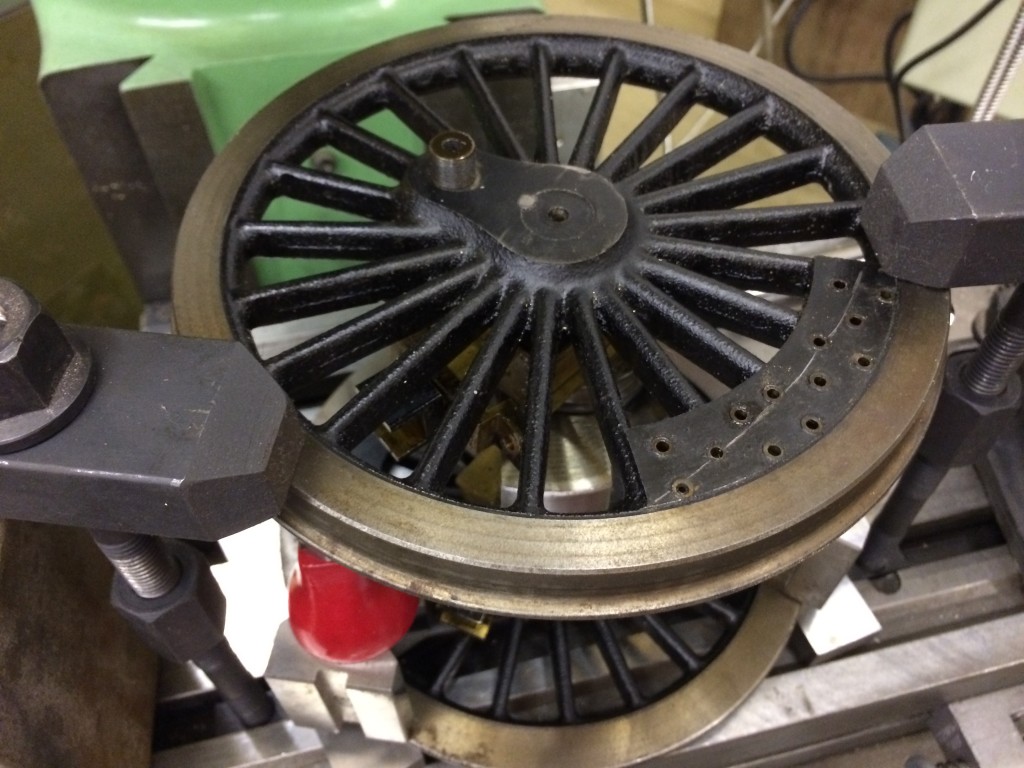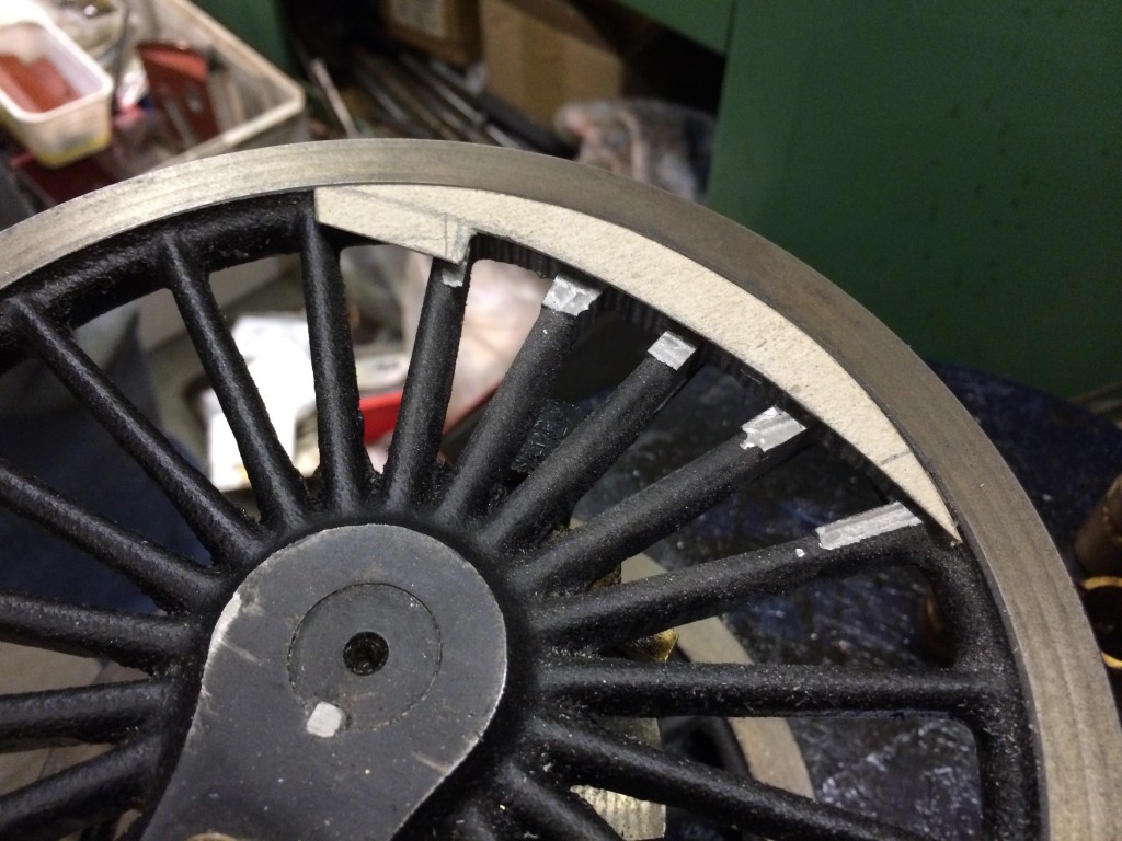 The wheels were next to receive attention. Although keyed onto the axles the keys were insubstantial and brass, so we machined up new tight fitting square keys from key steel to do the job properly. The cast in balance weights were nothing like the real thing either, so we picked our full sized loco, and then made card templates for the prototypical balance weight profiles (different for all wheels). We then machined away the excess material, filed in the spokes again, and then filled back to the exact shape we required. Makes a big visual difference to the overall look of the model and well worth the effort.