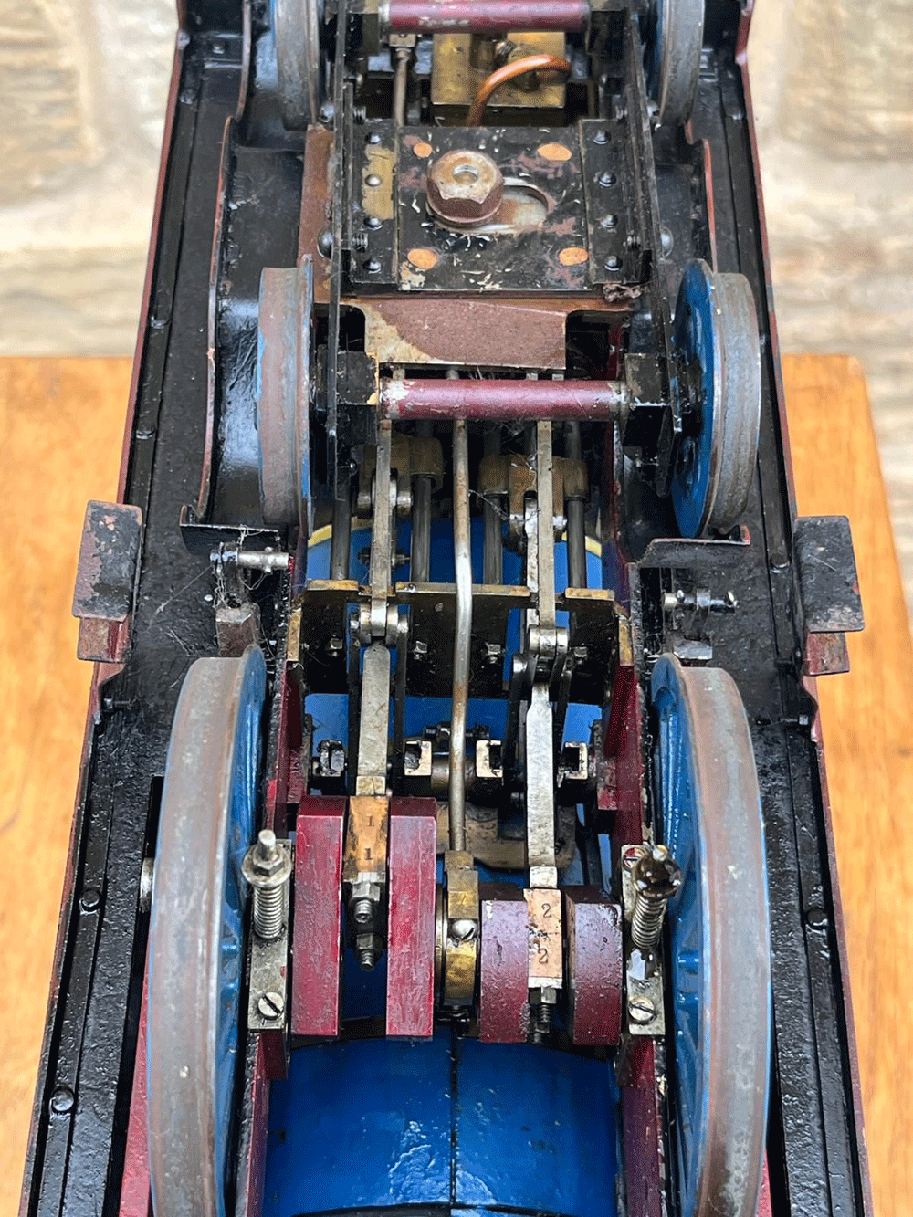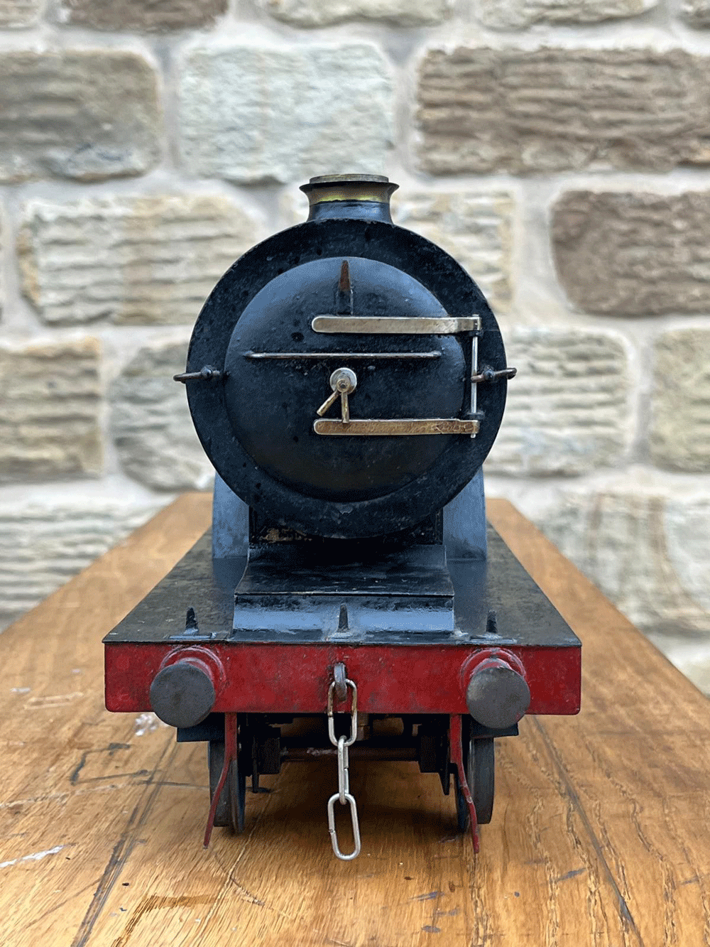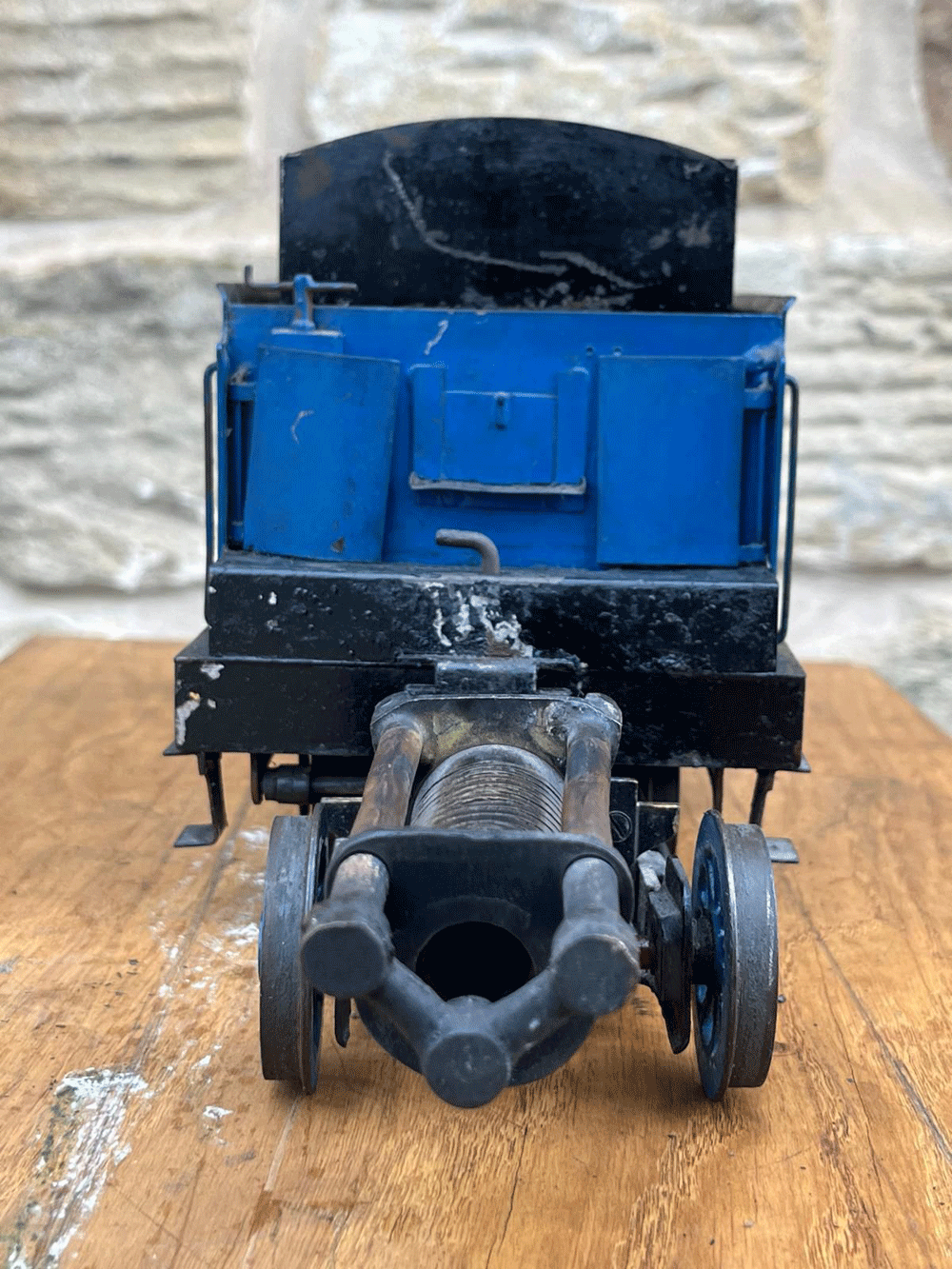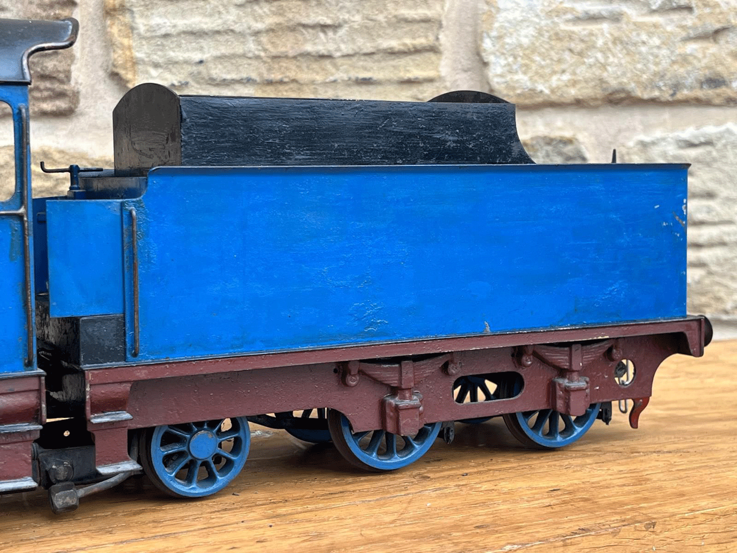 This is a well documented and historic spirit fired model and she is recorded as being the first 2.5" gauge locomotive to pull an adult passenger in 1922 (although our research suggests this to be apocryphal). Its an unusual loco, the tender has two fixed rear wheels, and is then articulated through a bogie that forms the leading tender wheelset and the rear wheel of the locomotive. The works plate reads ‘Radford Works 1922’.