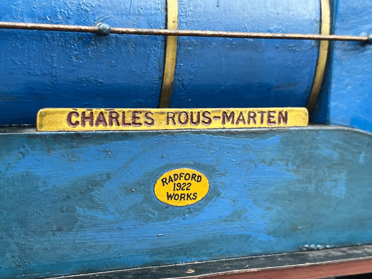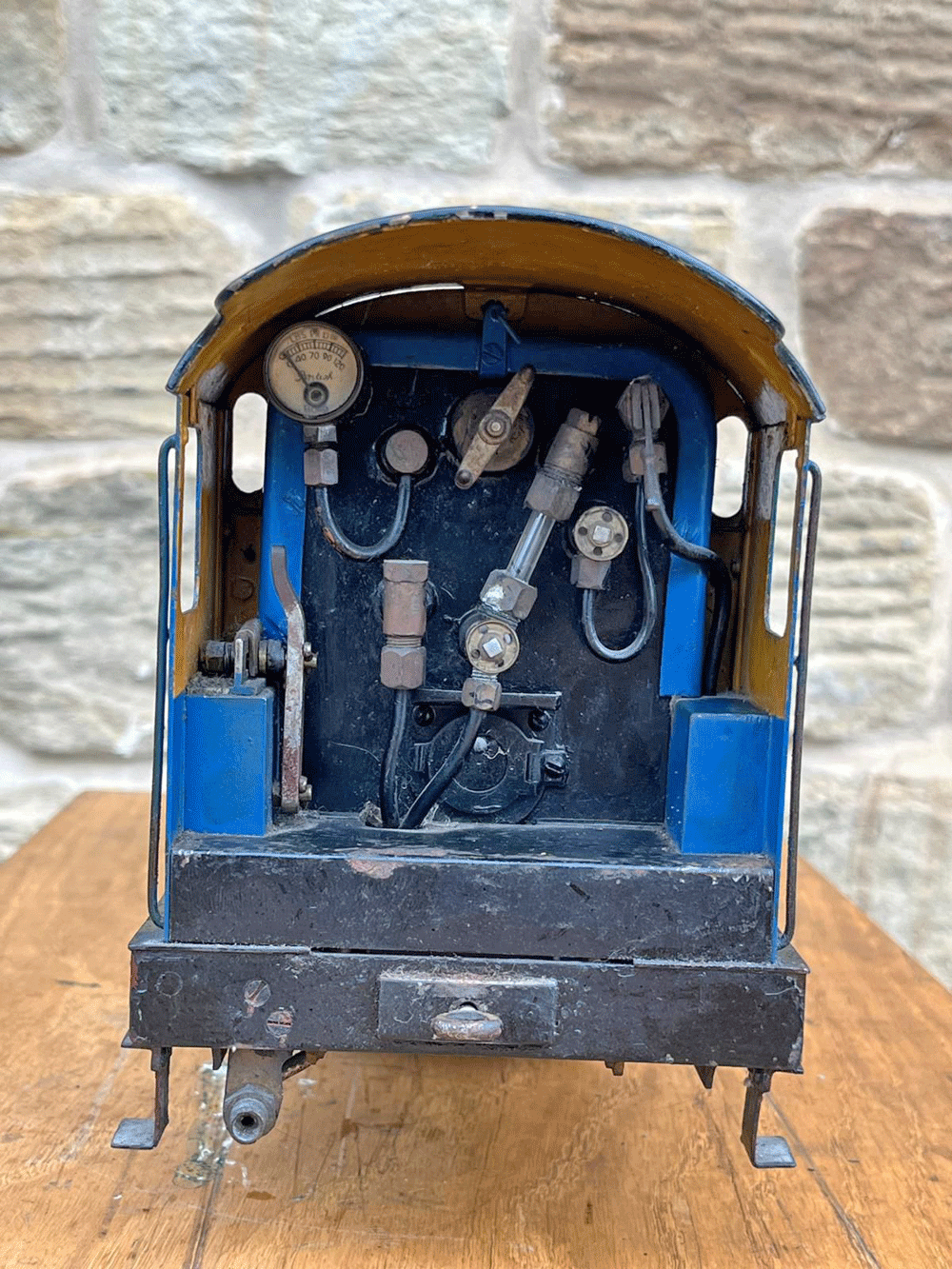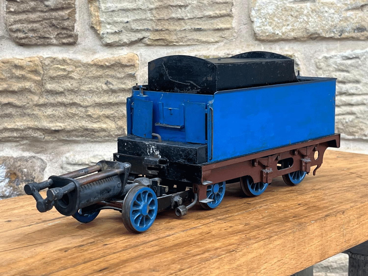 This is a well documented and historic spirit fired model and she is recorded as being the first 2.5" gauge locomotive to pull an adult passenger in 1922 (although our research suggests this to be apocryphal). Its an unusual loco, the tender has two fixed rear wheels, and is then articulated through a bogie that forms the leading tender wheelset and the rear wheel of the locomotive. The works plate reads ‘Radford Works 1922’.