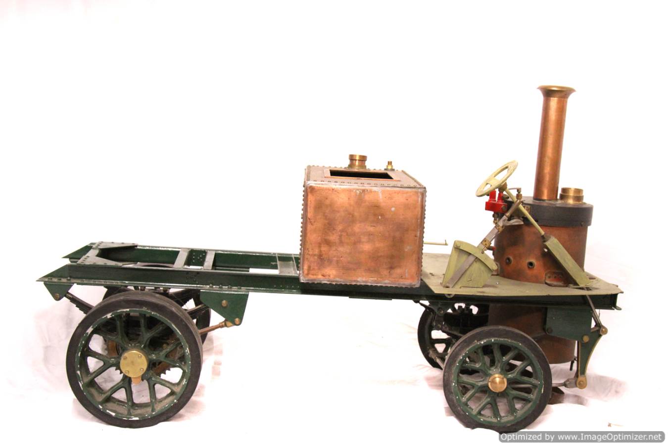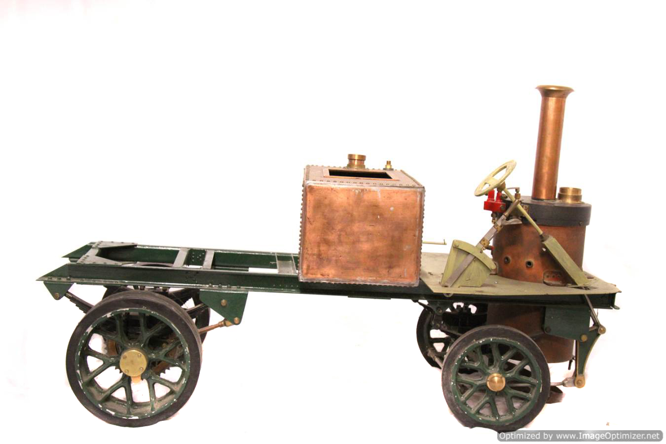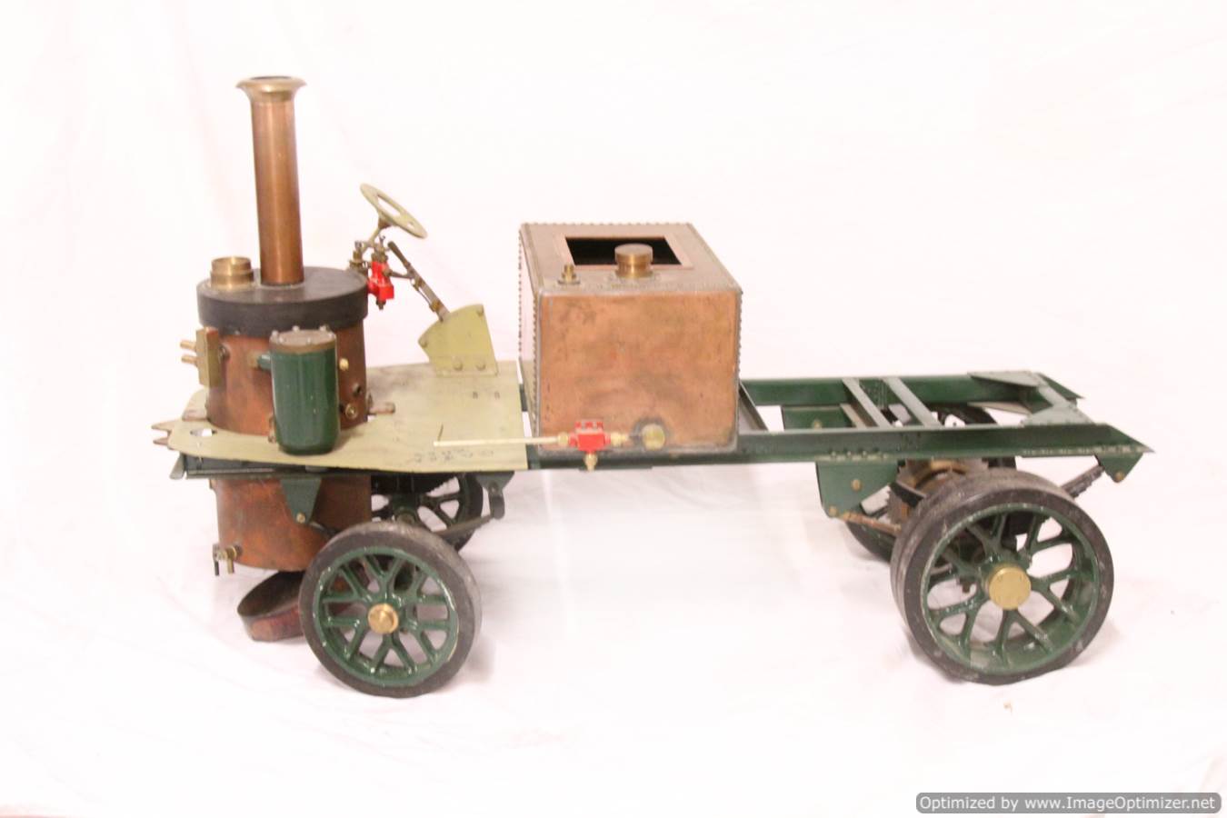 Available again before she even left the building due to a change of direction for the chap we were holding it for,..... here we have another part built 2" scale Clayton Undertype lorry. The boiler is brand new and silver soldered copper,..... and looks very neat and sound to us. The rest, as you can see is nicely made. The frame and bottom end is pretty much complete, with a nice job done on the springs, frame and wheels. There's a nice start made on the engine too, the pistons are in, as are the connecting rods and crank. There's a start made on the valve gear, and essentially a lot of the complicated work done. There's still a decent way to go before she's a finished model, but it's certainly a good start for less than the price of the new boiler.