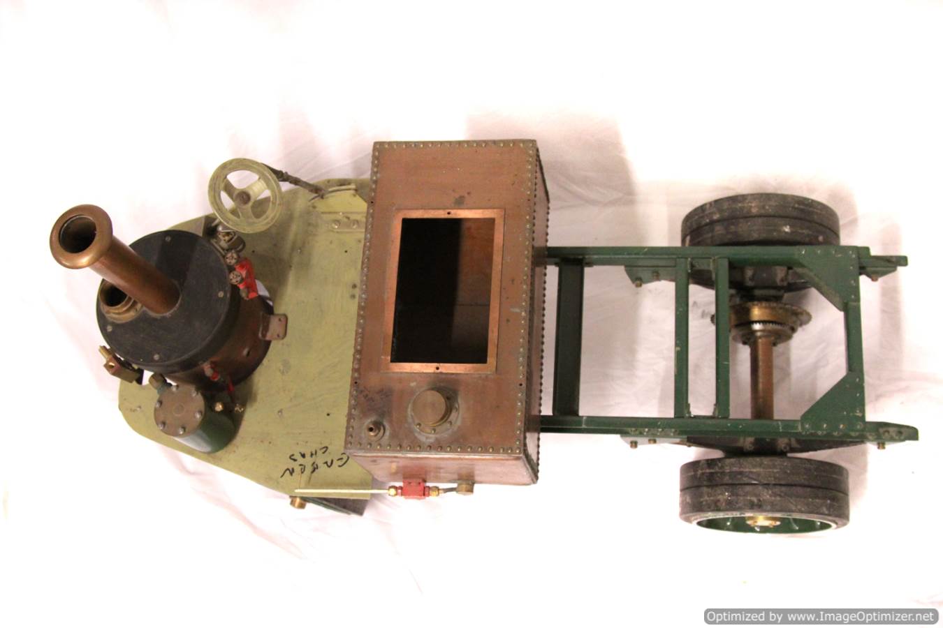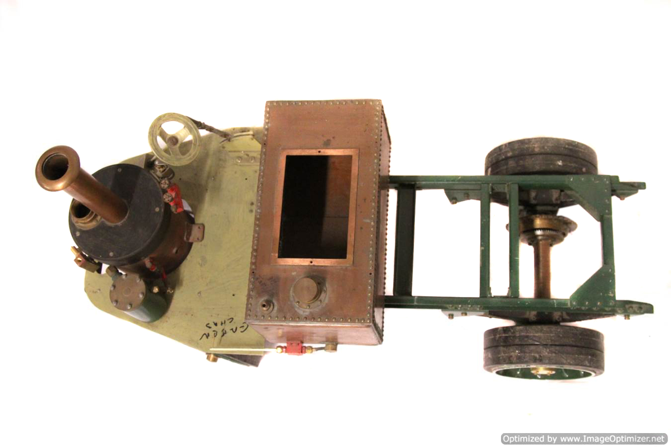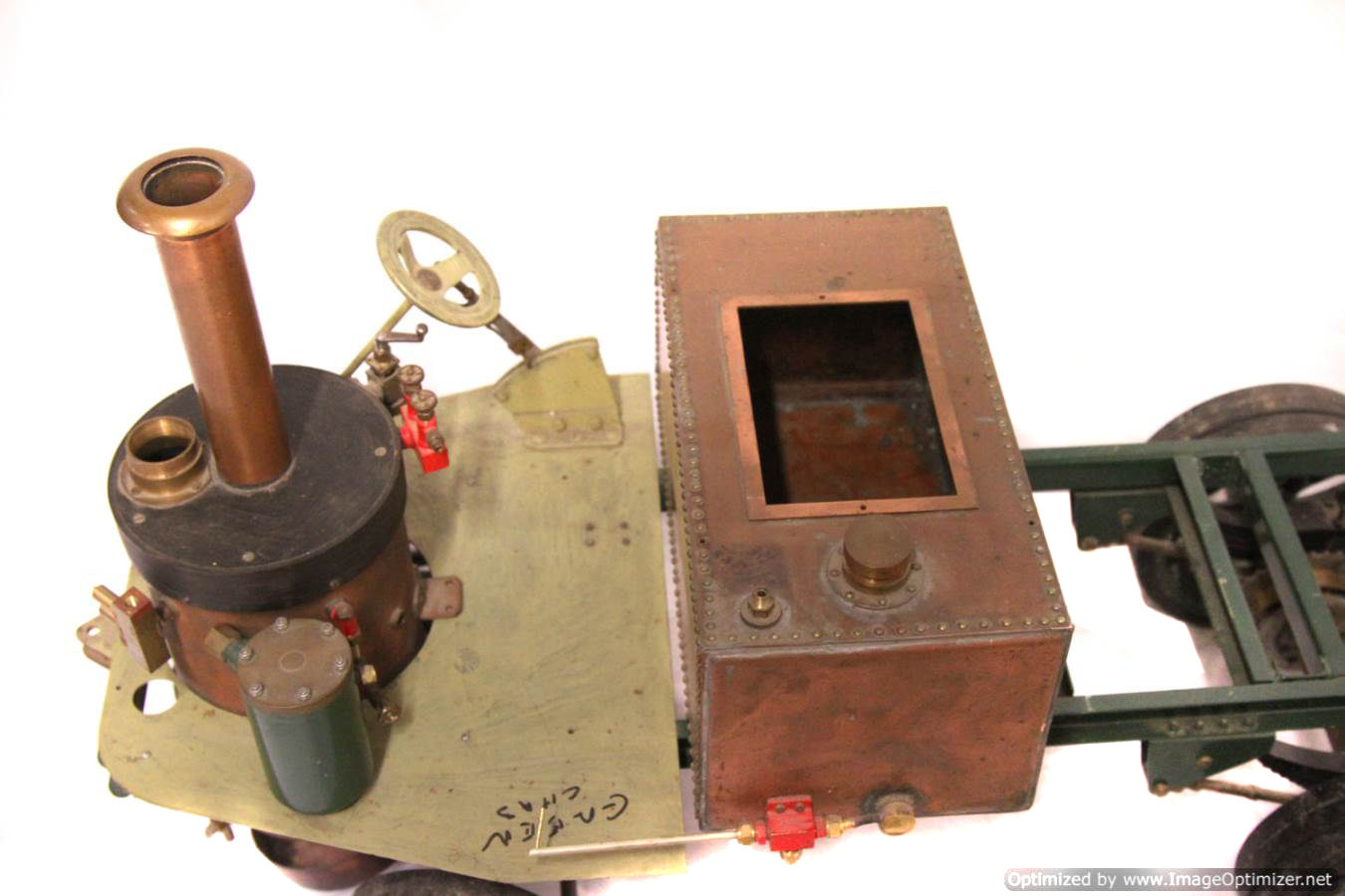 Available again before she even left the building due to a change of direction for the chap we were holding it for,..... here we have another part built 2" scale Clayton Undertype lorry. The boiler is brand new and silver soldered copper,..... and looks very neat and sound to us. The rest, as you can see is nicely made. The frame and bottom end is pretty much complete, with a nice job done on the springs, frame and wheels. There's a nice start made on the engine too, the pistons are in, as are the connecting rods and crank. There's a start made on the valve gear, and essentially a lot of the complicated work done. There's still a decent way to go before she's a finished model, but it's certainly a good start for less than the price of the new boiler.