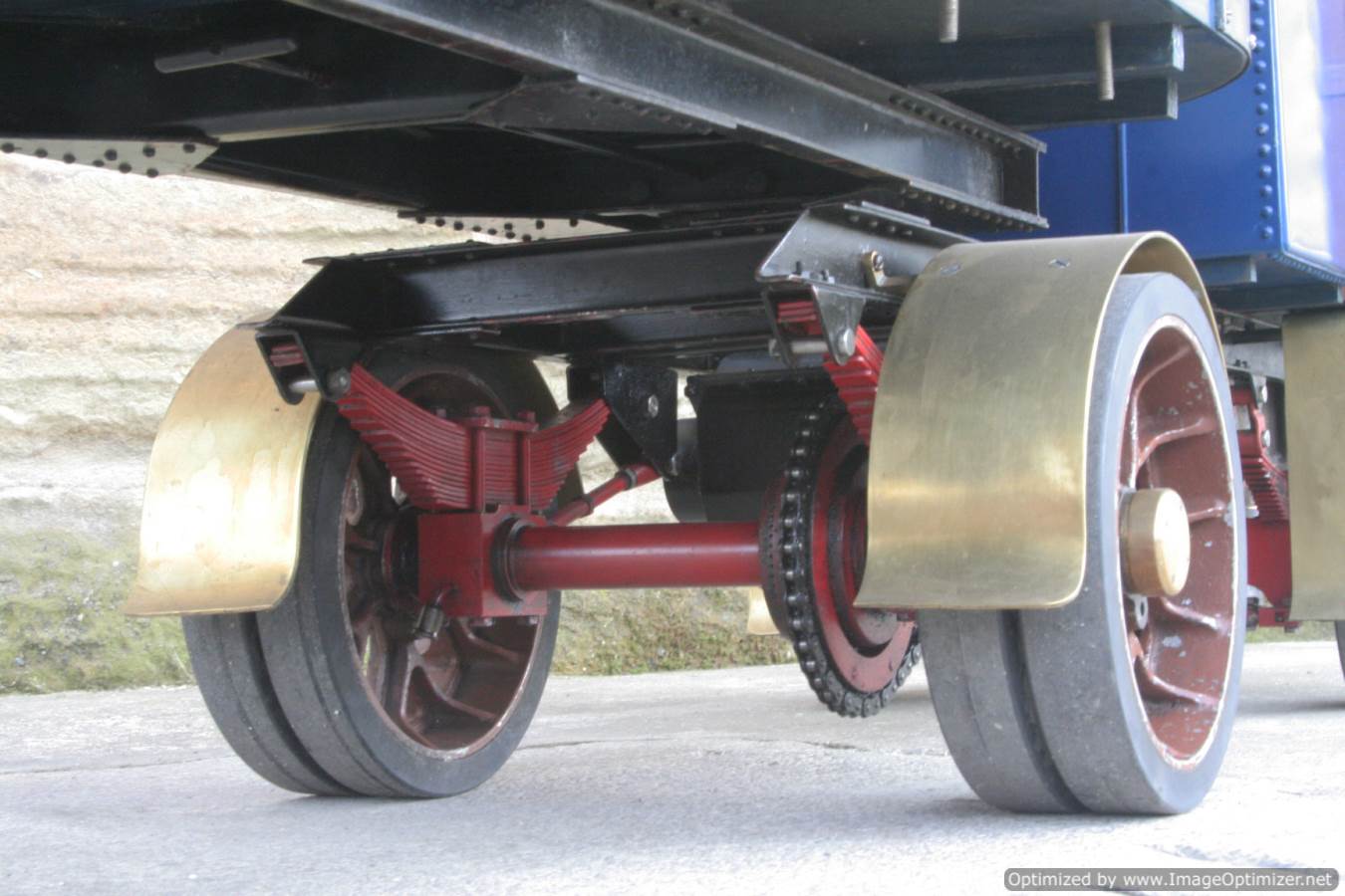Here we have a nicely made 2" Clayton steam wagon. It's the usual Articulated version, and although finished and running, the previous owner has started removing the paint from the lorry in order to freshen it up. Hence the water tank is in fresh blue, the trailer still in the original darker blue, and the cab in bright brass.