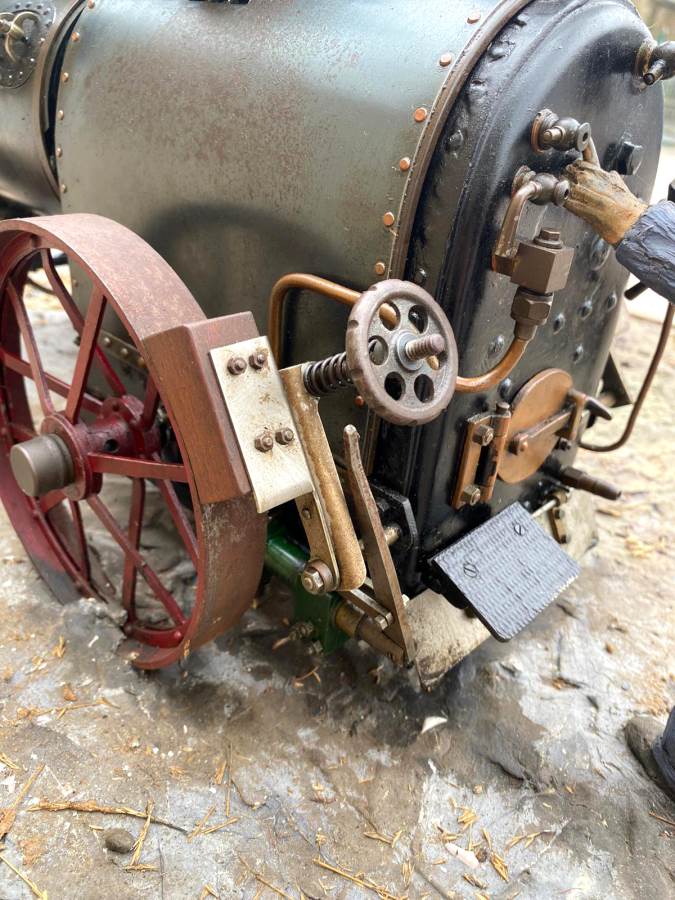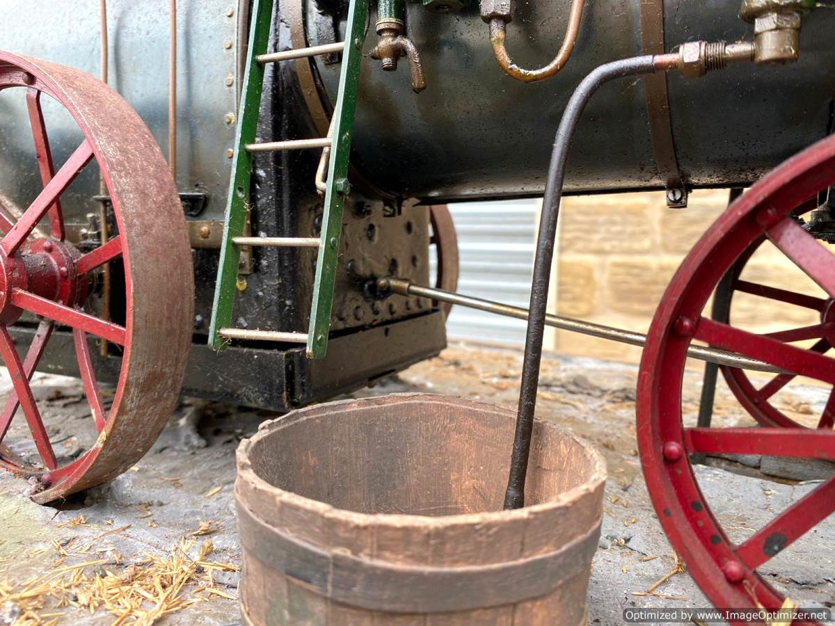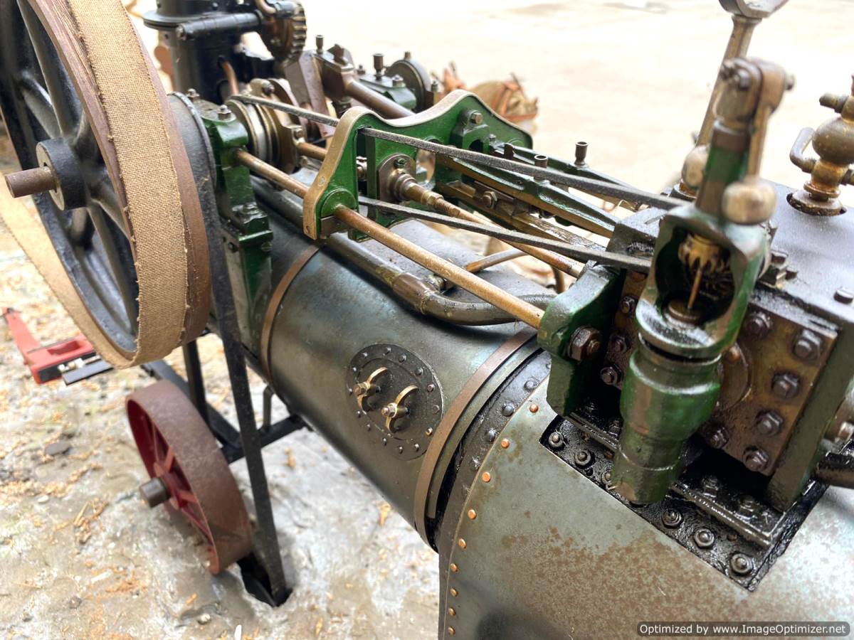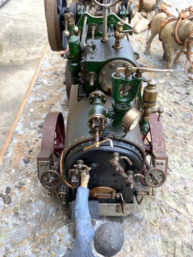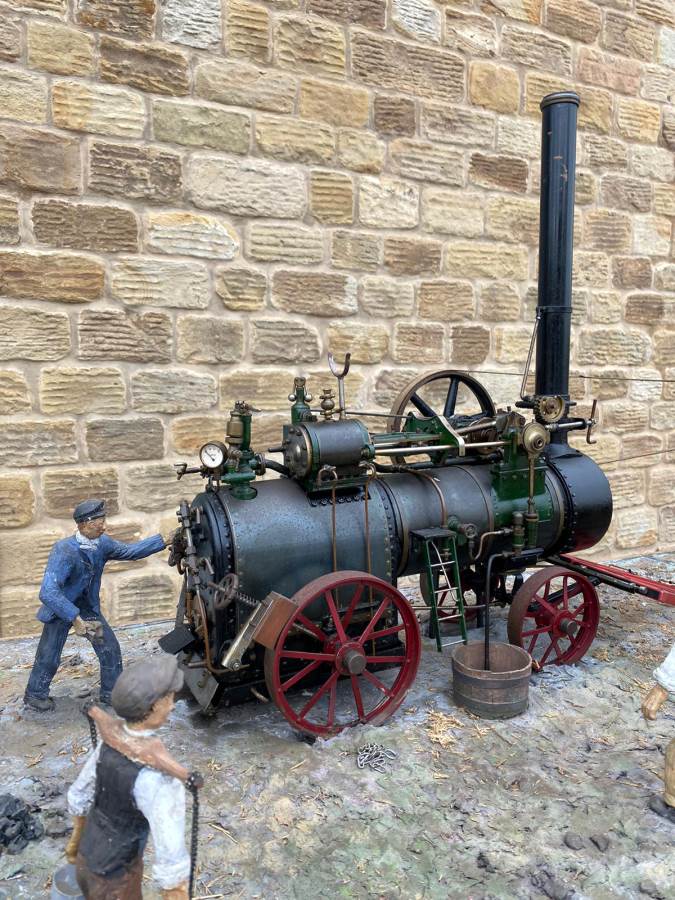 Here we have a superb and everso-slightly massive 'working' diorama! Firstly there's a 2" Robey portable. Built as a working model, although currently unsteamed, it has been set up on this display with a rubber drive belt through the ground to a hidden electric motor so that it can be turned over at the flick of a switch. The boiler is copper, nicely flanged, strongly made, riveted all over and then there's an extremely liberal application of solder caulking all over it on the inside, probably suggesting that a sensible working pressure would be around the 75 - 80 psi mark. Machining work is nice and tight and everything moves just as well as it should.