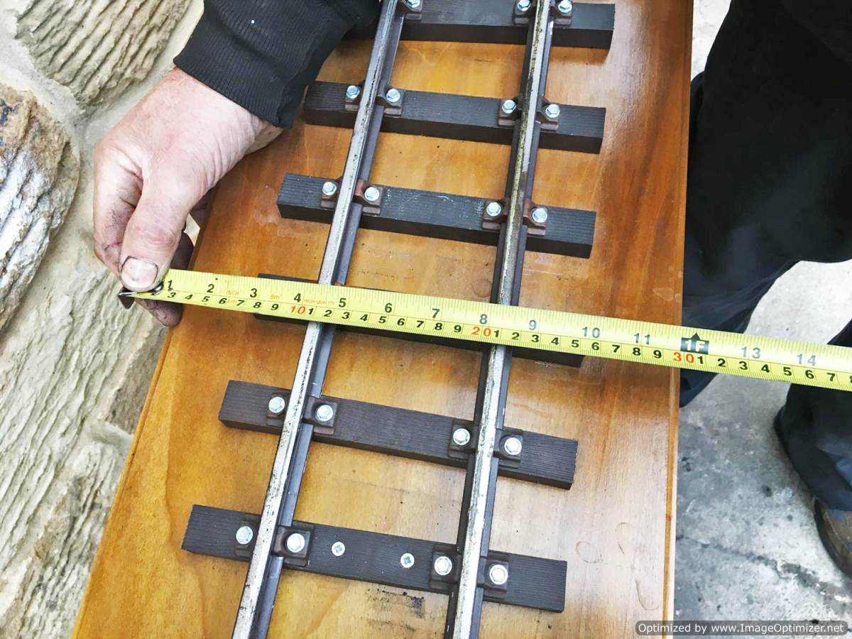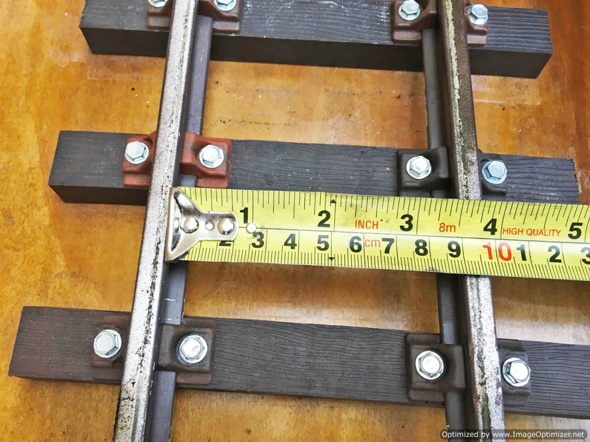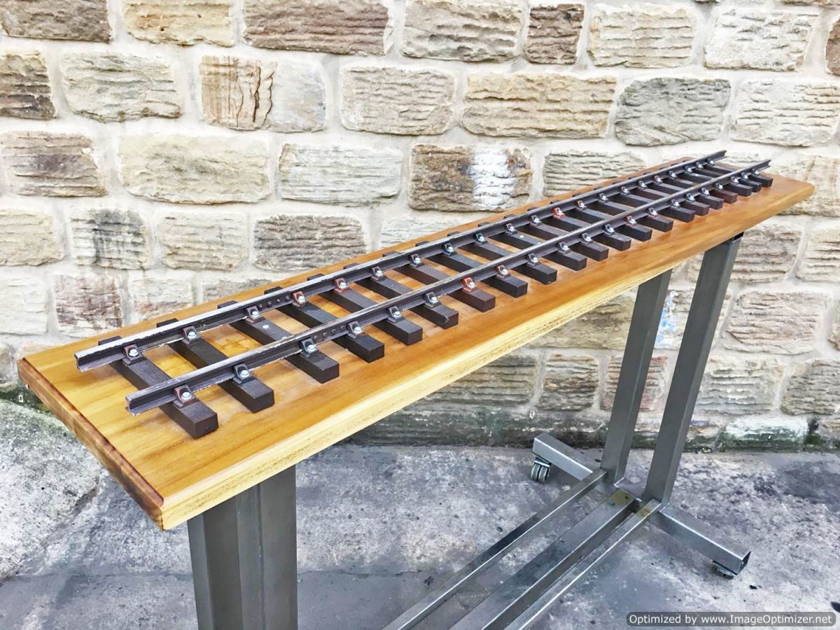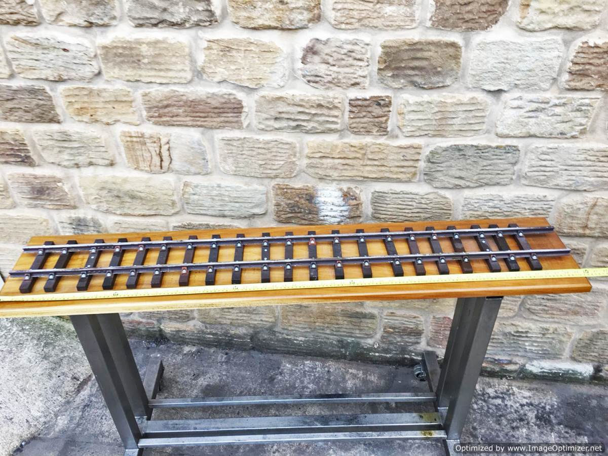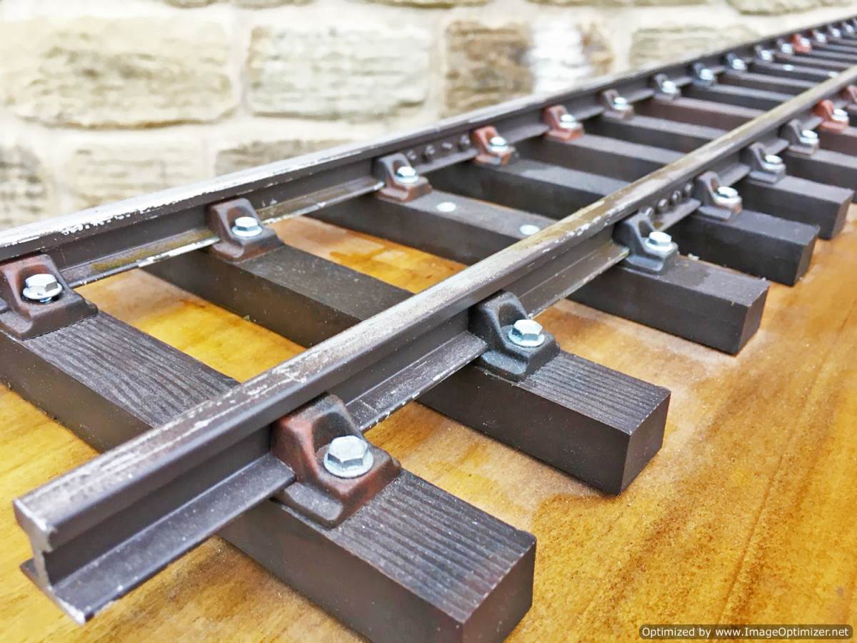Here we have a simple and tidy 3 1/2" gauge display track mounted on a nice wooden plinth. The sleepers are PNP plastic ones, as are the chairs, the rails aluminium.