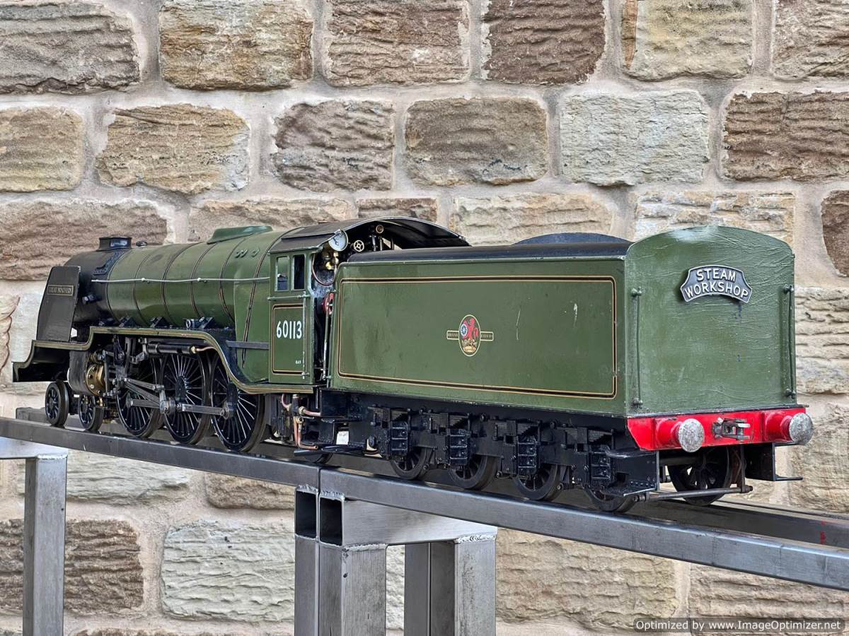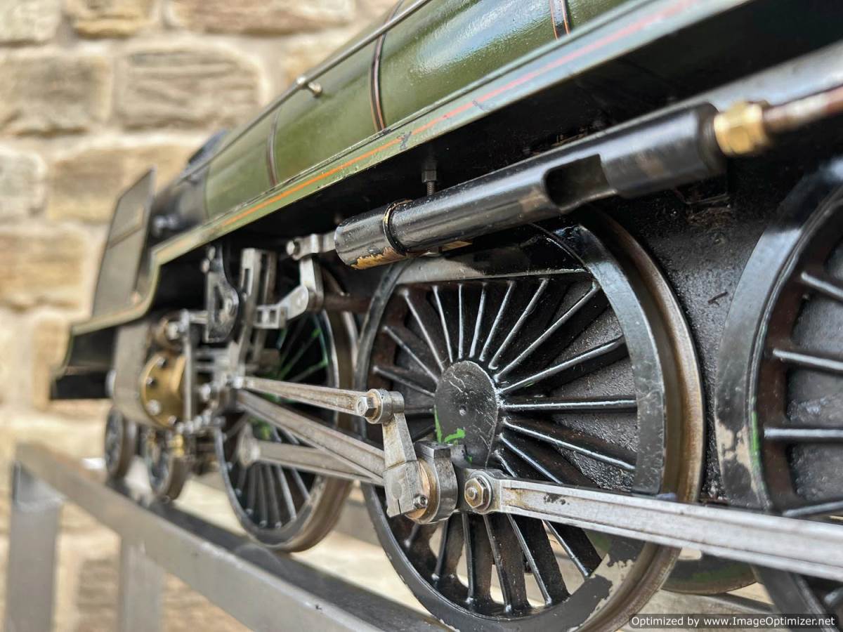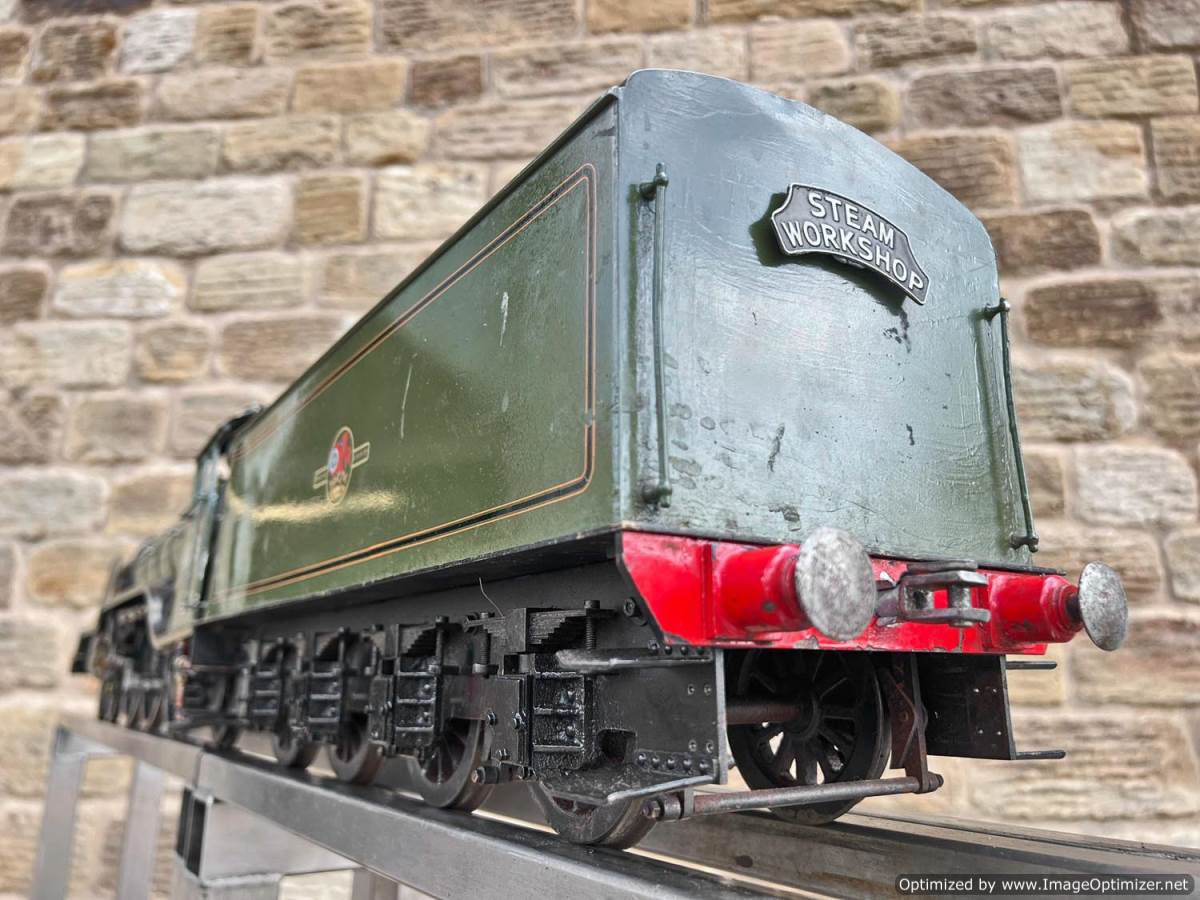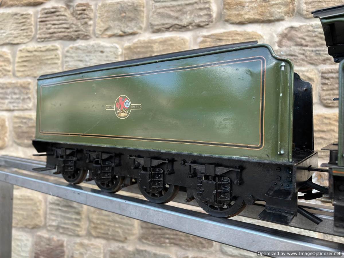 Here we have a 3 1/2" gauge Thompson A1/1 built to the LBSC well respected 'Heilan Lassie' design. A full 3 cylinder model with a large firebox and boiler, the Heilan Lassie makes a really free steaming and smooth running model that generally is able to punch above it's weight for a 3 1/2" gauge model. Indeed it is rather longer than the average 3 1/2" model particularly with the 8 wheel tender, she's longer than any other 3 1/2" standard gauge pacific.