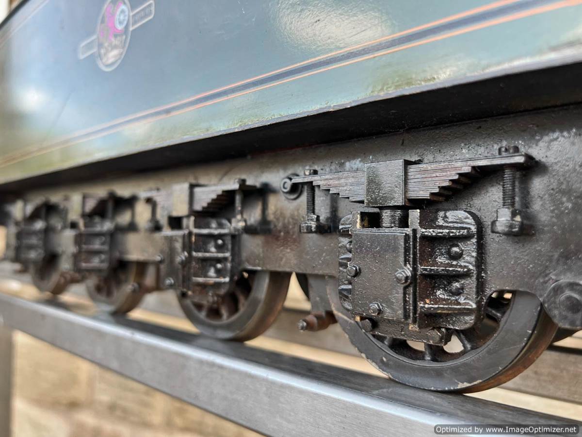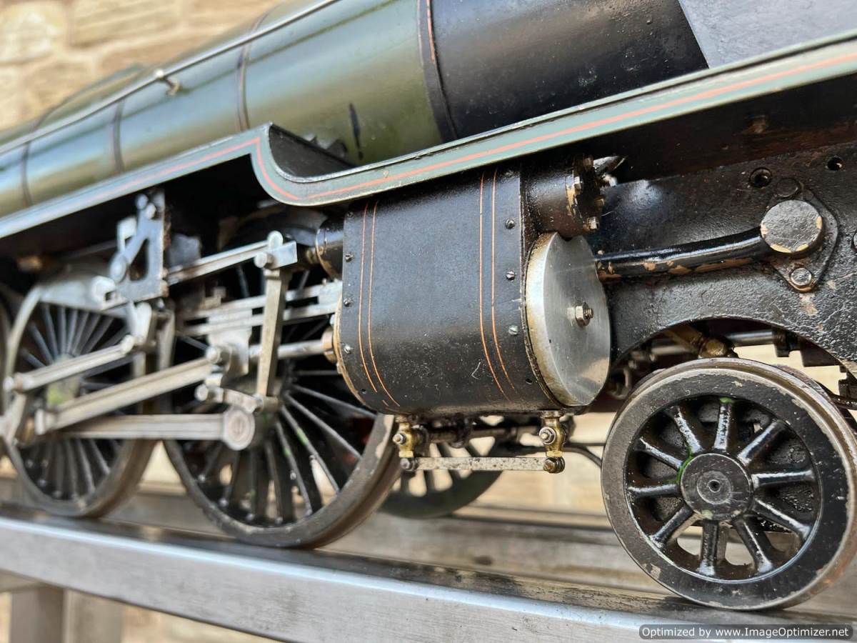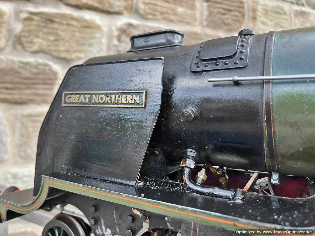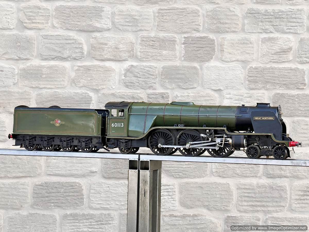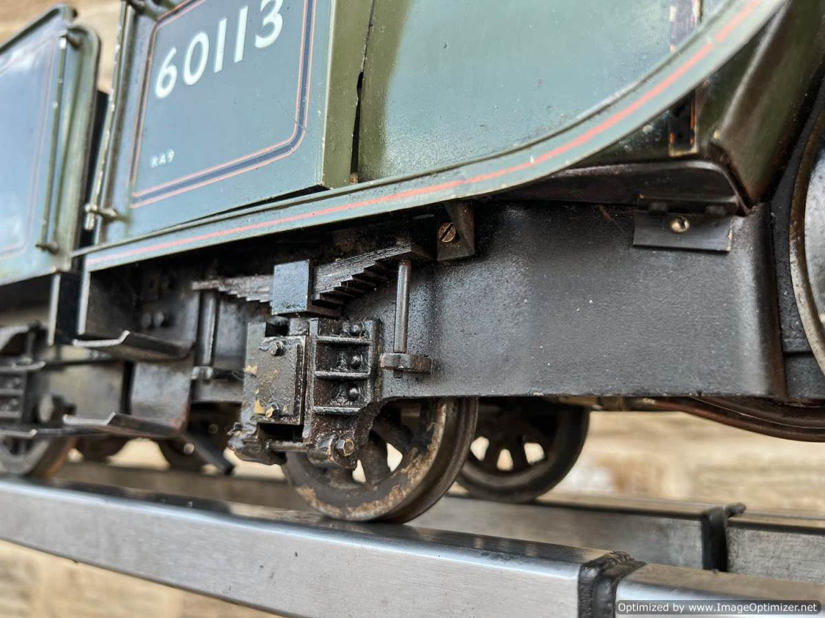 Here we have a 3 1/2" gauge Thompson A1/1 built to the LBSC well respected 'Heilan Lassie' design. A full 3 cylinder model with a large firebox and boiler, the Heilan Lassie makes a really free steaming and smooth running model that generally is able to punch above it's weight for a 3 1/2" gauge model. Indeed it is rather longer than the average 3 1/2" model particularly with the 8 wheel tender, she's longer than any other 3 1/2" standard gauge pacific.