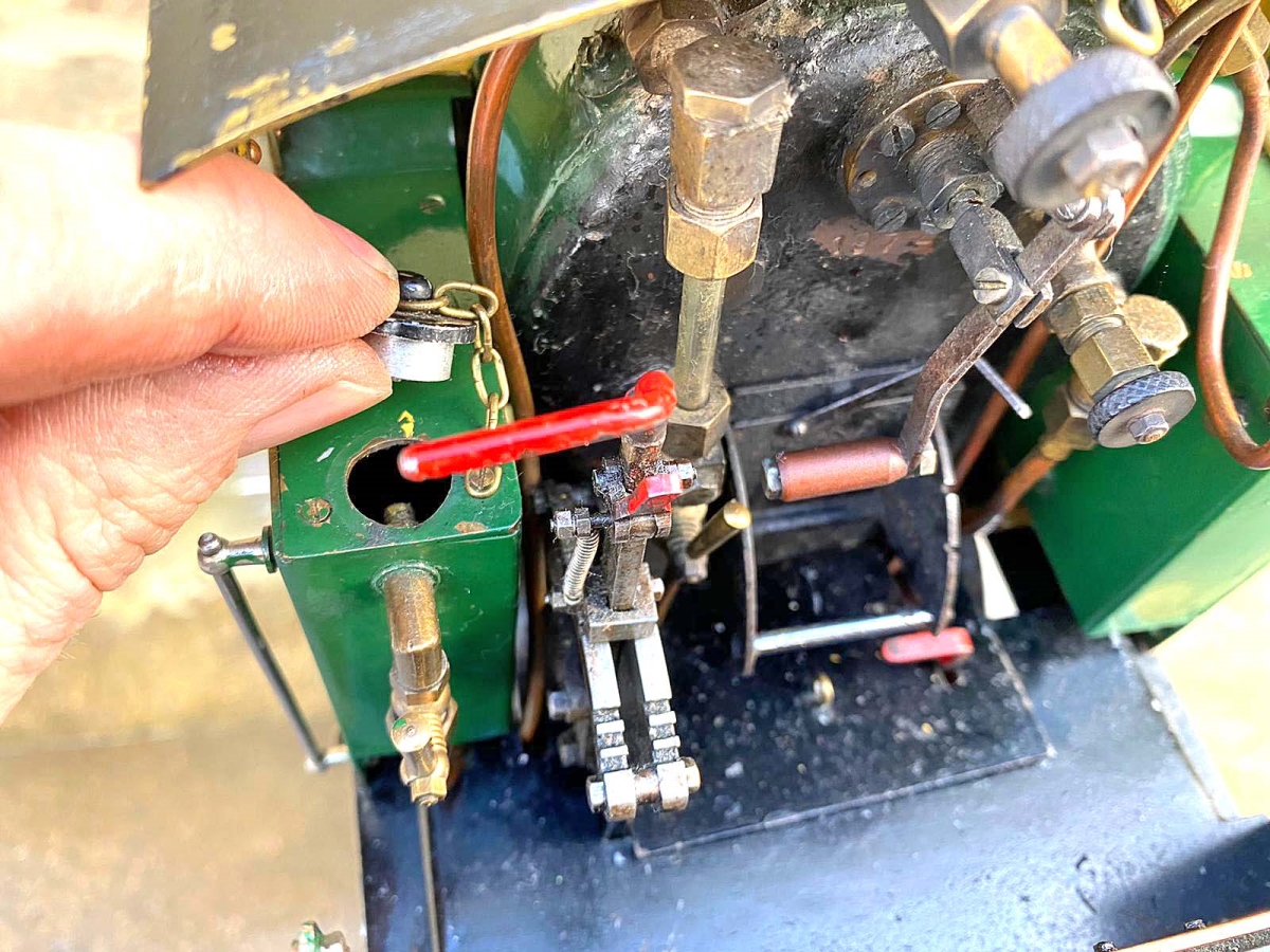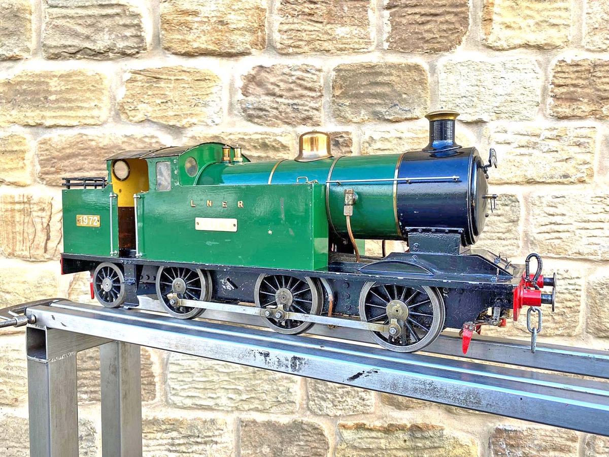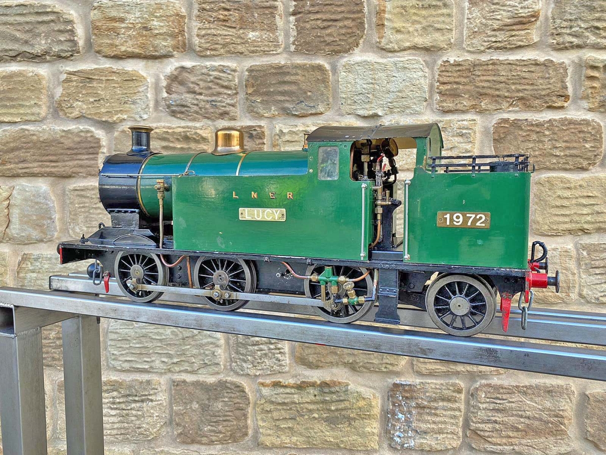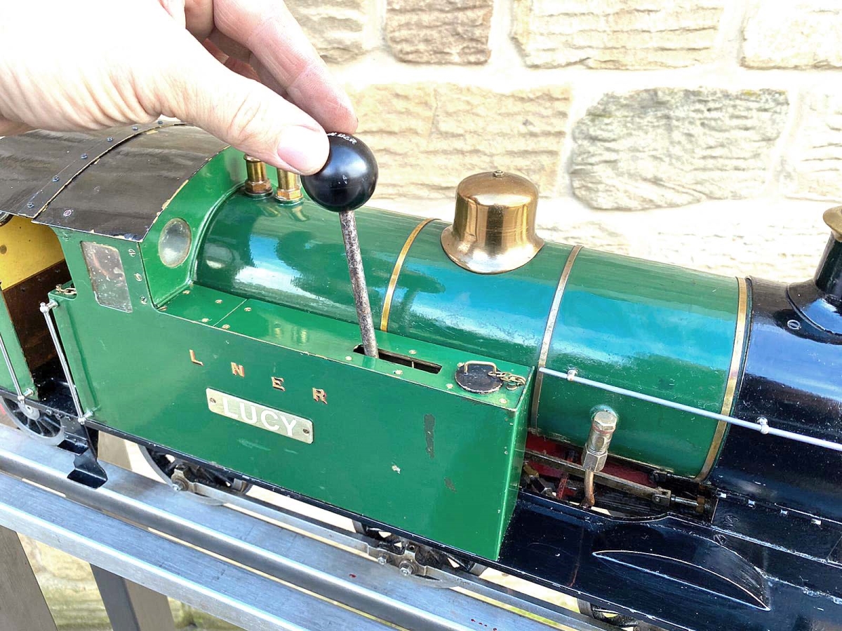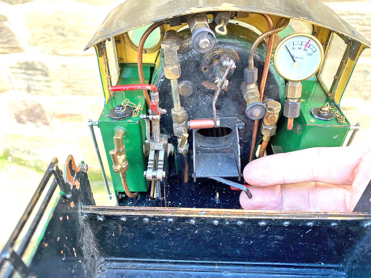 Here we have a nice little example of a 3 1/2" gauge LBSC 'Mona' 0-6-2.  It's clearly been enjoyed and as a result is cosmetically a little scruffy around the edges, but it's actually a crisply made and well engineered example.  There are several unusual touches where the builder has deviated from the LBSC drawings and 'gone his own way', which is quite often a good sign that the builder was experienced enough to have the confidence to do so.  The regulator is a push/pull type, perhaps to make it easier to control on a relatively confined footplate, and things like the lovely little filler caps on chains and the extended reverser handle and the large fire hole door mechanism show that thought has been put into the locomotives functionality for driving.