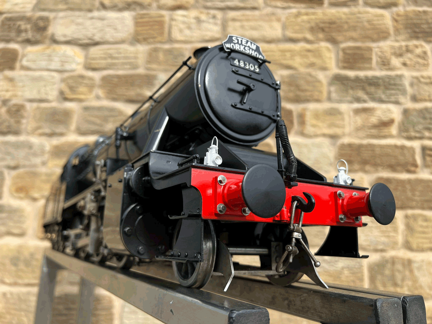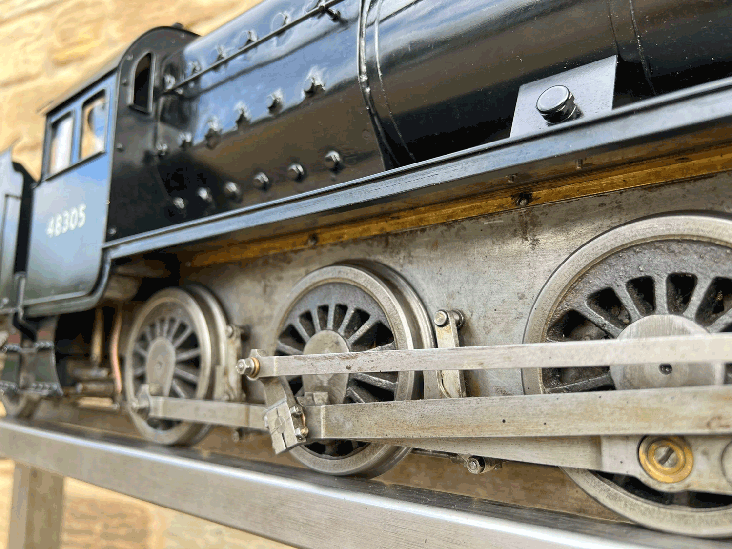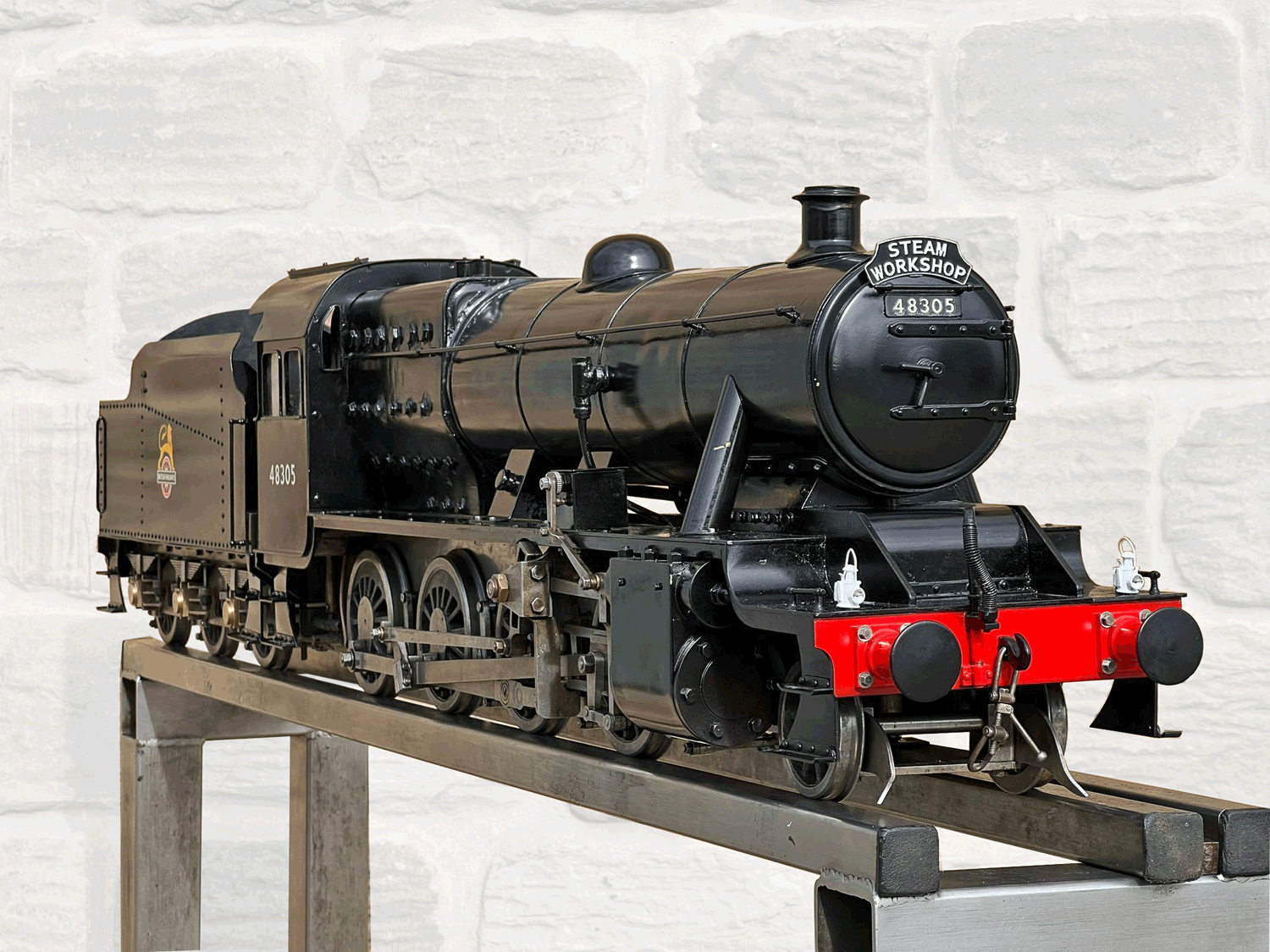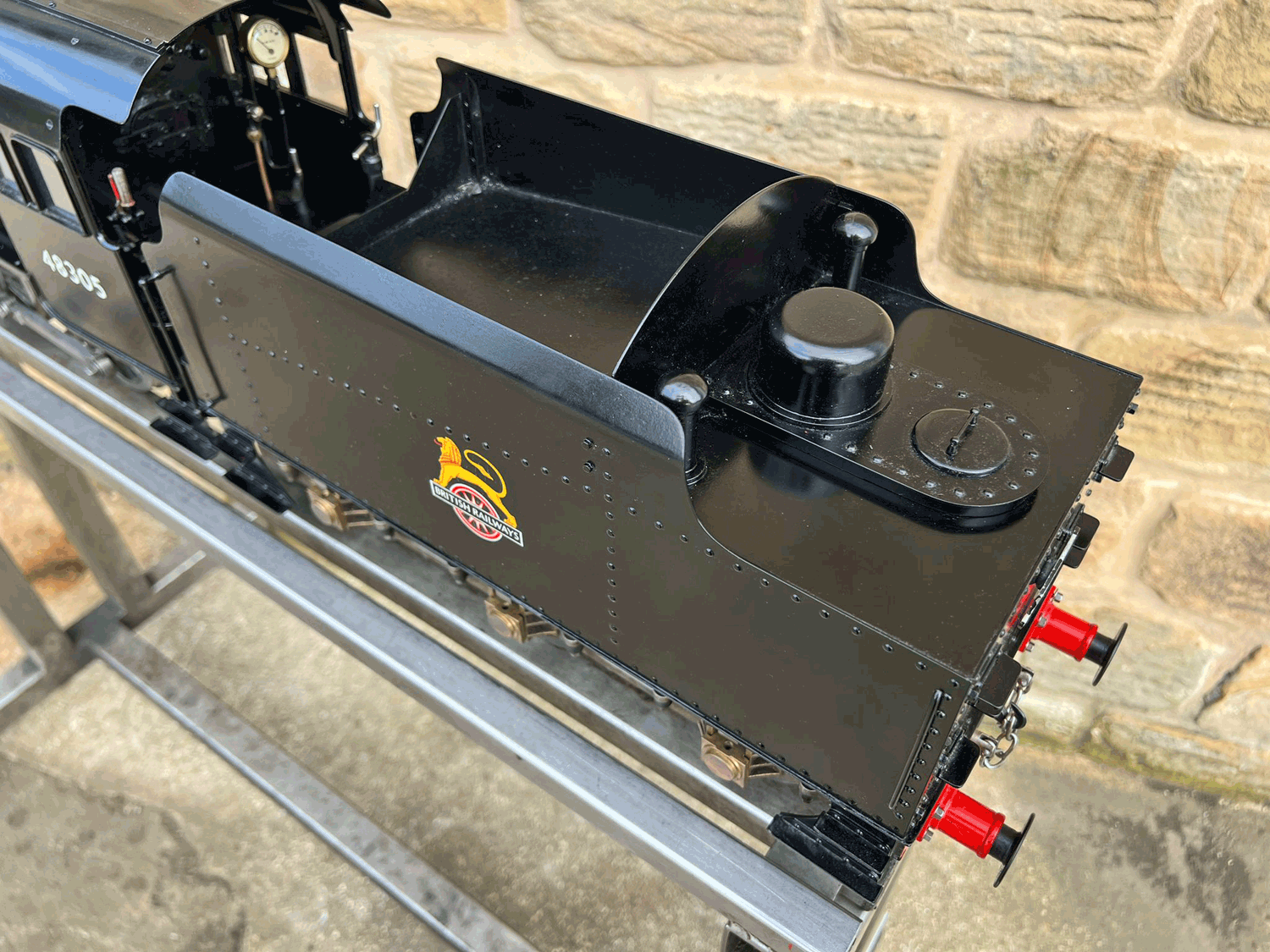 Here we have a rare beast, a 3 1/2" gauge LMS Stanier 8F. A little bit of a project for someone for this winter. We had a customer on this loco as a fully commissioned model ready to play, but when we brought it into the workshop to more thoroughly investigate and work on it, we found that several aspects were missing or not as finished as the overall impression of the loco gave. The safety valves for example have no holes in them and no internals, there's no plumbing at all done yet for the lubricator or any of the water systems. It looks like what's been done is tidy and certainly the paint finish is also neat, implying a bit of care has been taken, but there was a bit too much work left to do in order to get this one over the finish line than we ultimately have time for in our workshops. As a result, the decision was taken to apologise to the customer, and list the model as a project for a much reduced price instead.