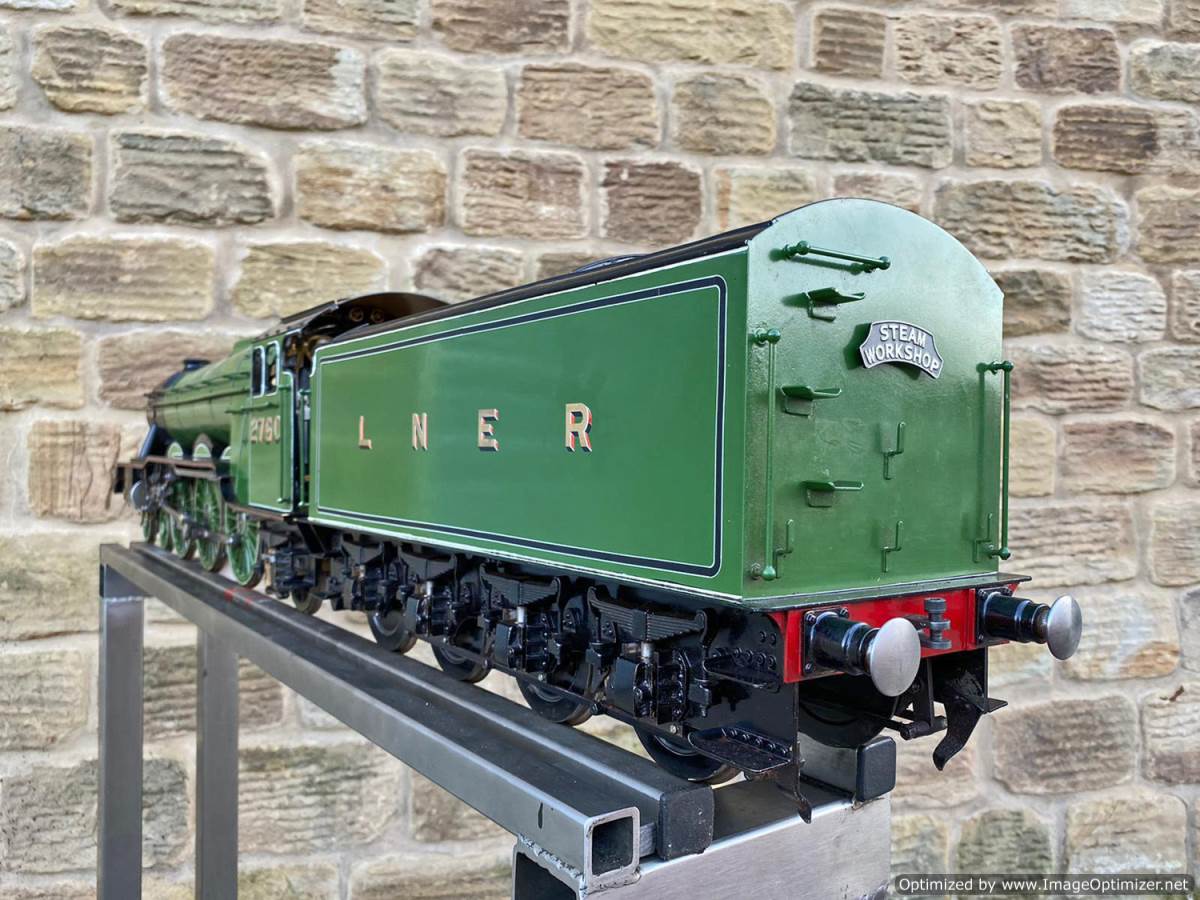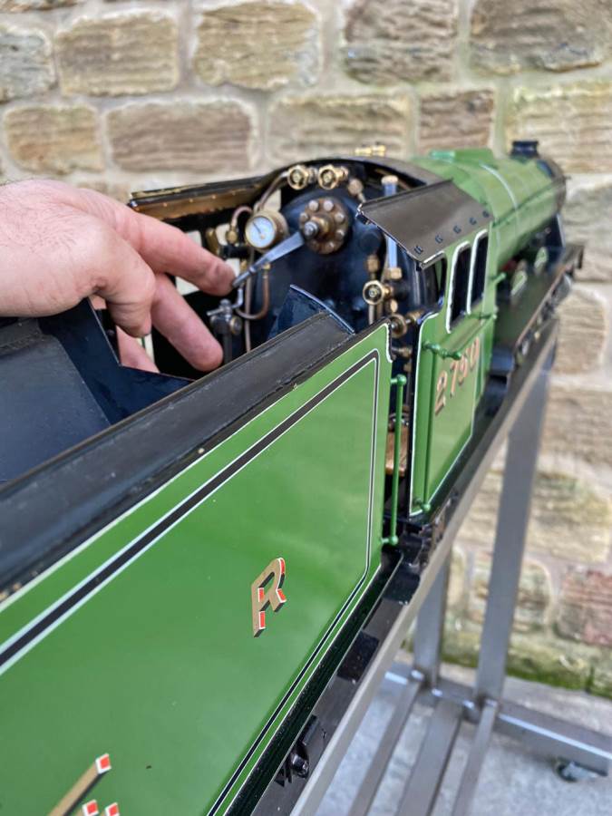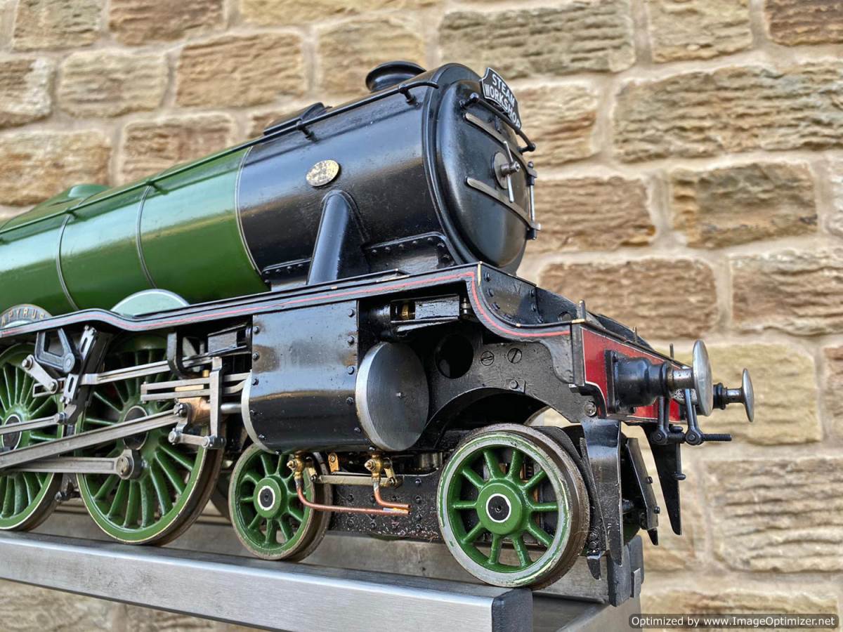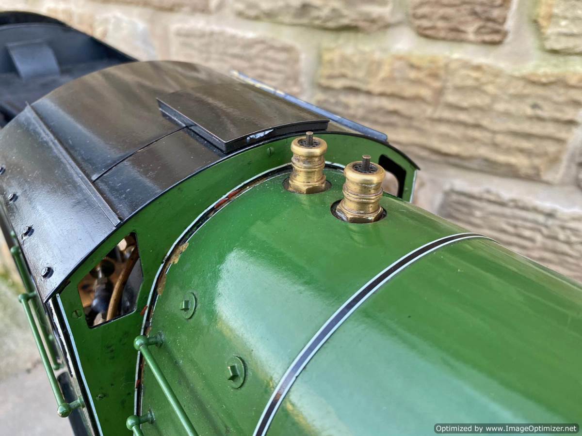 The boiler is silver soldered copper and of course comes fully tested and ready to play. Lubrication is displacement with a reservoir under the footplate floor and a sight feed in the cab. There is an injector fitted as well as a twin ram axle pump squeezed between the frames along with that third cylinder,..... and a hand pump in the tender. This is a really lovely model that runs as well as it looks. If you're after a 3 1/2" A3, then you won't find many nicer ones than this.