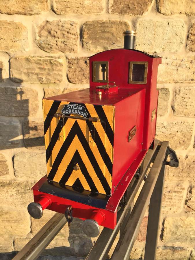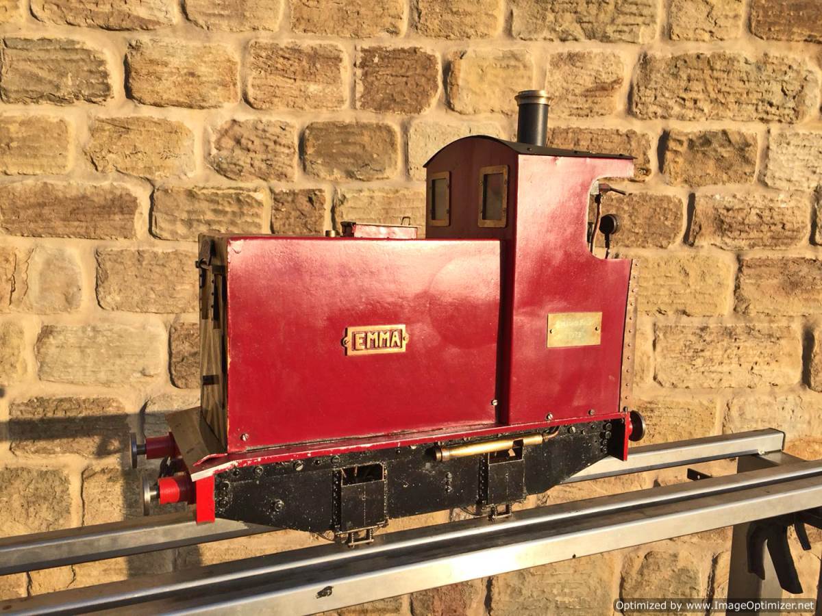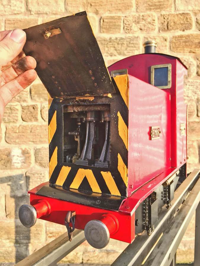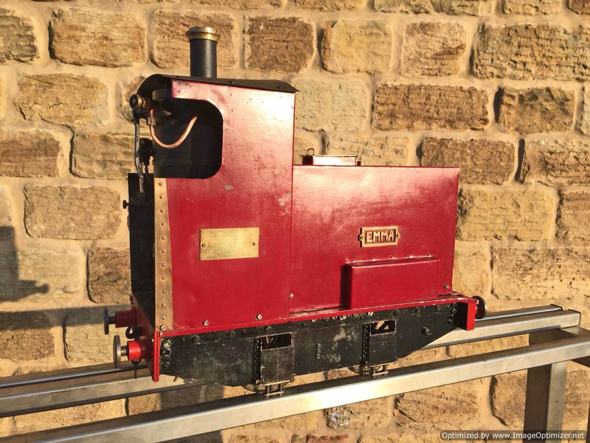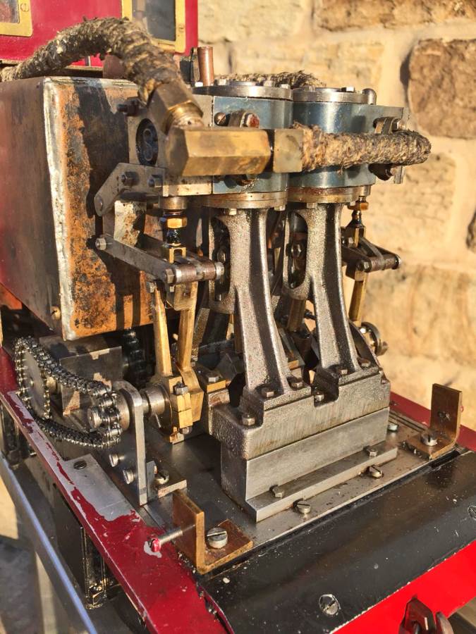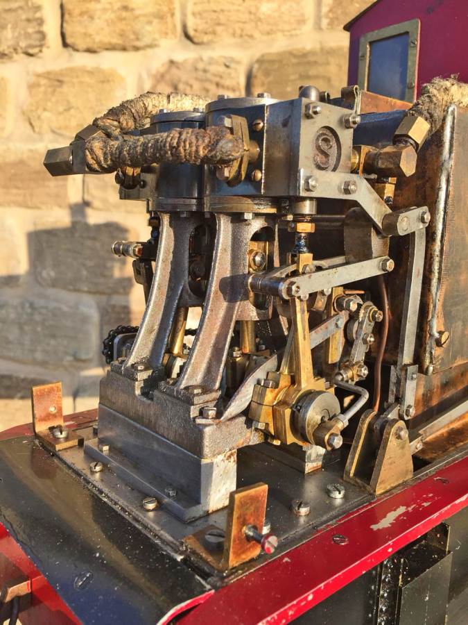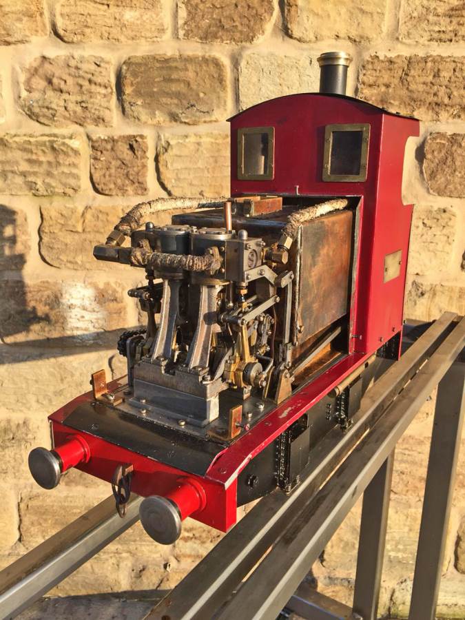 Here we have a really cool little thing! A 3 1/2" gauge vertical boilered 0-4-0 'Sentinel-esque' twin cylinder steam loco. There's a twin cylinder Stuart 10 hidden up front just as in the 5" gauge published design for a Sentinel 100hp loco 'Serena', and the boiler is also far more like the 5" loco size. Drive is through gears and chains as you can see from the axles and the engine has the fully reversable valve gear on it rather than being slip eccentric as many stationary engined locos tend to be.
