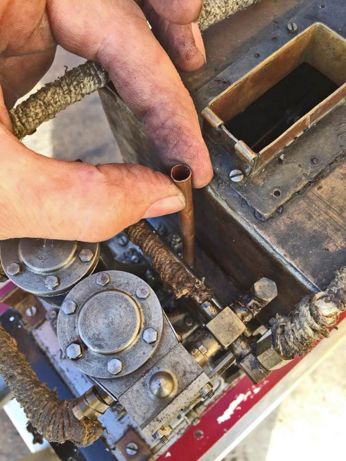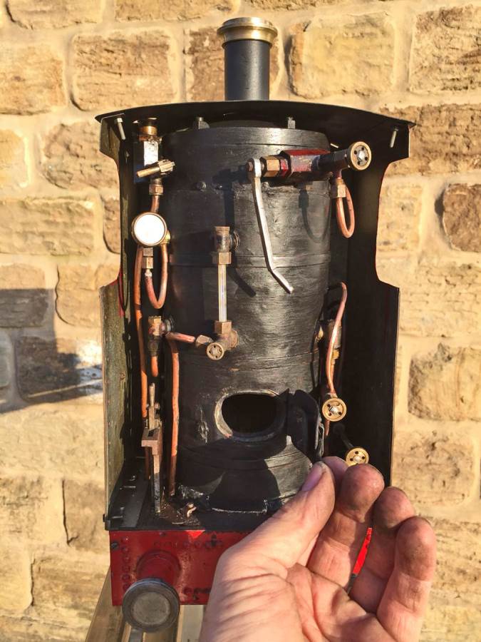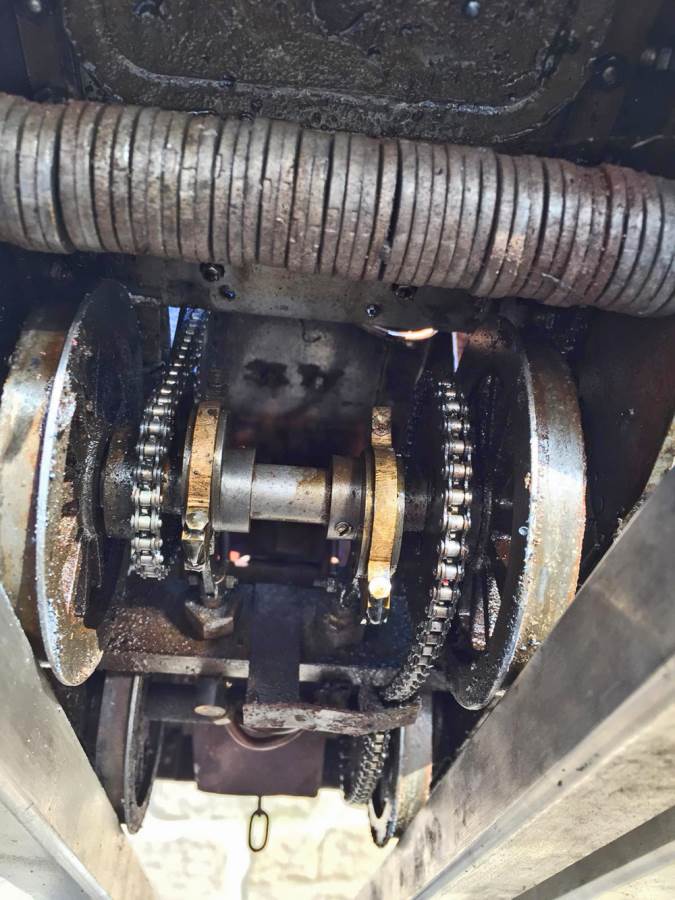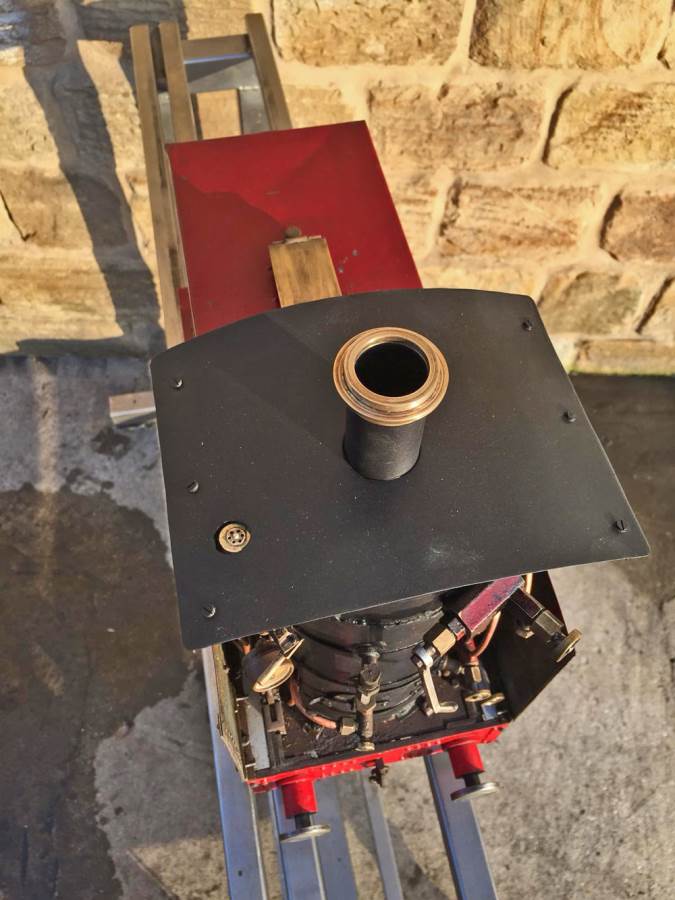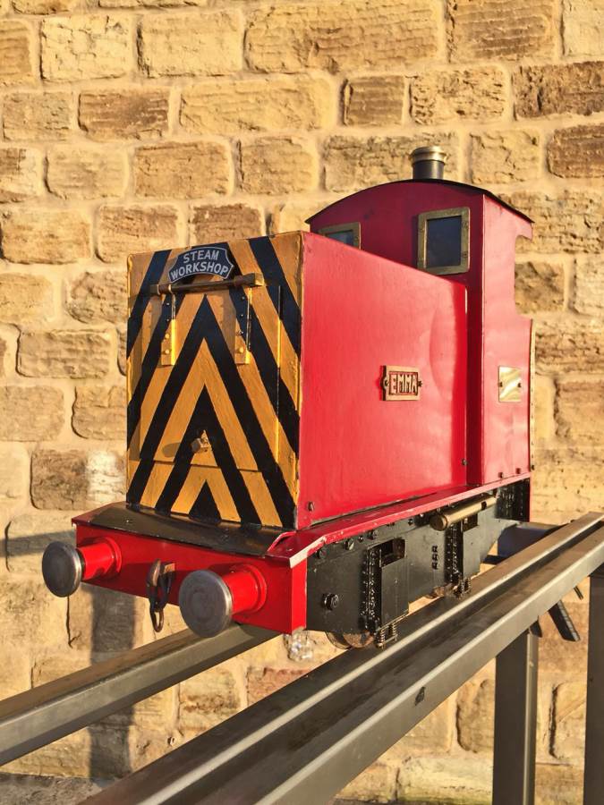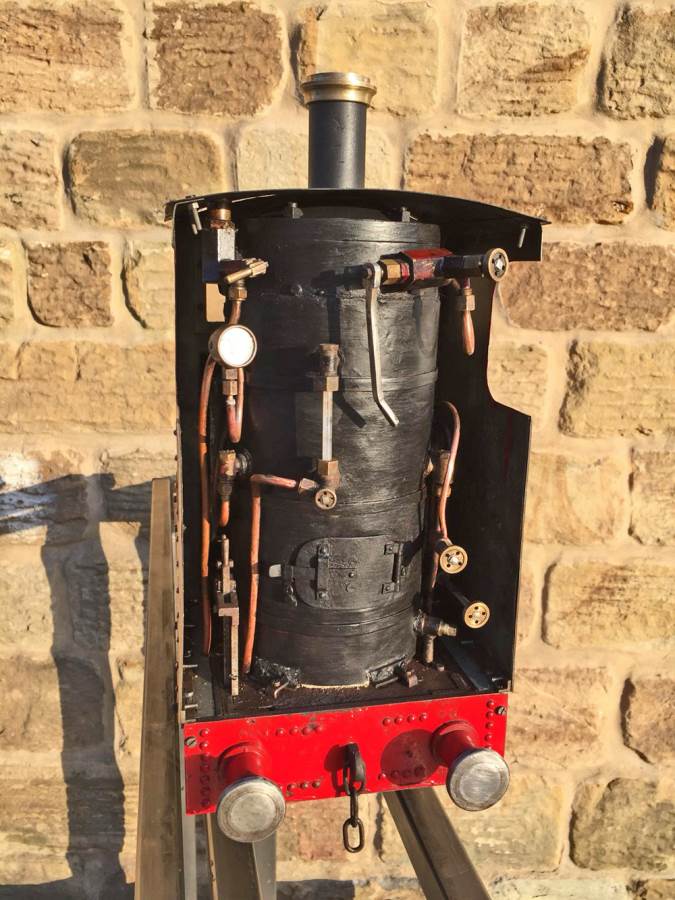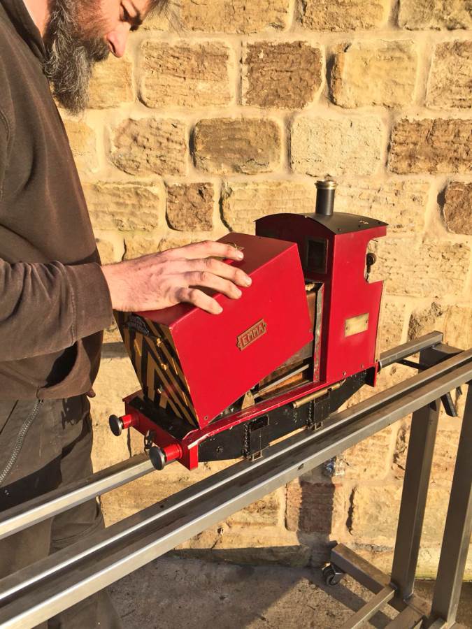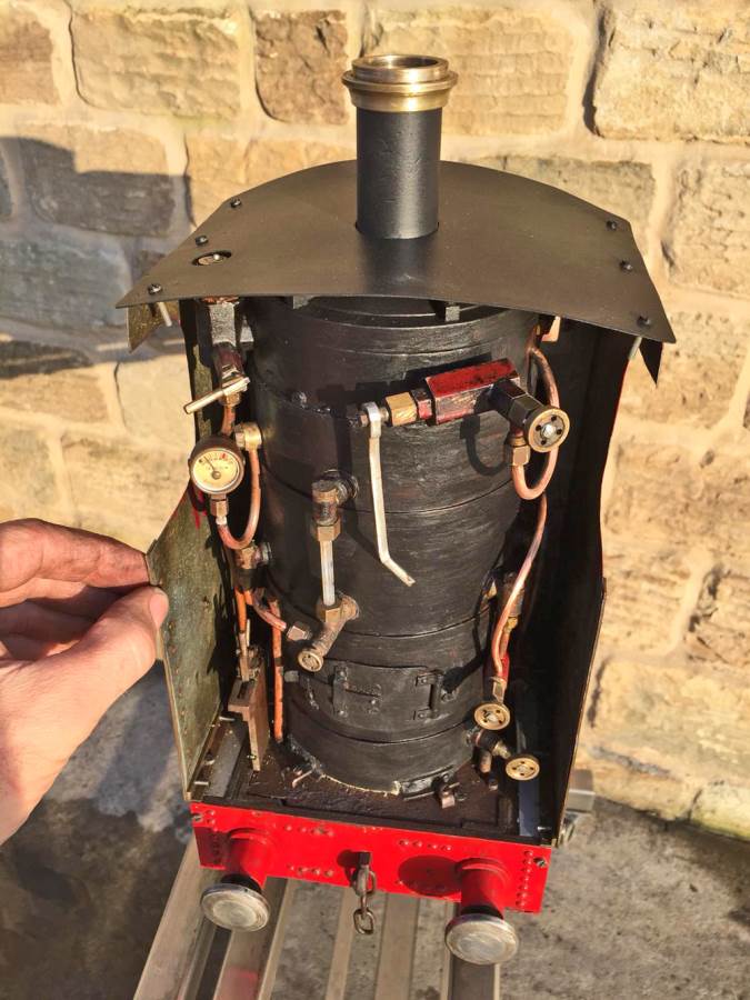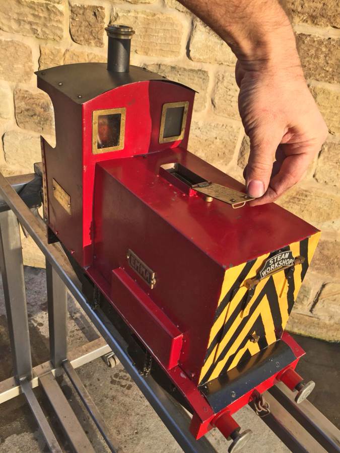 Here we have a really cool little thing! A 3 1/2" gauge vertical boilered 0-4-0 'Sentinel-esque' twin cylinder steam loco. There's a twin cylinder Stuart 10 hidden up front just as in the 5" gauge published design for a Sentinel 100hp loco 'Serena', and the boiler is also far more like the 5" loco size. Drive is through gears and chains as you can see from the axles and the engine has the fully reversable valve gear on it rather than being slip eccentric as many stationary engined locos tend to be.