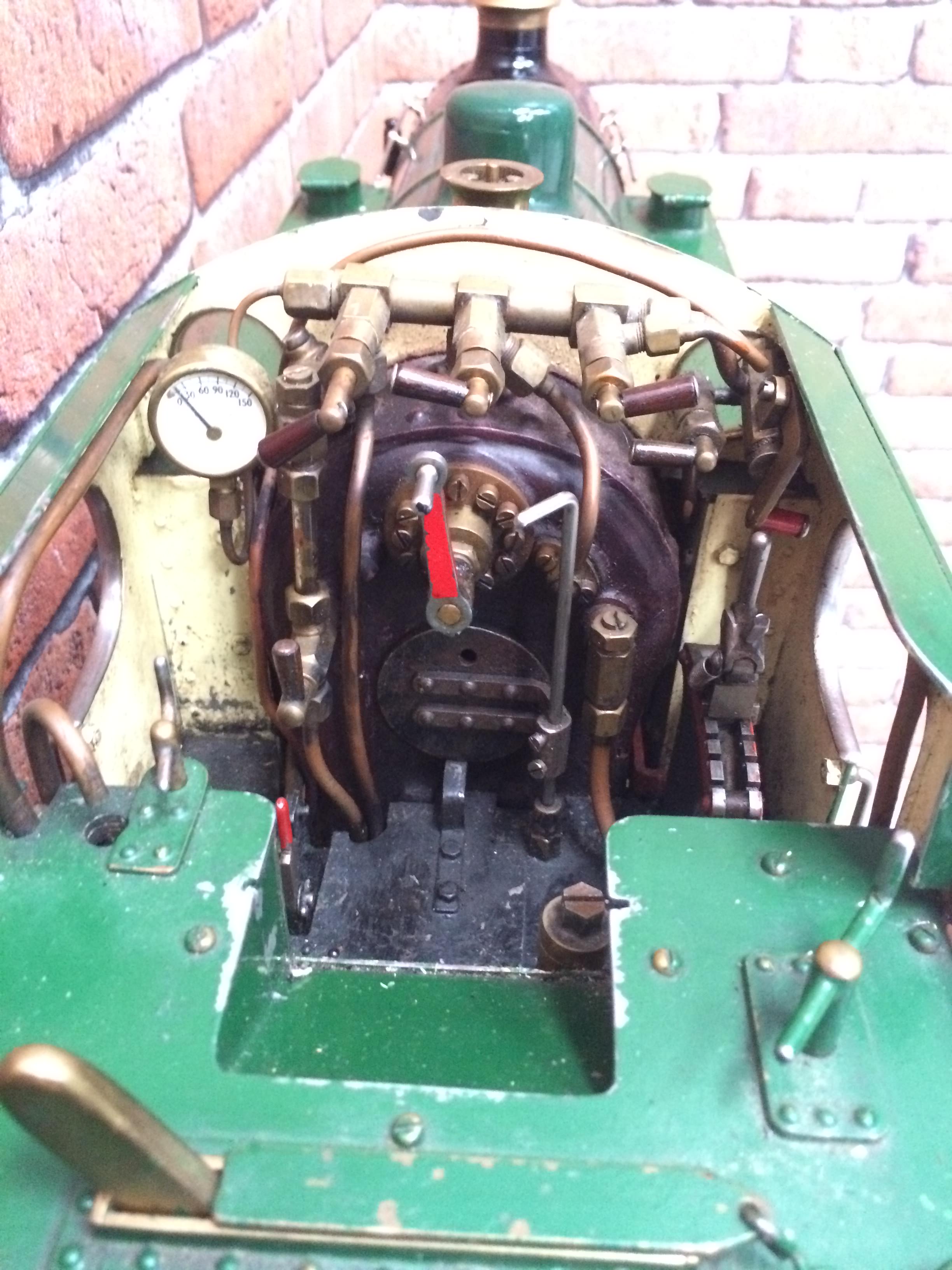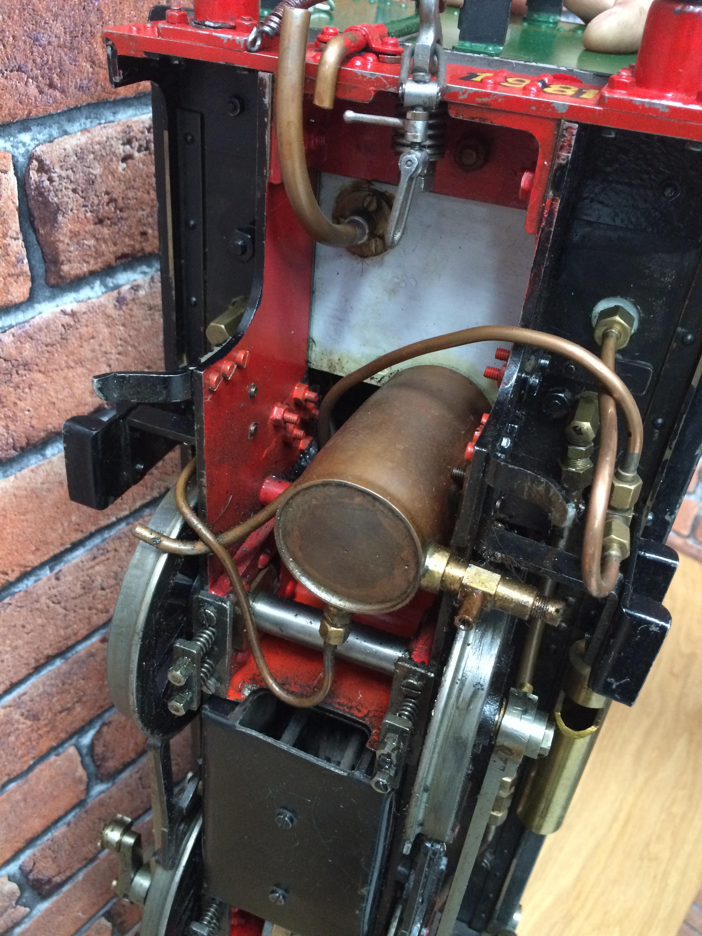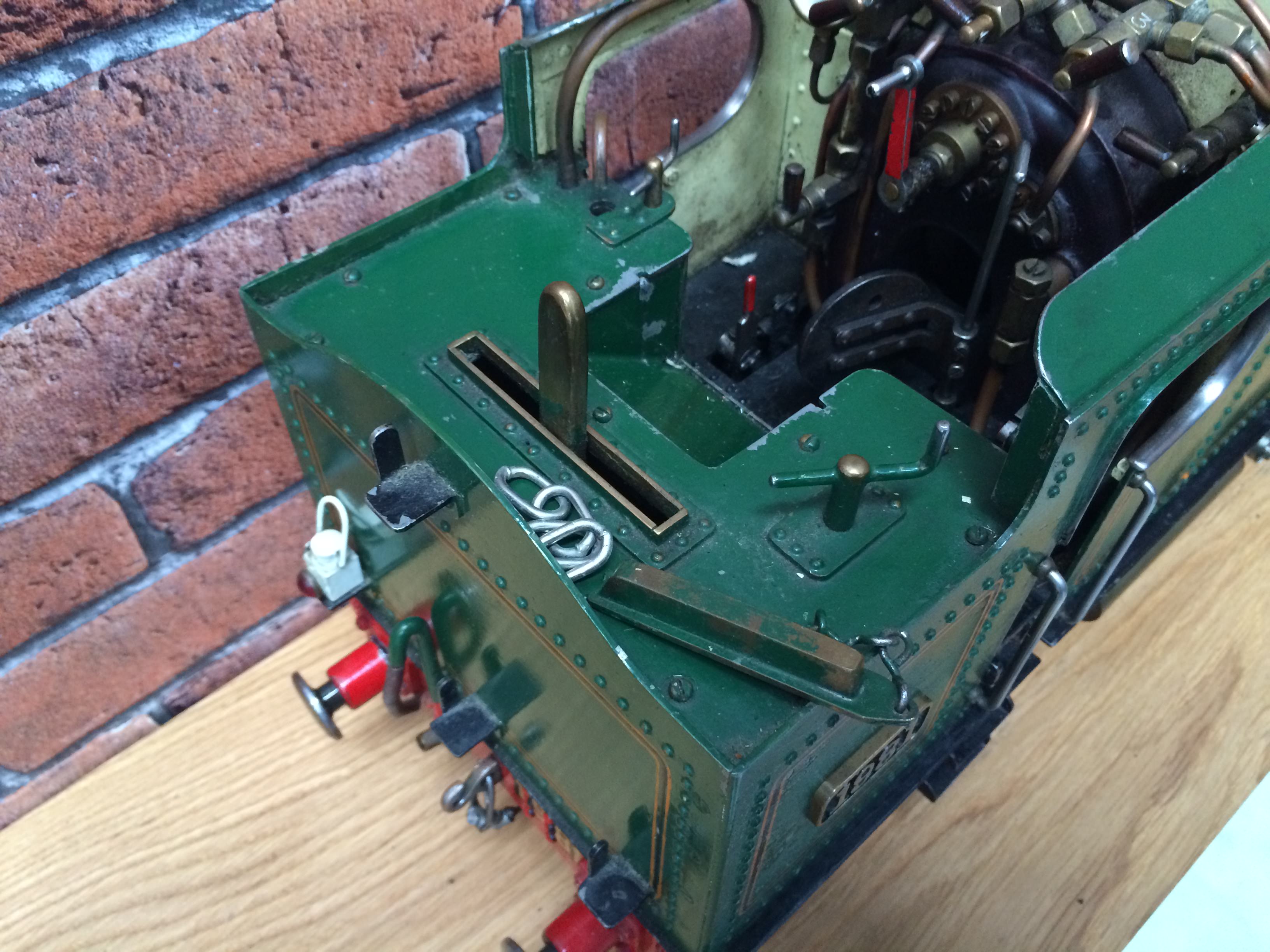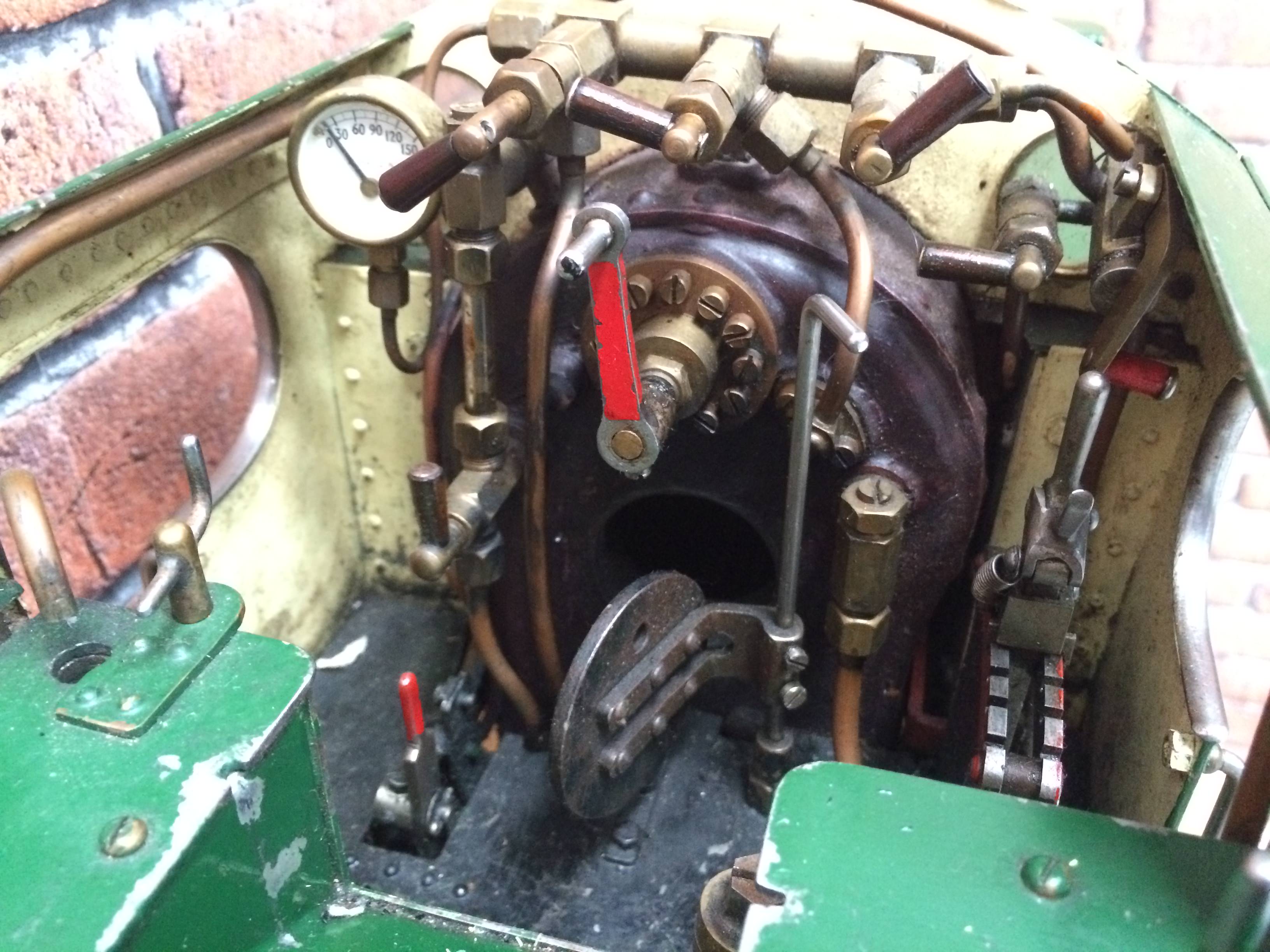 It's solidly constructed copper boiler has an injector fitted, as well as an axle pump and bypass valve and a hand pump nicely fitted in the rear tank, which is of course balanced through to the side tanks for extra water capacity. There is a displacement lubricator resevoir on/under the footplate, and the rare appearance of steam operated drain cocks on a 3 1/2" model.