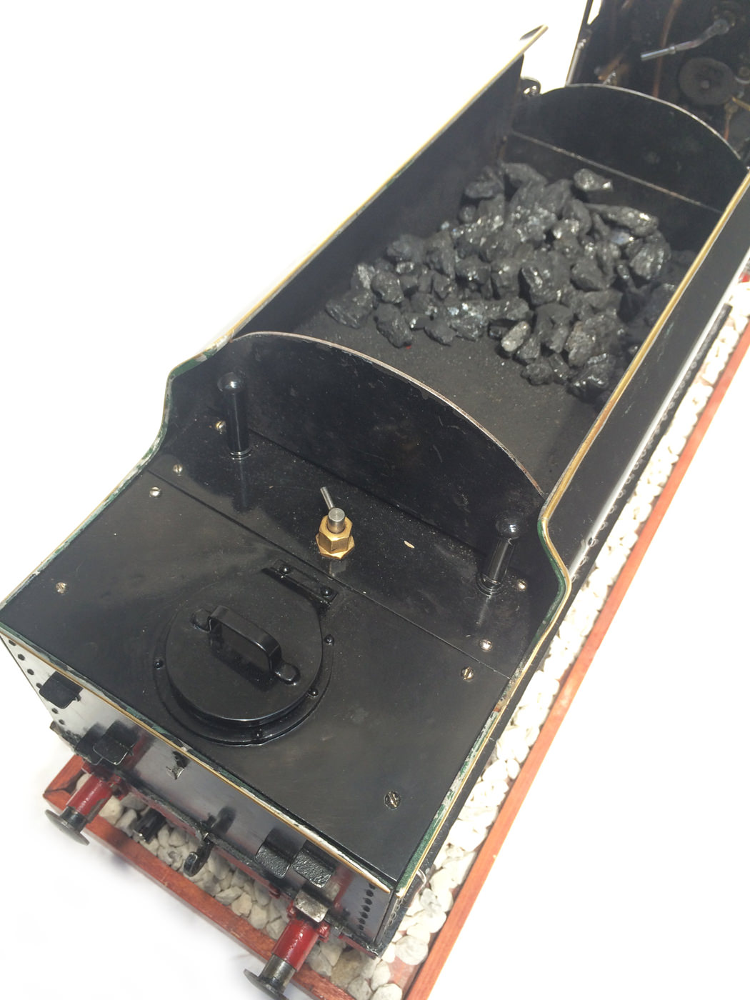 The model is fitted with all the usual refinements. There are footplate operated drain cocks, An injector, mechanical hand pump, and eccentric axle pump with bypas. Lubrication is mechanical and hidden under the front footplate. The quality of machining work on the valve gear is very neat, and the locomotive is a very nice and proven runner.