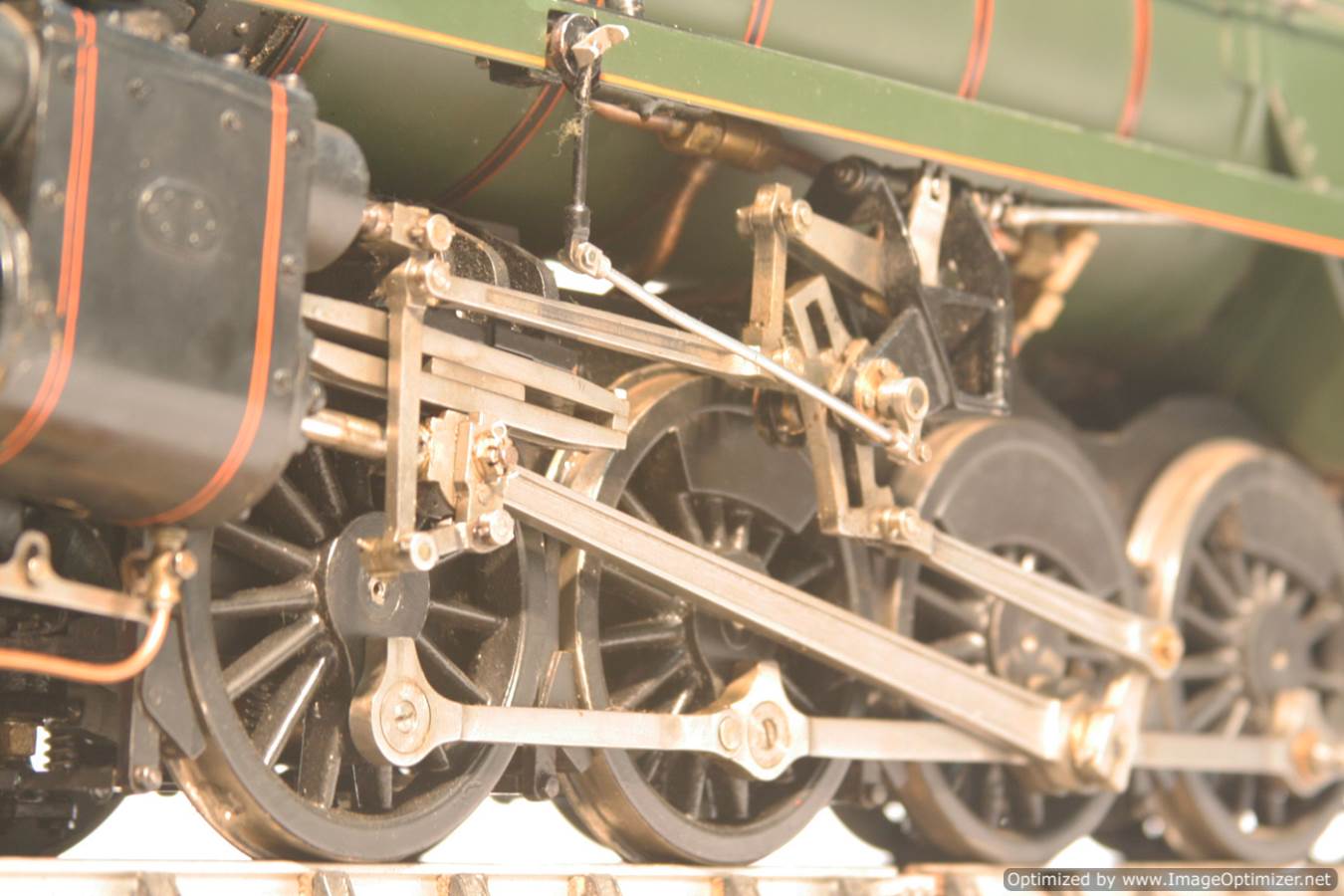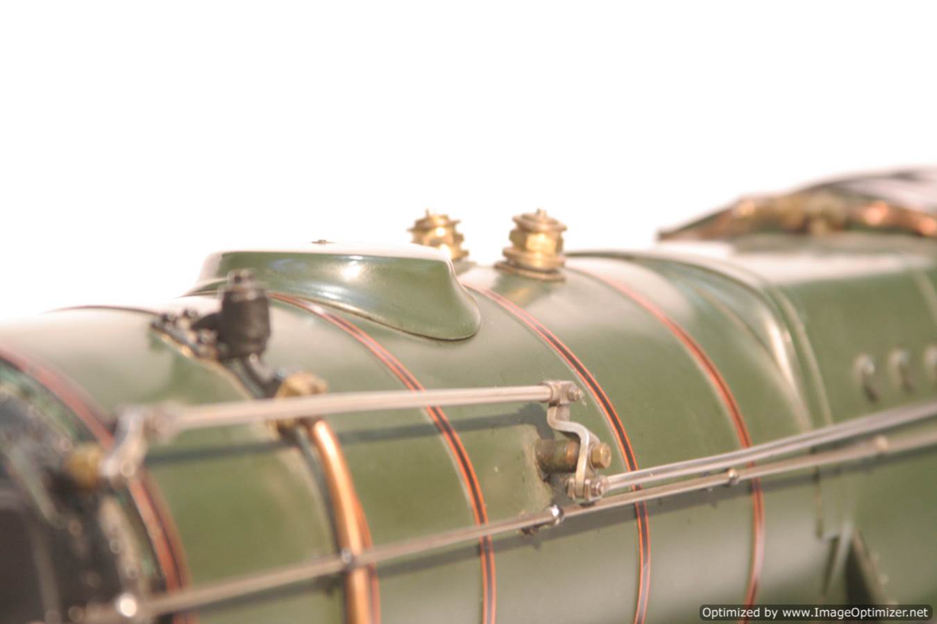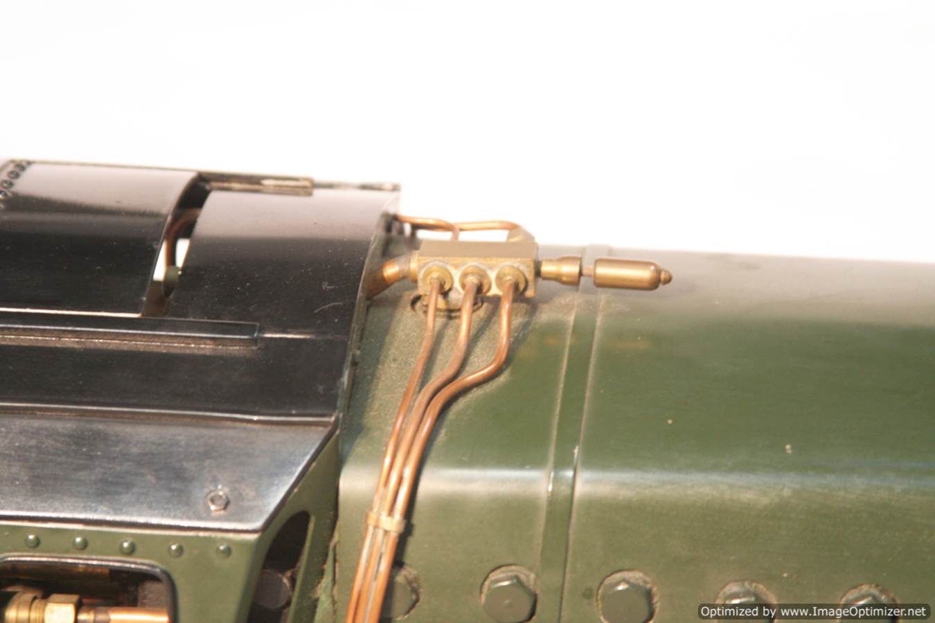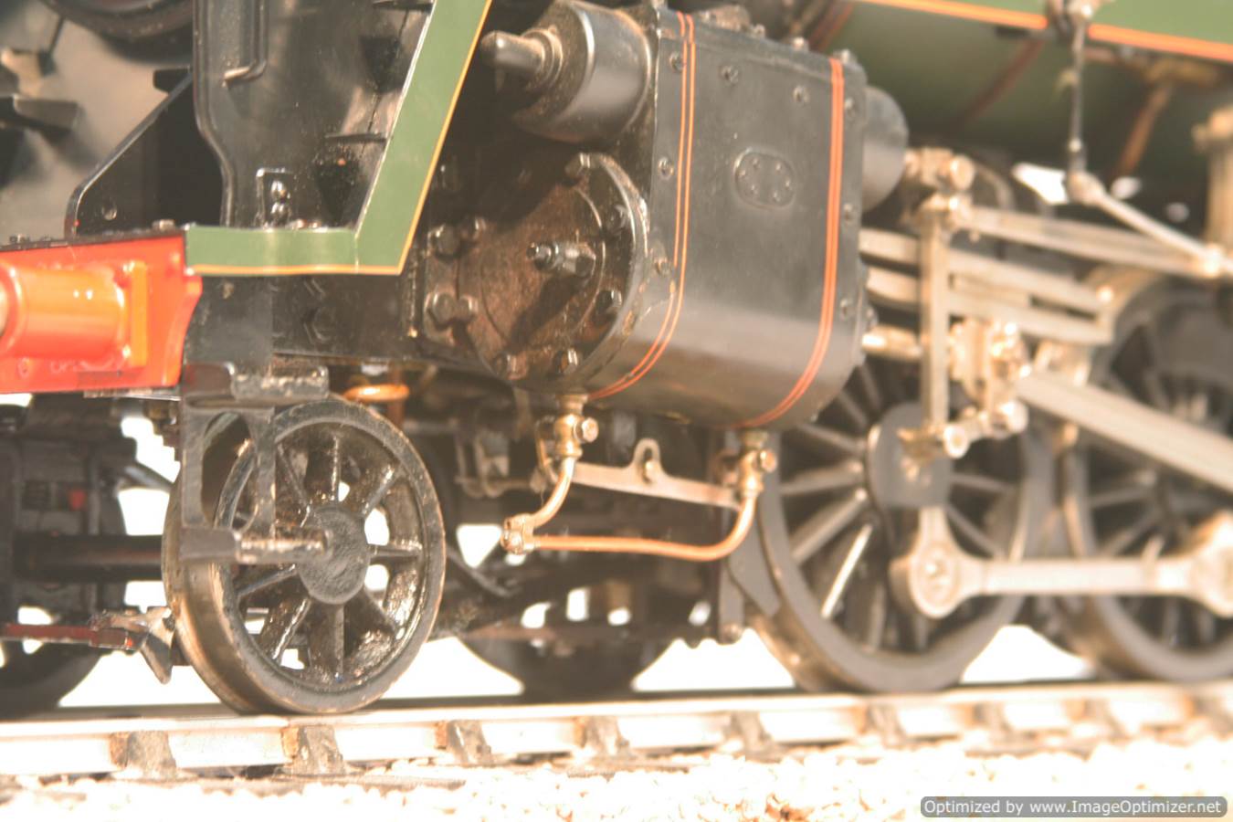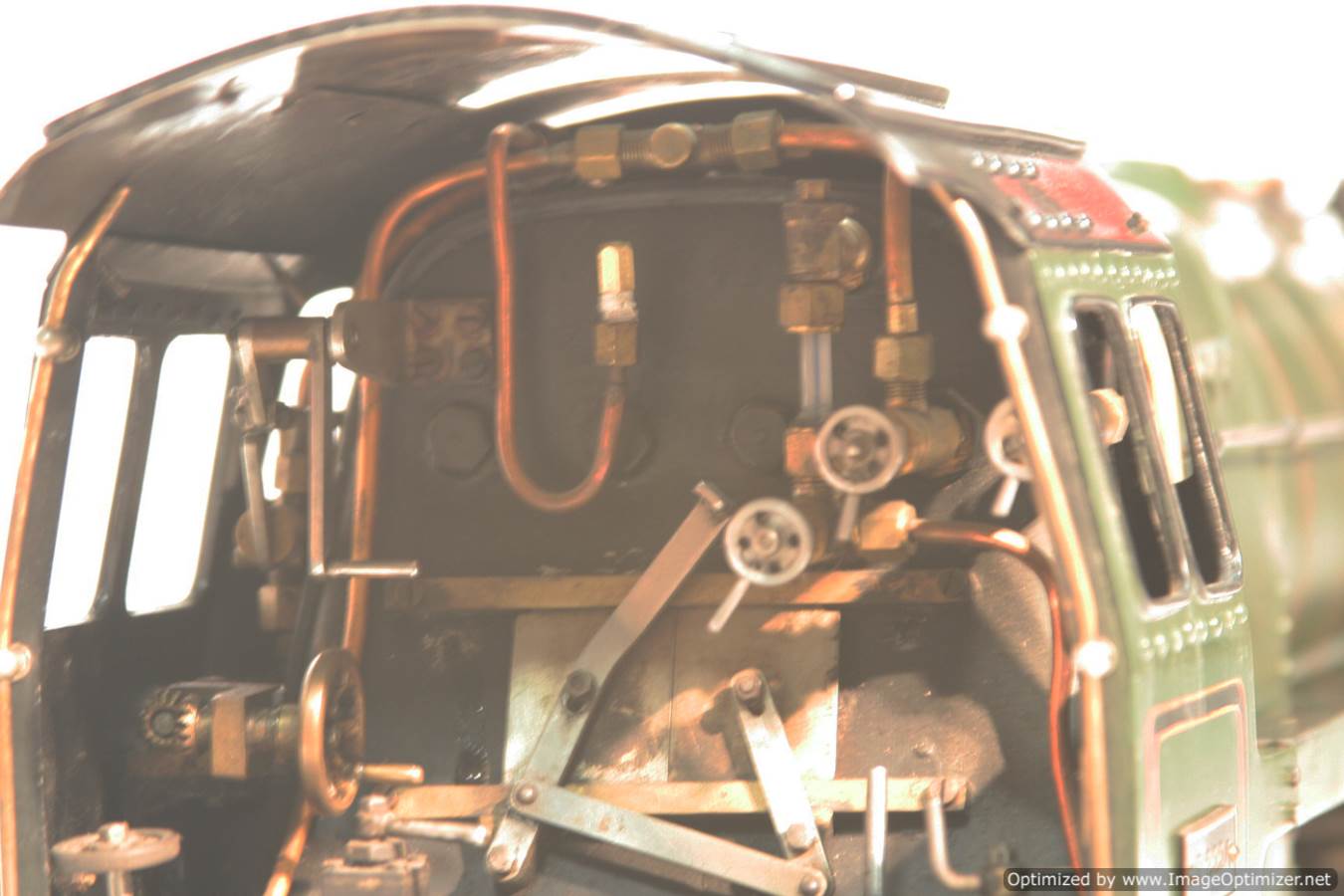 She is fitted with slide valves rather than piston valves, so we expect her to make a really good 'chuff'! There is an injector fitted, an axle pump with footplate mounted bypass valve as well as the ubiquitous emergency hand pump in the tender. Don't worry about the old and cracked rubber water hoses, we will replace them when we steam test her for the certificates, as we tend to do with most of the models that come through. Lubrication is mechanical, and mounted under the front running board in the usual manor, and there is also a steam brake footplate mounted operating the brakes on the loco.