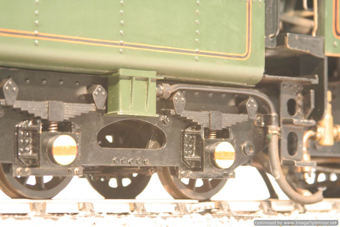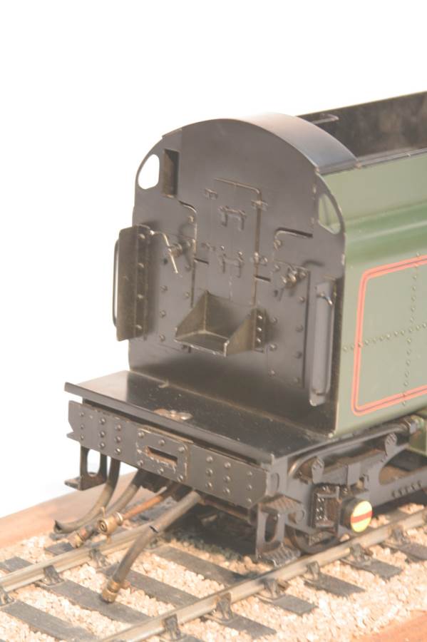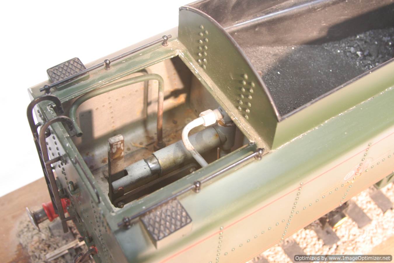 This is a nicely detailed and well made 3 1/2" 9F that doesn't appear to have done a great deal of running. The motion and bottom end is still very nicely tight and well machined, with lots of lovely fluting and finesse. The tender is one of the best 3 1/2" BR tender that we've seen come through so far, even down to having the scale filter boxes under the tank, which is a rare thing in 3 1/2. It's a nice job that really lifts the model. Paintwork is also very tidy with a nice job made of the lining.