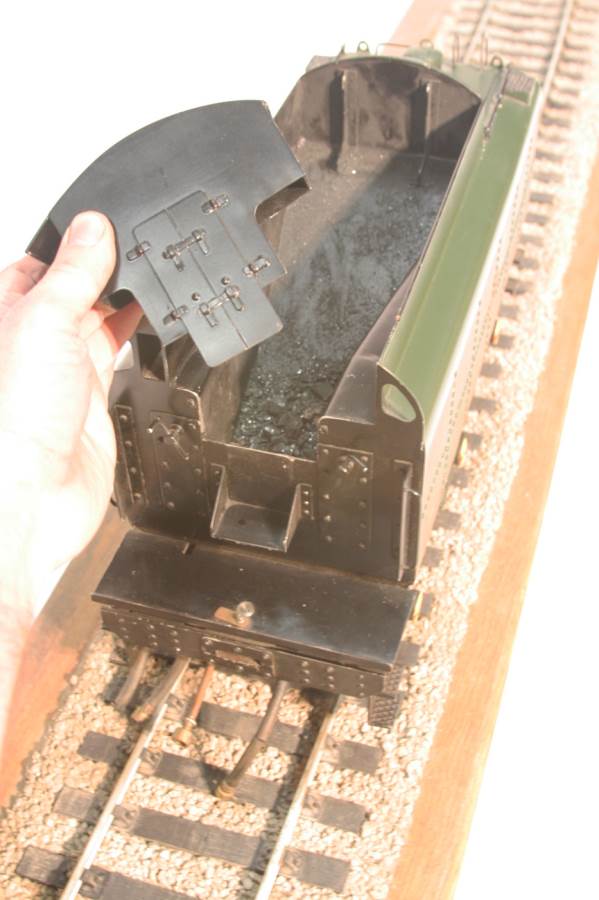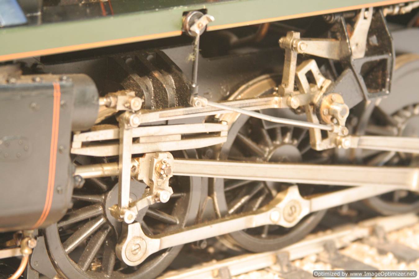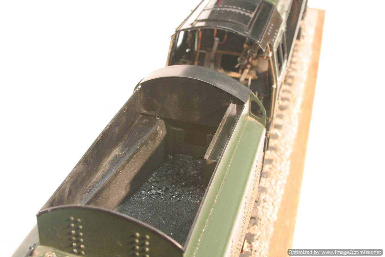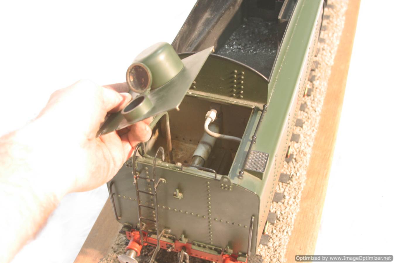 This is a nicely detailed and well made 3 1/2" 9F that doesn't appear to have done a great deal of running. The motion and bottom end is still very nicely tight and well machined, with lots of lovely fluting and finesse. The tender is one of the best 3 1/2" BR tender that we've seen come through so far, even down to having the scale filter boxes under the tank, which is a rare thing in 3 1/2. It's a nice job that really lifts the model. Paintwork is also very tidy with a nice job made of the lining.
