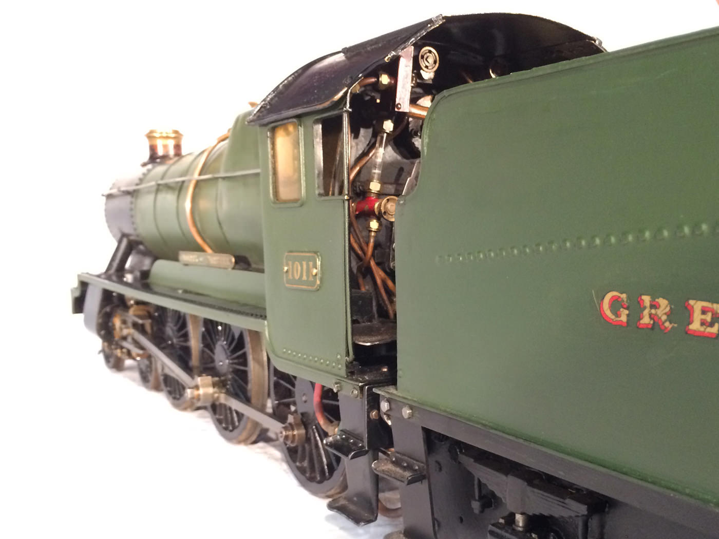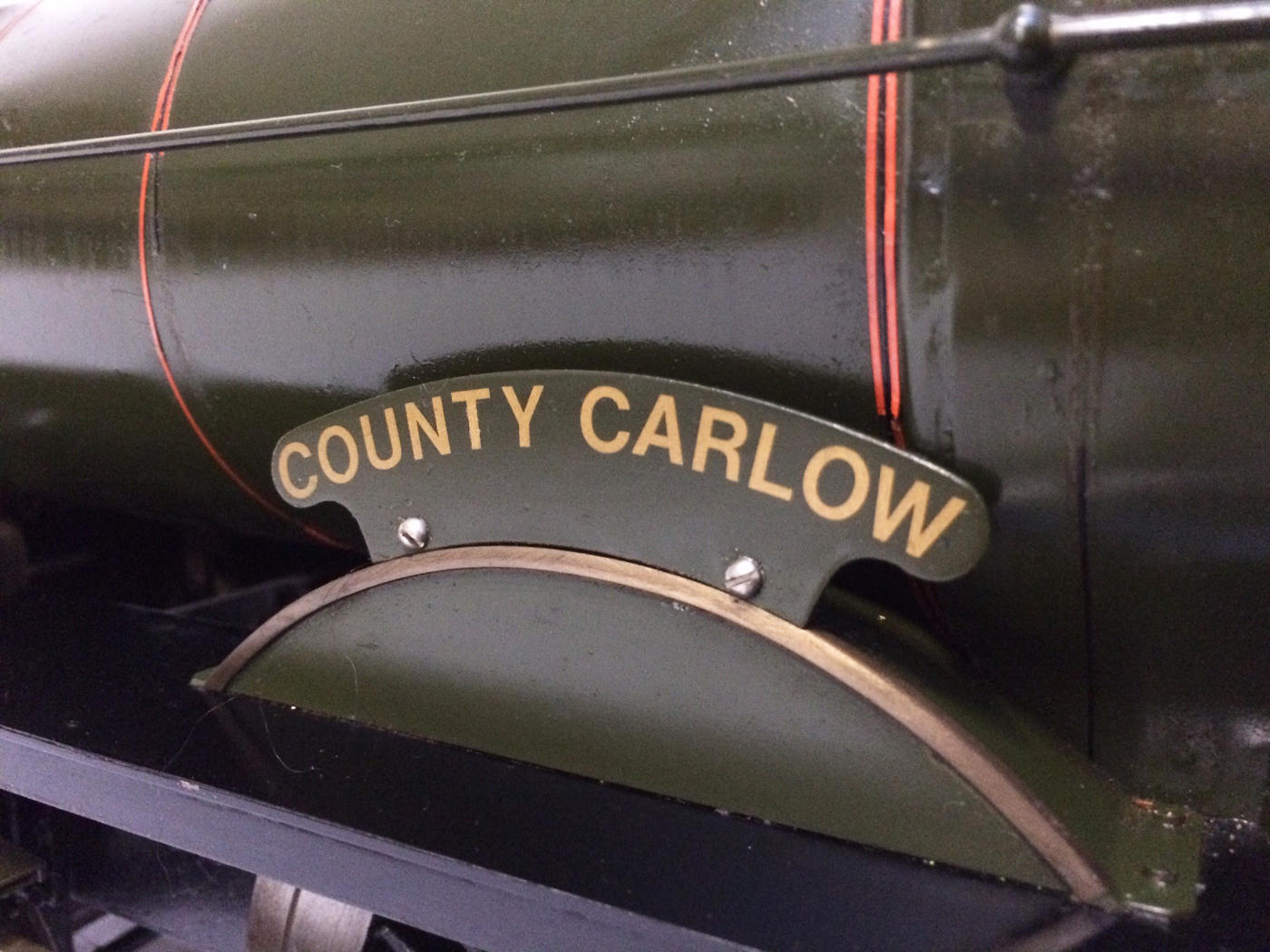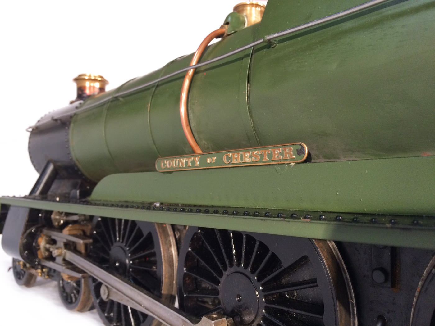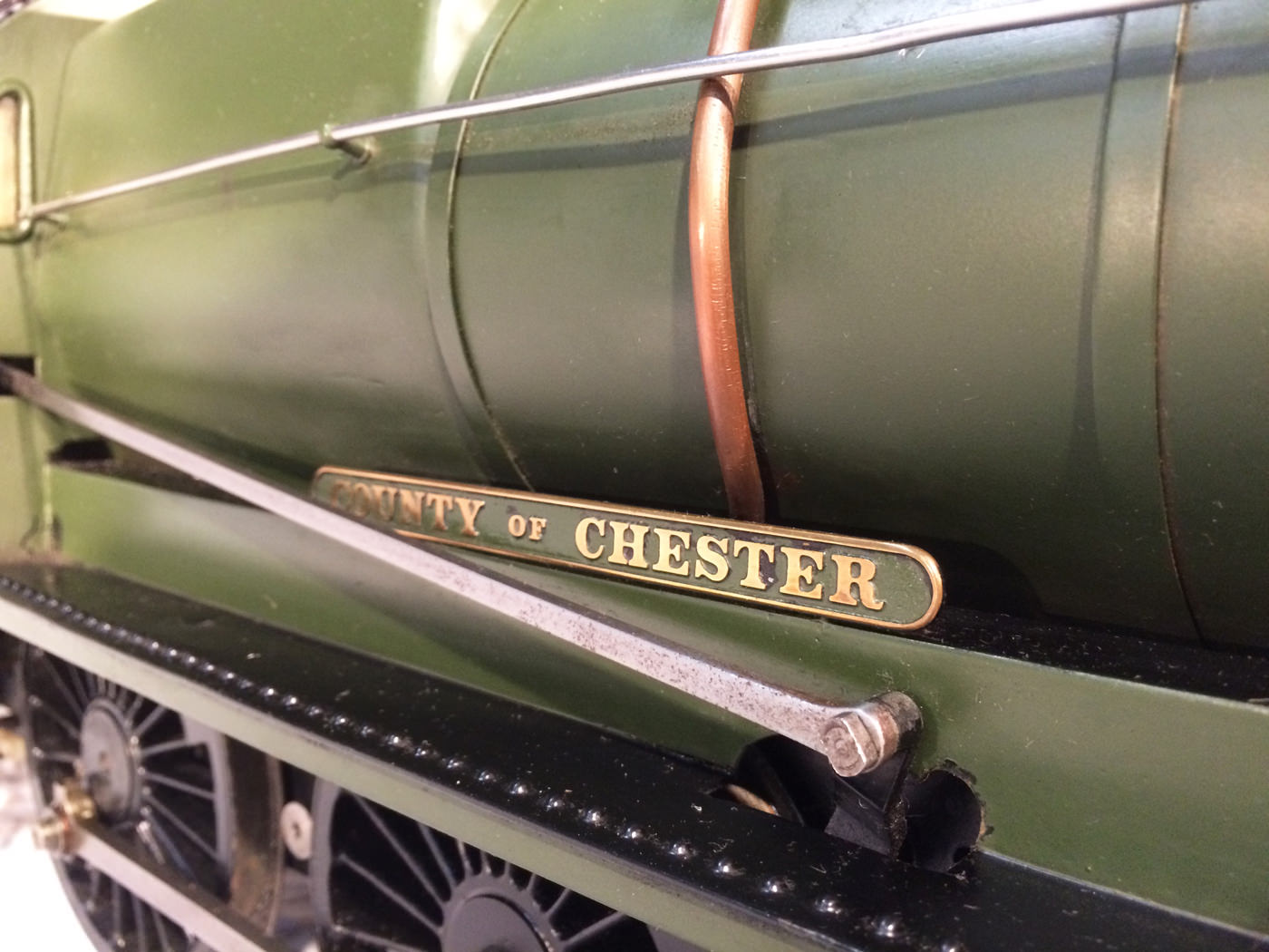 Count the Counties! We appear to collect them,.... two 'County of Chester's in for a start,..... the 4-4-0 GWR 38XX Earlier Churchward 'County of Chester', and now this. So here we have the later model! A nice GWR 1000 Class Hawksworth 4-6-0 County. 30 of these were built by the GWR over a two year period just after the war, and it's basically a Modified Hall with an LMS 8F boiler on it. Again, another pretty rarely modeled prototype this, although for reasons that we can't fathom, GWR 4-6-0s (with the exception of Kings), seem to be generally very rare in 3 1/2" as a whole. We know of only one other County, a smattering of Halls, and a Grange, but have never seen a single 3 1/2" Manor, Castle, Saint or Star.