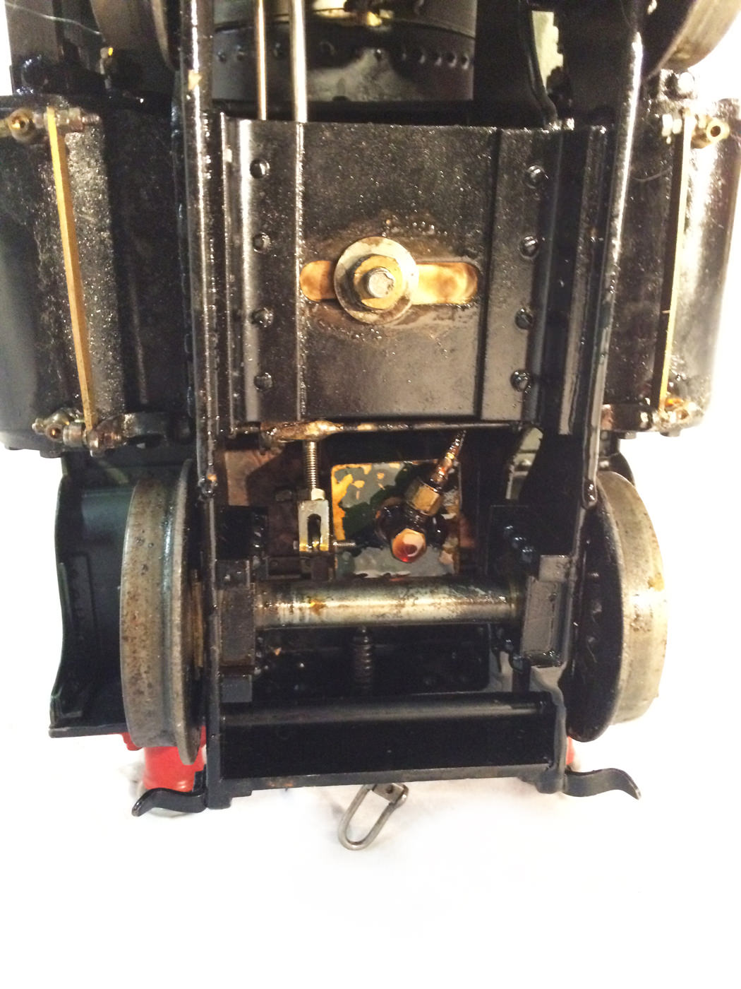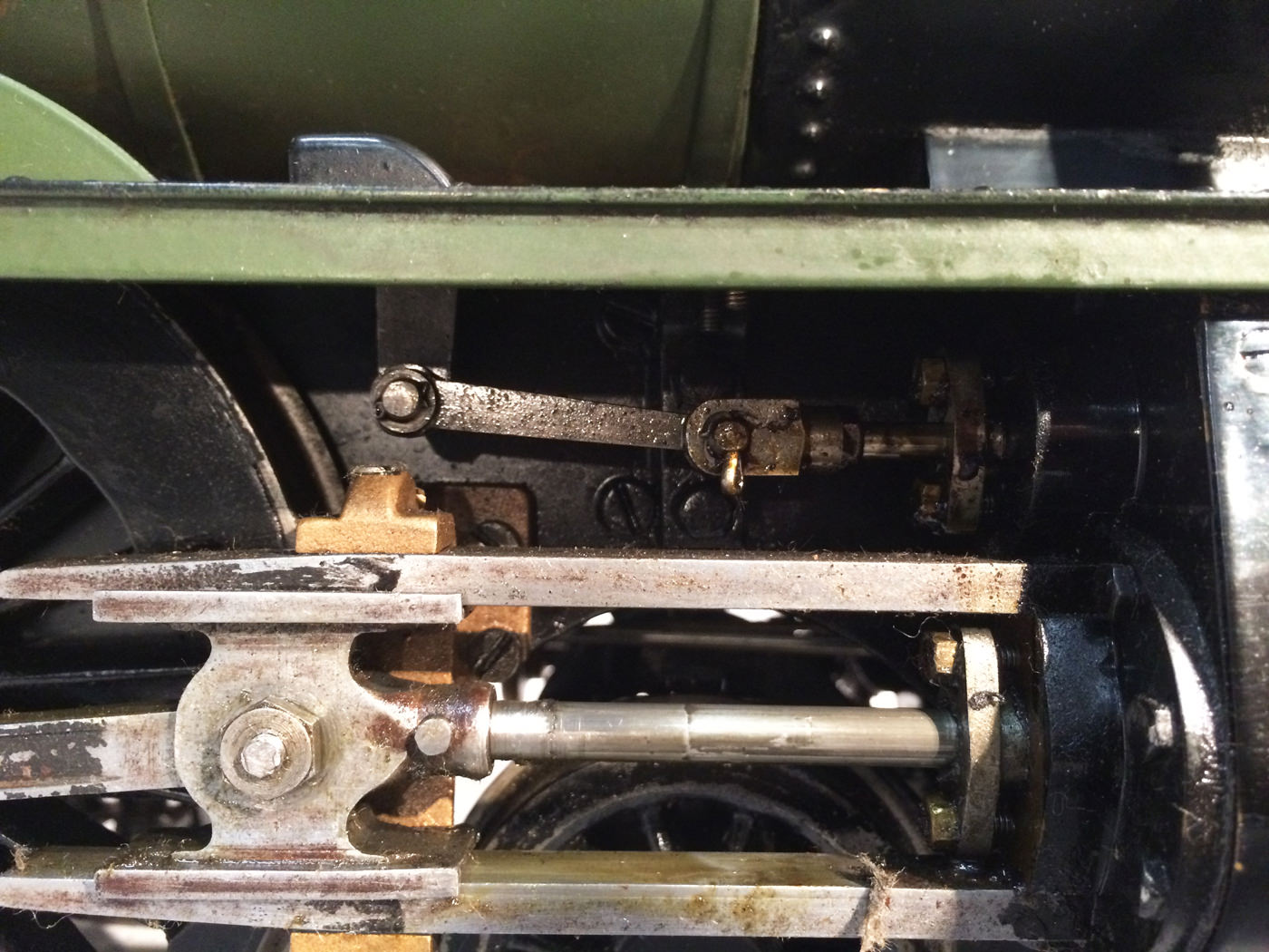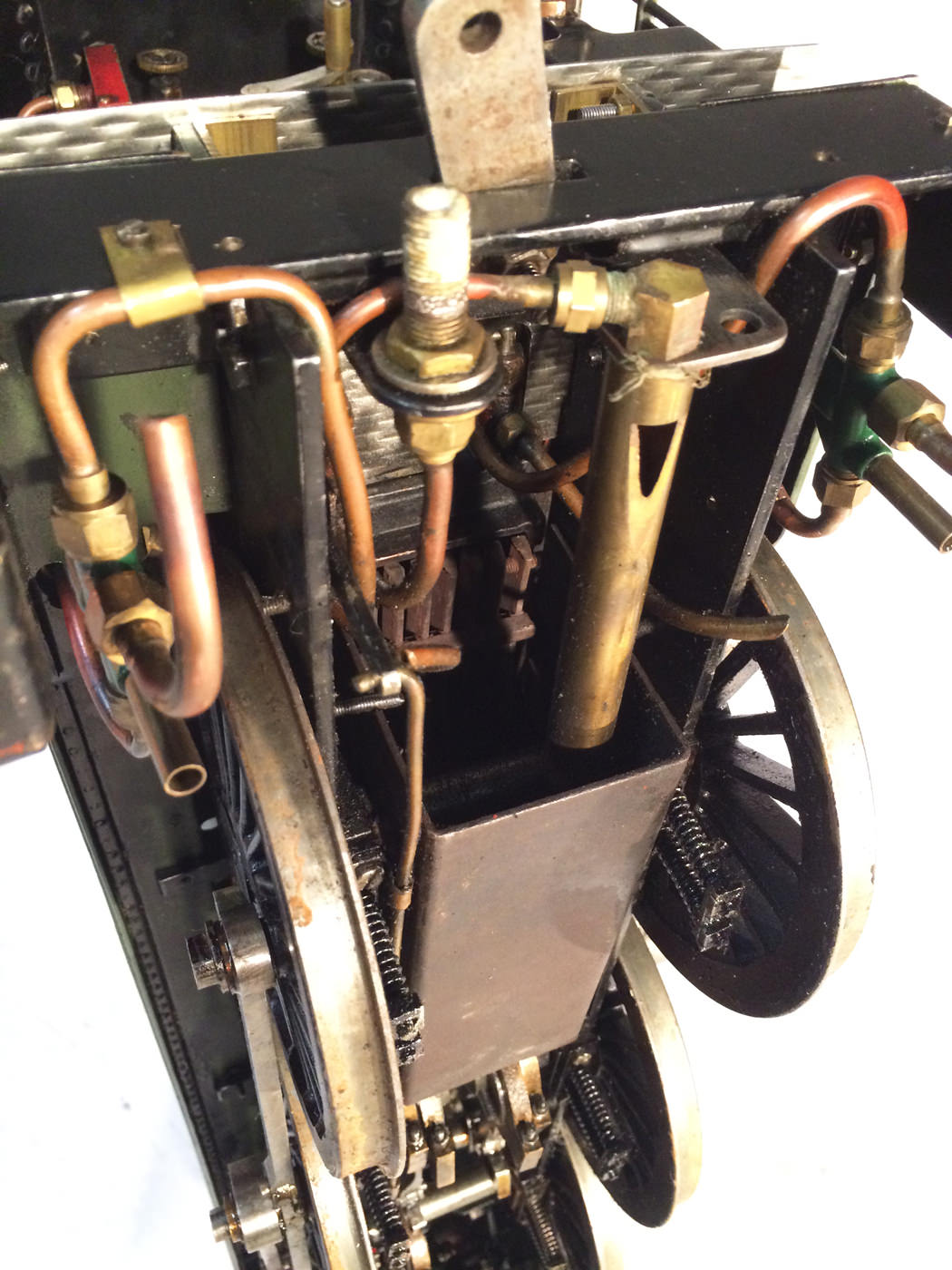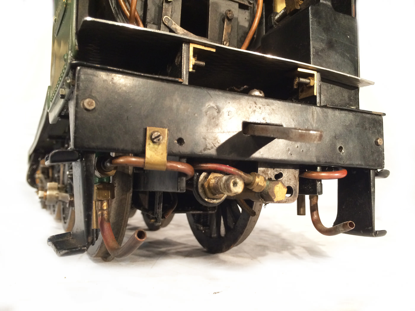 But,.... to the model! So, she's a very nicely engineered loco. Built by an experienced model engineer to run, which we are told it does very well. On close inspection the valve gear is all very crisp and well finished, with very little slack in it. There are footplate operated draincocks, and then twin injectors as well, plus of course the obligatory 'I'm a failure',... sorry,.... emergency hand pump in the tender. Lubrication is from a mechanical pump and resevoir hidden in the usual place under the front running board.