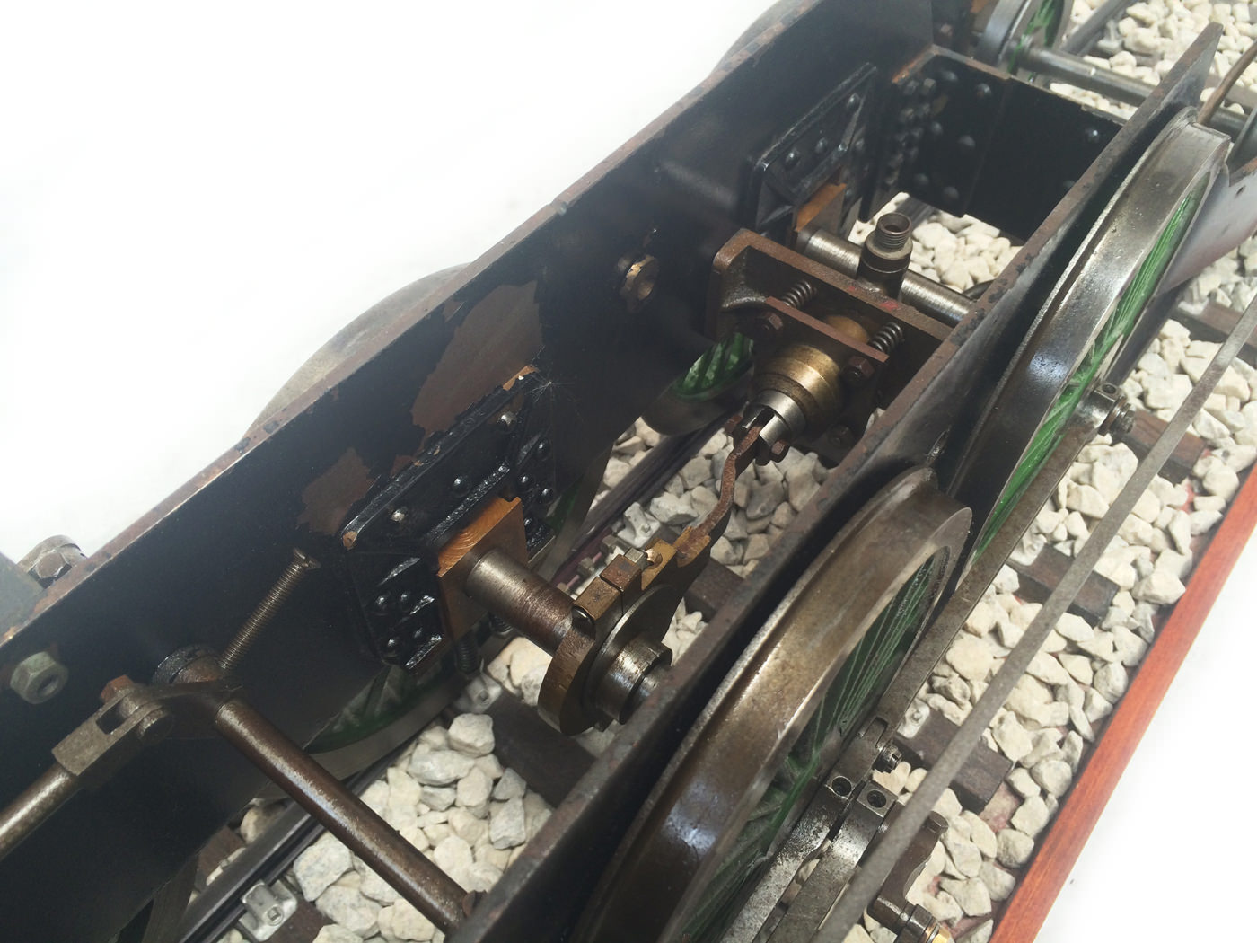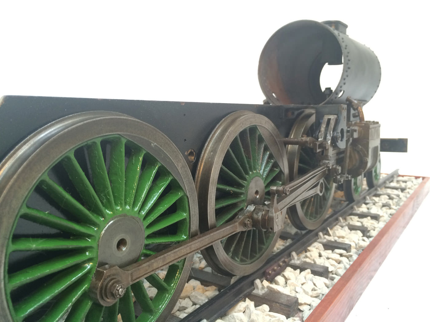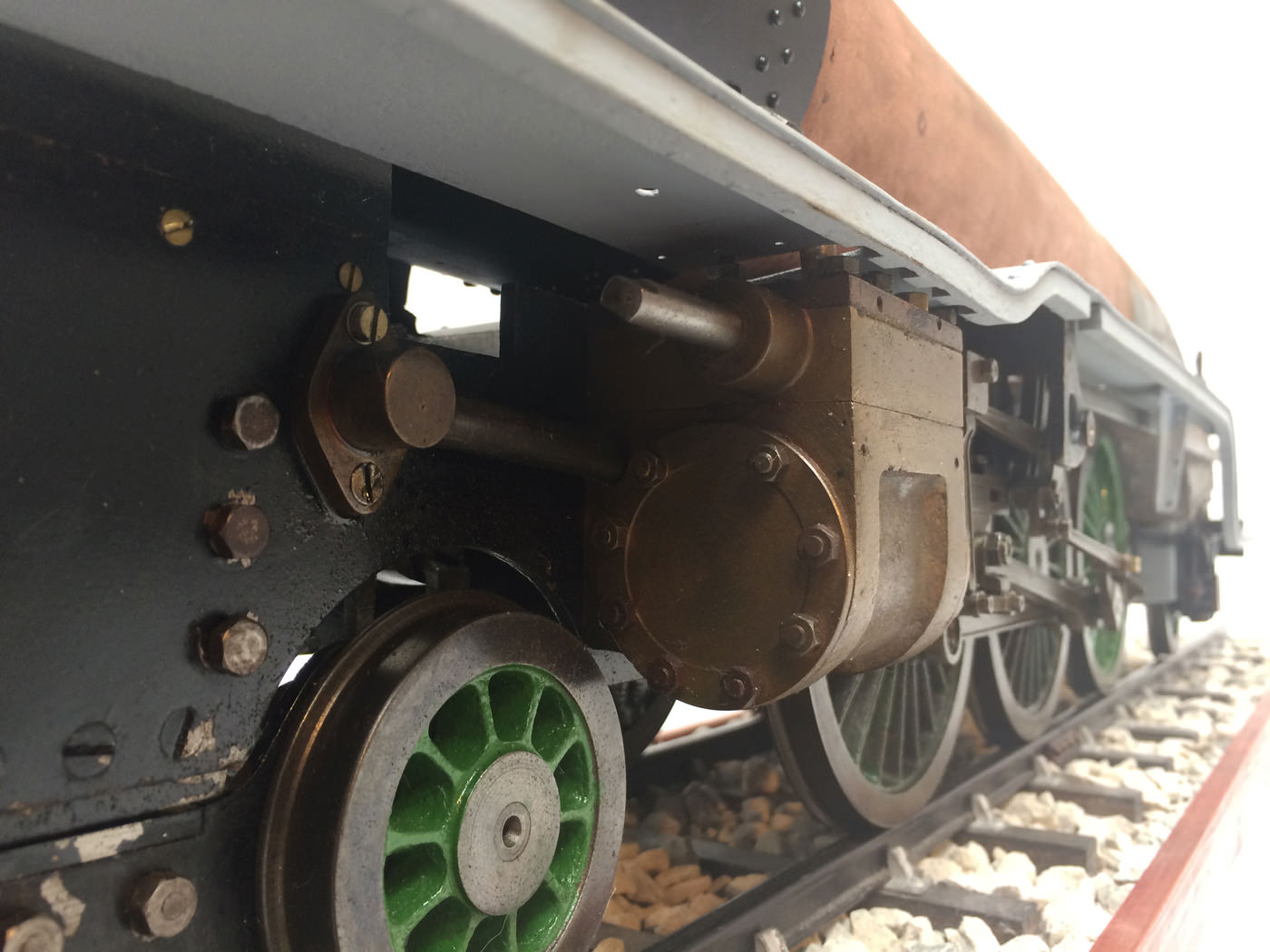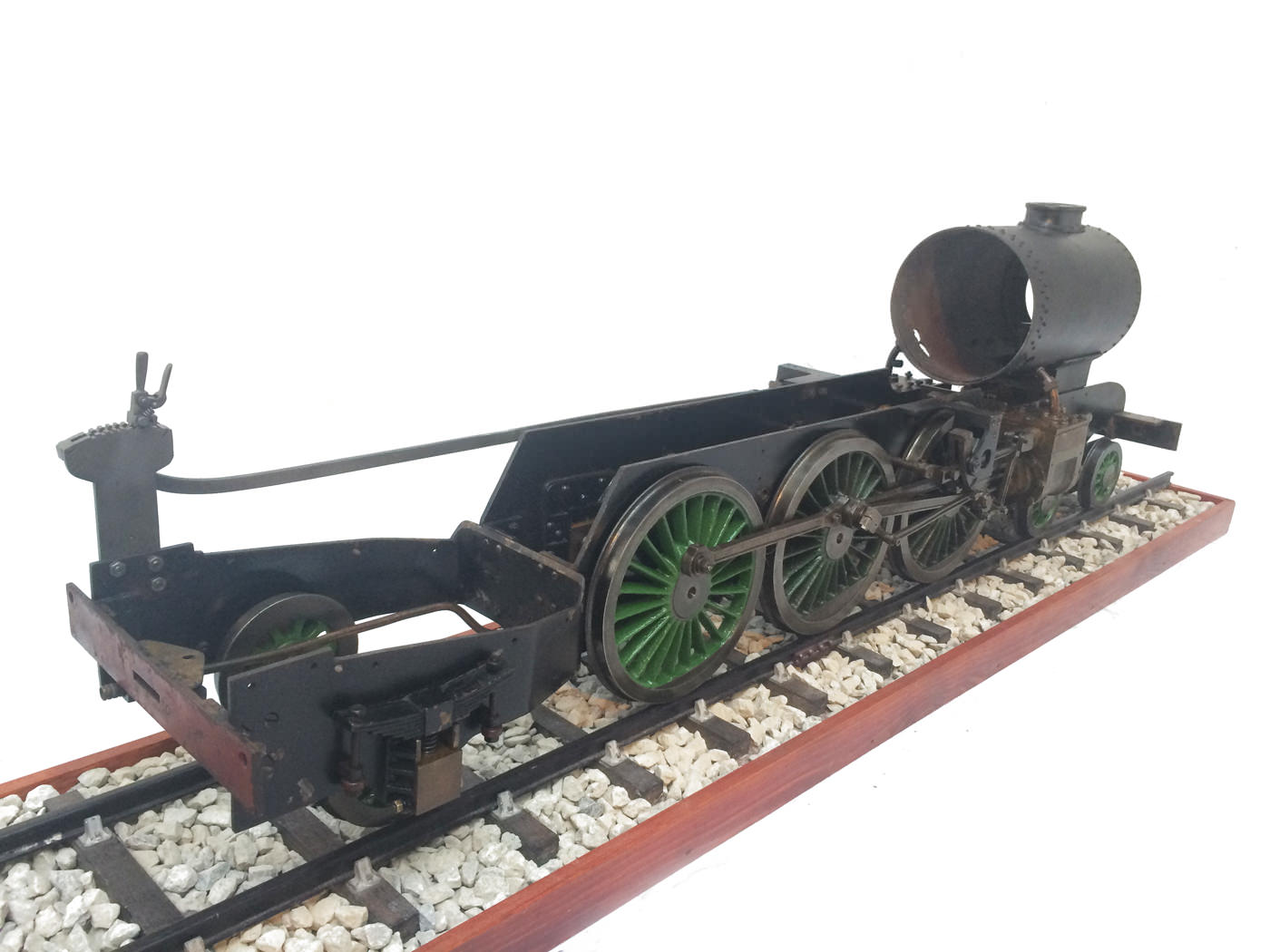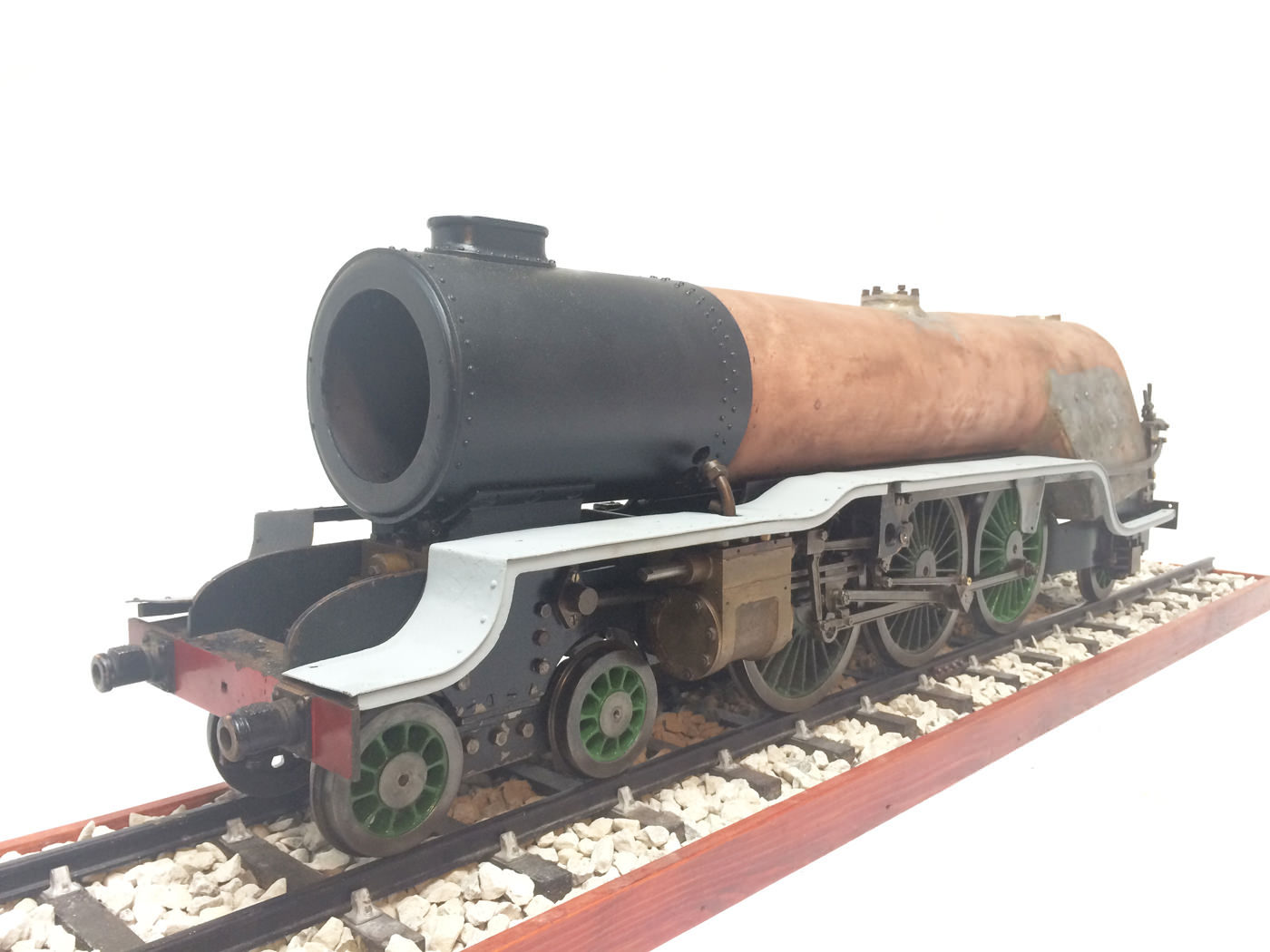 Here we have a part built 3 1/2" Gauge Thompson A1/1 made to LBSC's 'Heilan Lassie' design. Loads of work done already on this one. In fact it has the look of a complete loco that's been stripped down for an overhaul and re-build which, as so often happens hasn't quite made it through to the end. As such certain things are there, and other bits and bobs aren't. Things like there being only one smoke deflector, and 6 out of the 8 axle boxes. That said, the valve gear is all nicely made, and the bottom end ticks over nicely on air. The boiler is there, and although not the most beautiful boiler that you'll ever see, it is solid and will happily pass a hydraulic.