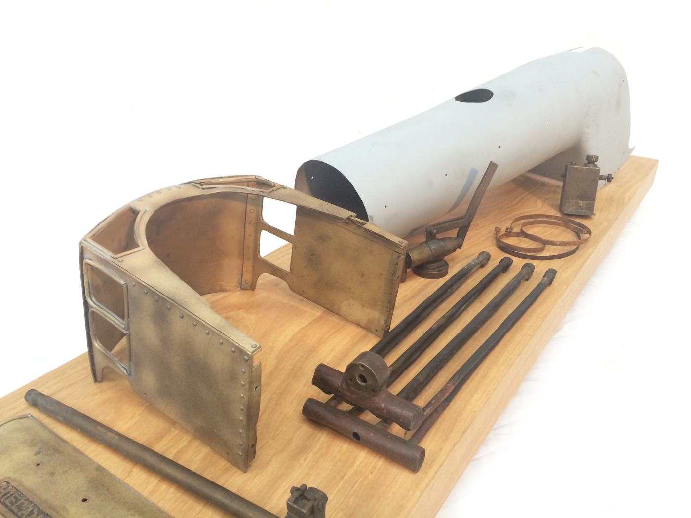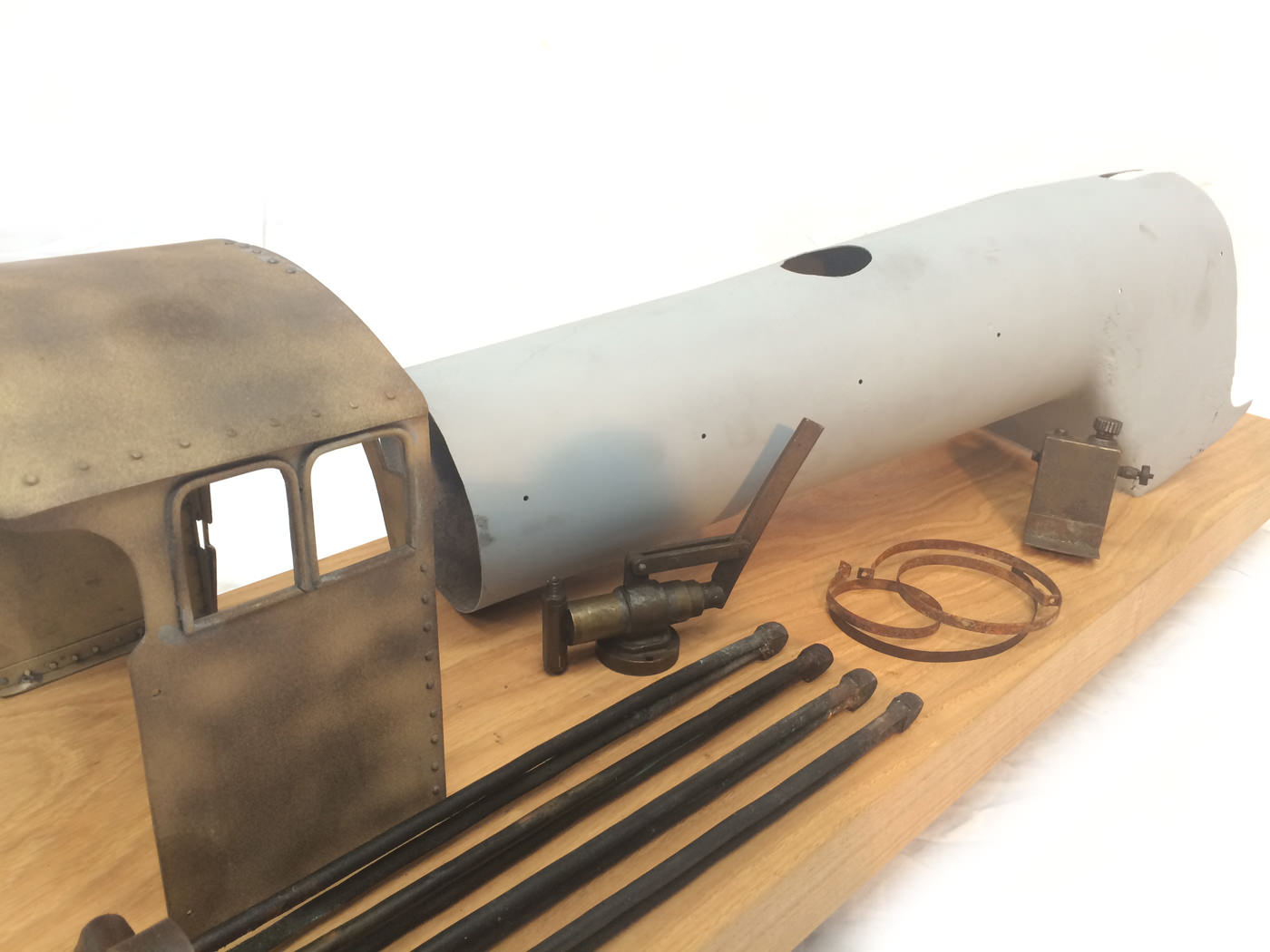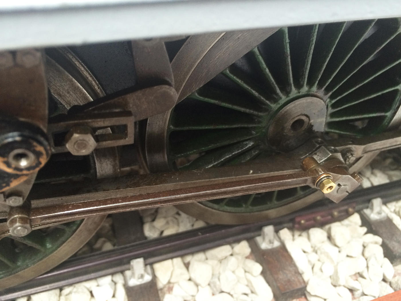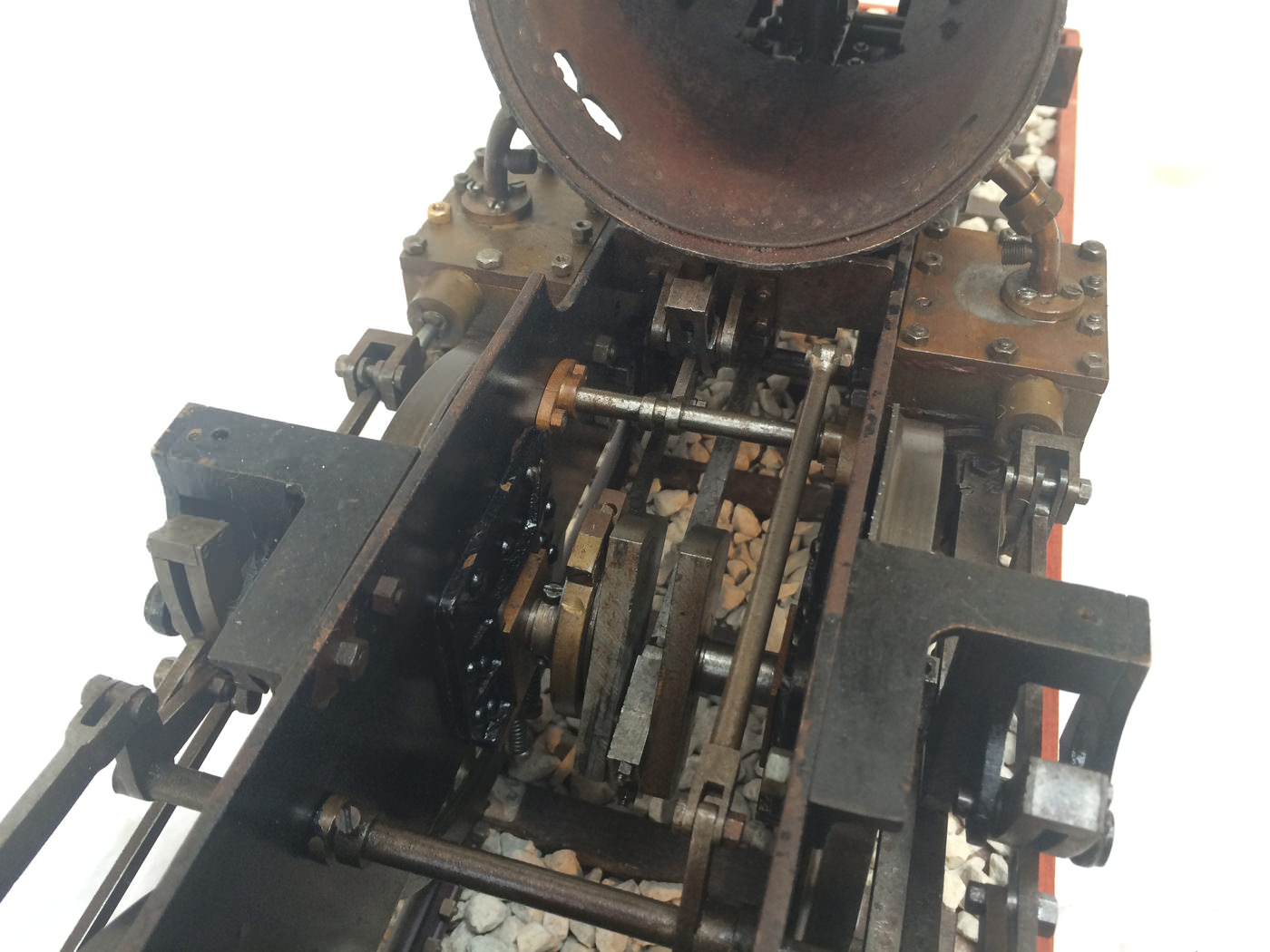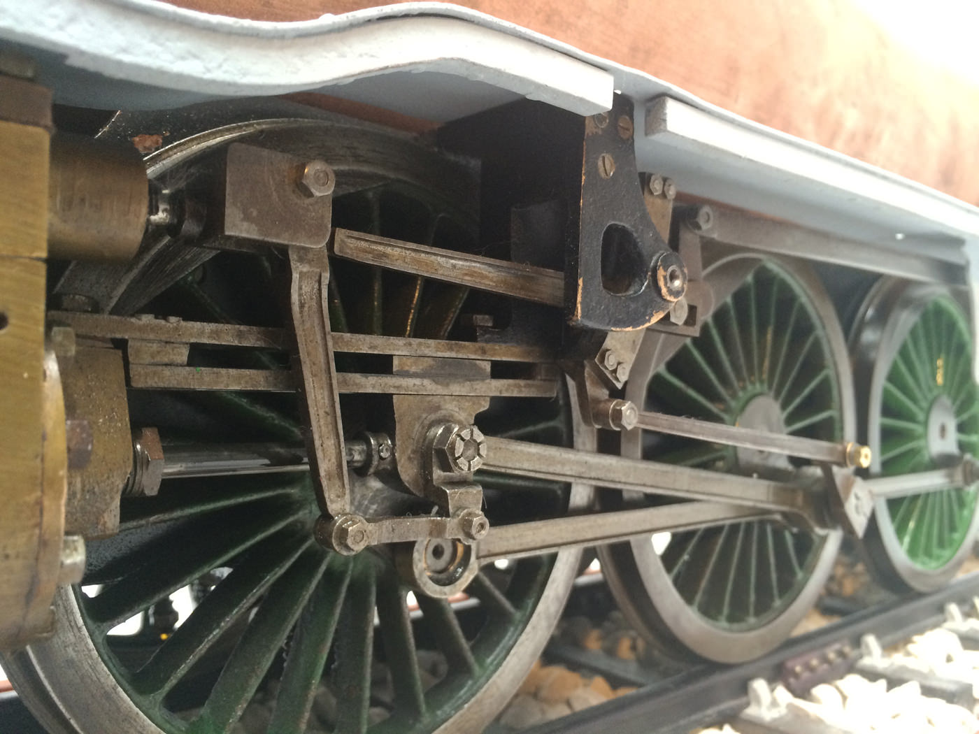 Here we have a part built 3 1/2" Gauge Thompson A1/1 made to LBSC's 'Heilan Lassie' design. Loads of work done already on this one. In fact it has the look of a complete loco that's been stripped down for an overhaul and re-build which, as so often happens hasn't quite made it through to the end. As such certain things are there, and other bits and bobs aren't. Things like there being only one smoke deflector, and 6 out of the 8 axle boxes. That said, the valve gear is all nicely made, and the bottom end ticks over nicely on air. The boiler is there, and although not the most beautiful boiler that you'll ever see, it is solid and will happily pass a hydraulic.