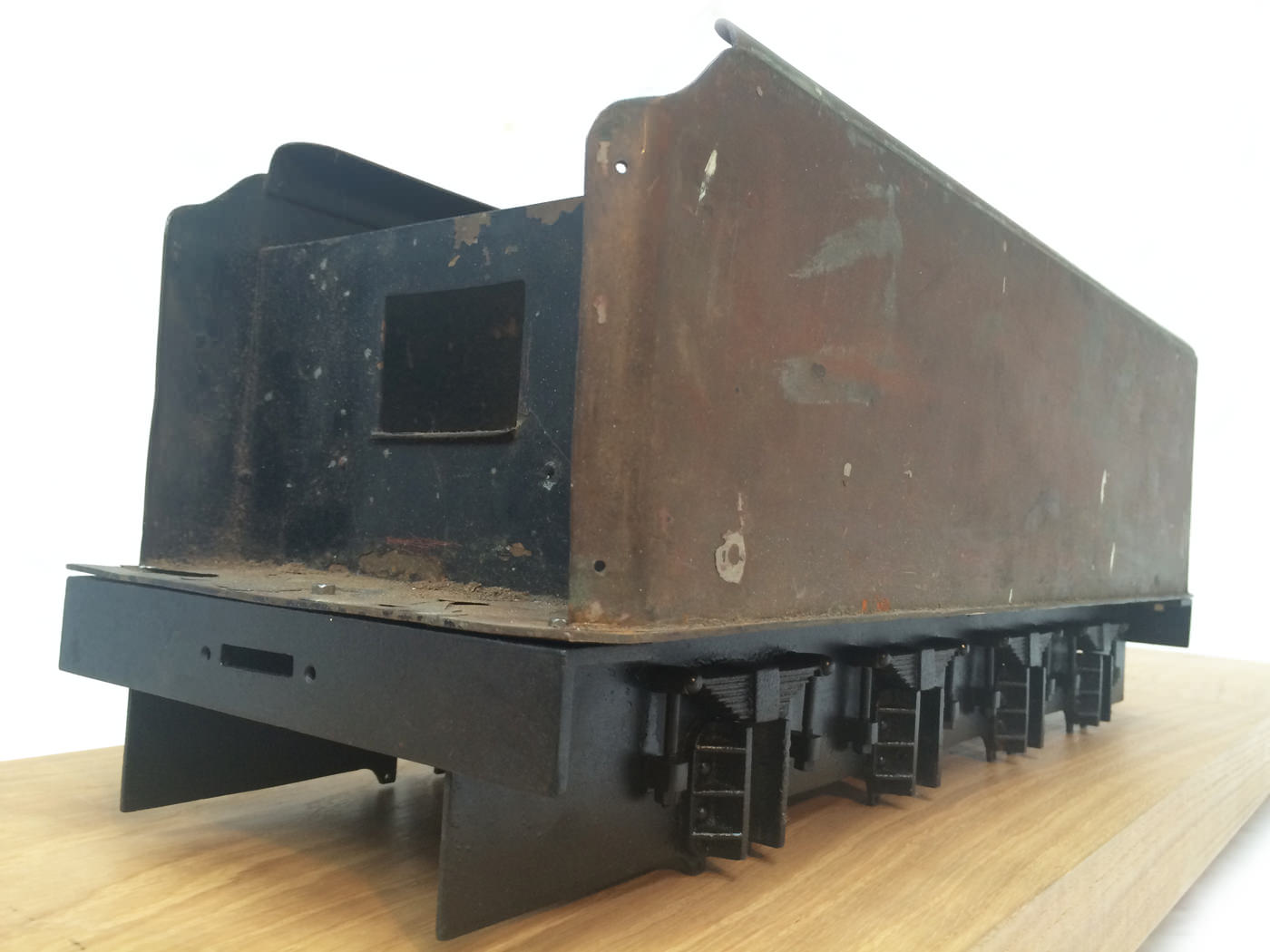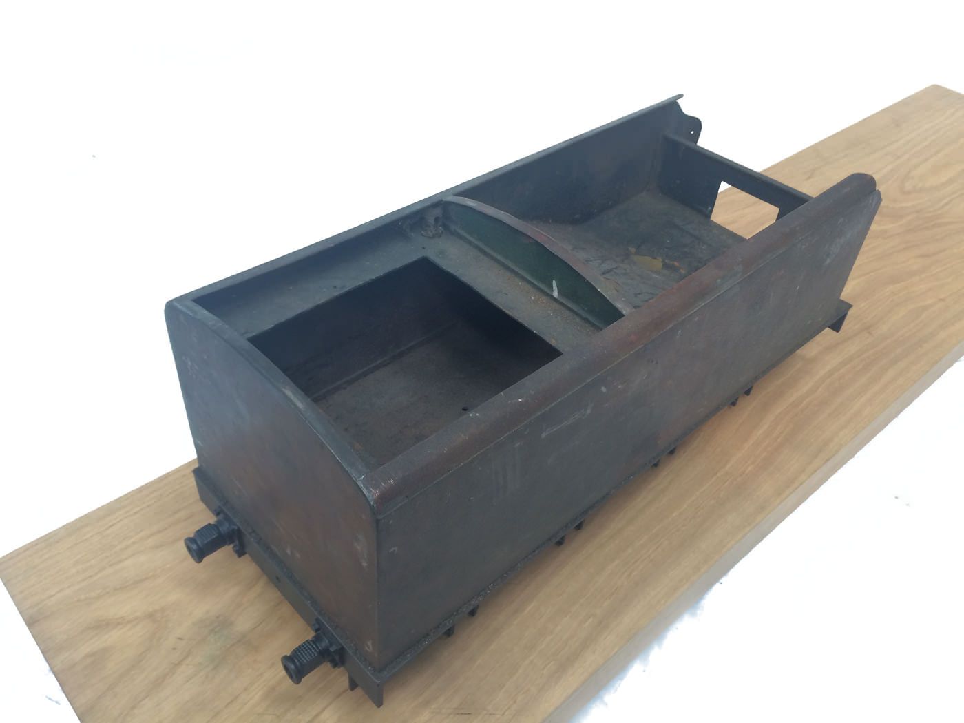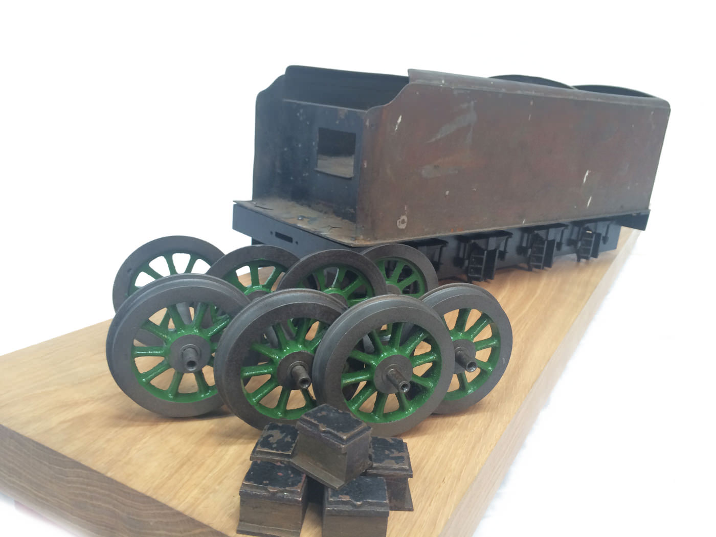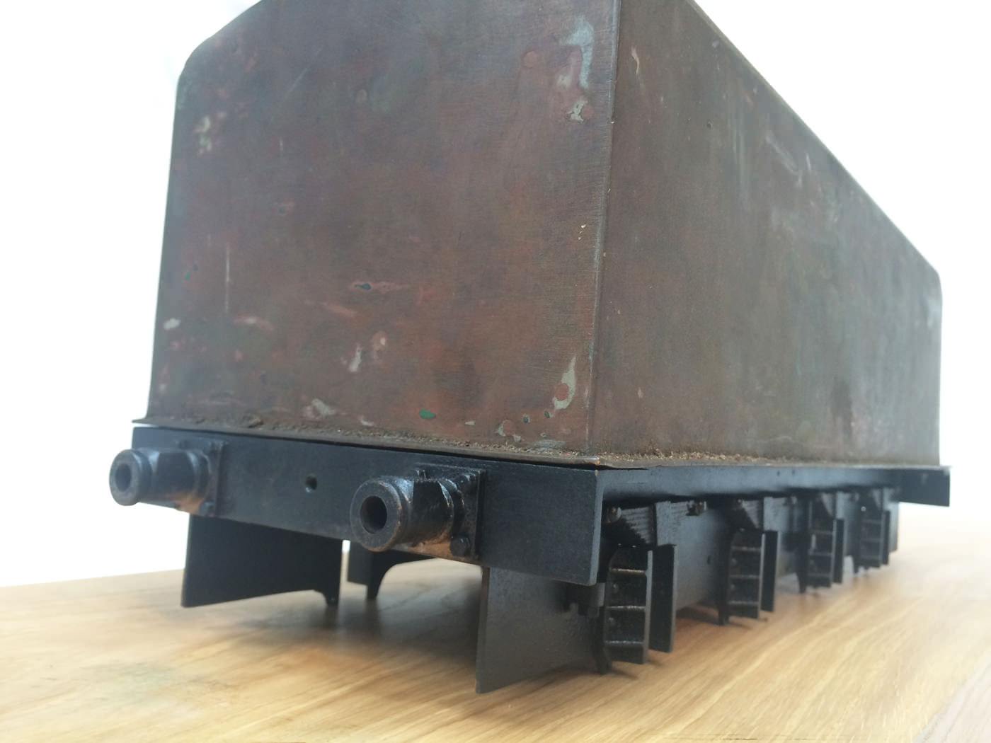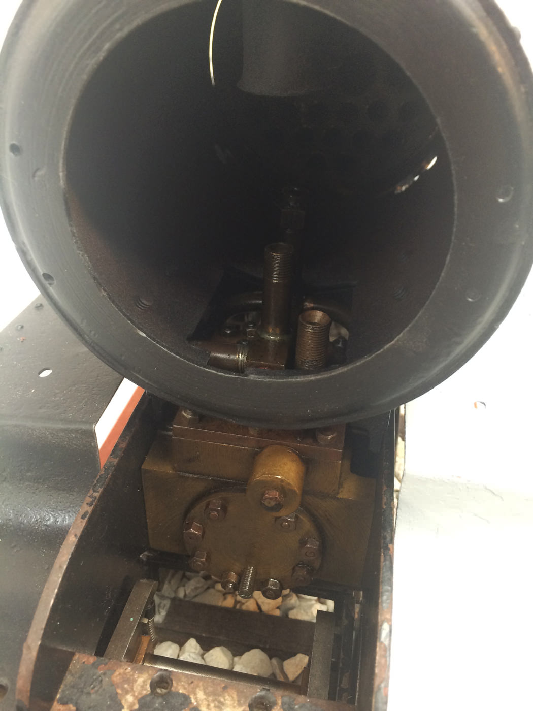 Here we have a part built 3 1/2" Gauge Thompson A1/1 made to LBSC's 'Heilan Lassie' design. Loads of work done already on this one. In fact it has the look of a complete loco that's been stripped down for an overhaul and re-build which, as so often happens hasn't quite made it through to the end. As such certain things are there, and other bits and bobs aren't. Things like there being only one smoke deflector, and 6 out of the 8 axle boxes. That said, the valve gear is all nicely made, and the bottom end ticks over nicely on air. The boiler is there, and although not the most beautiful boiler that you'll ever see, it is solid and will happily pass a hydraulic.