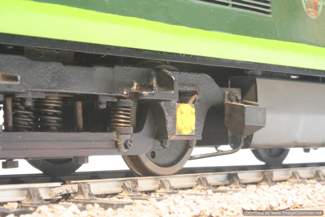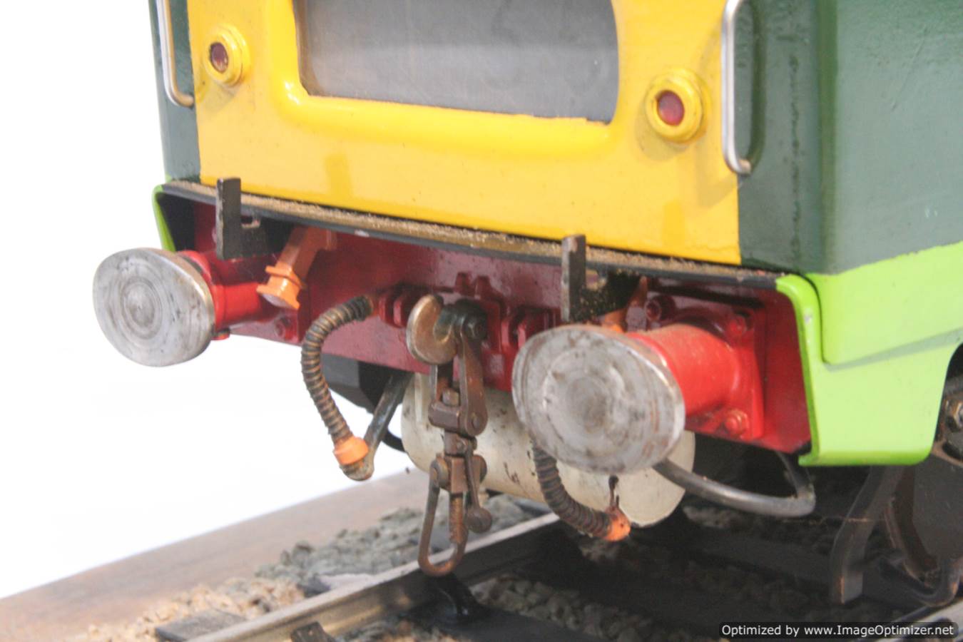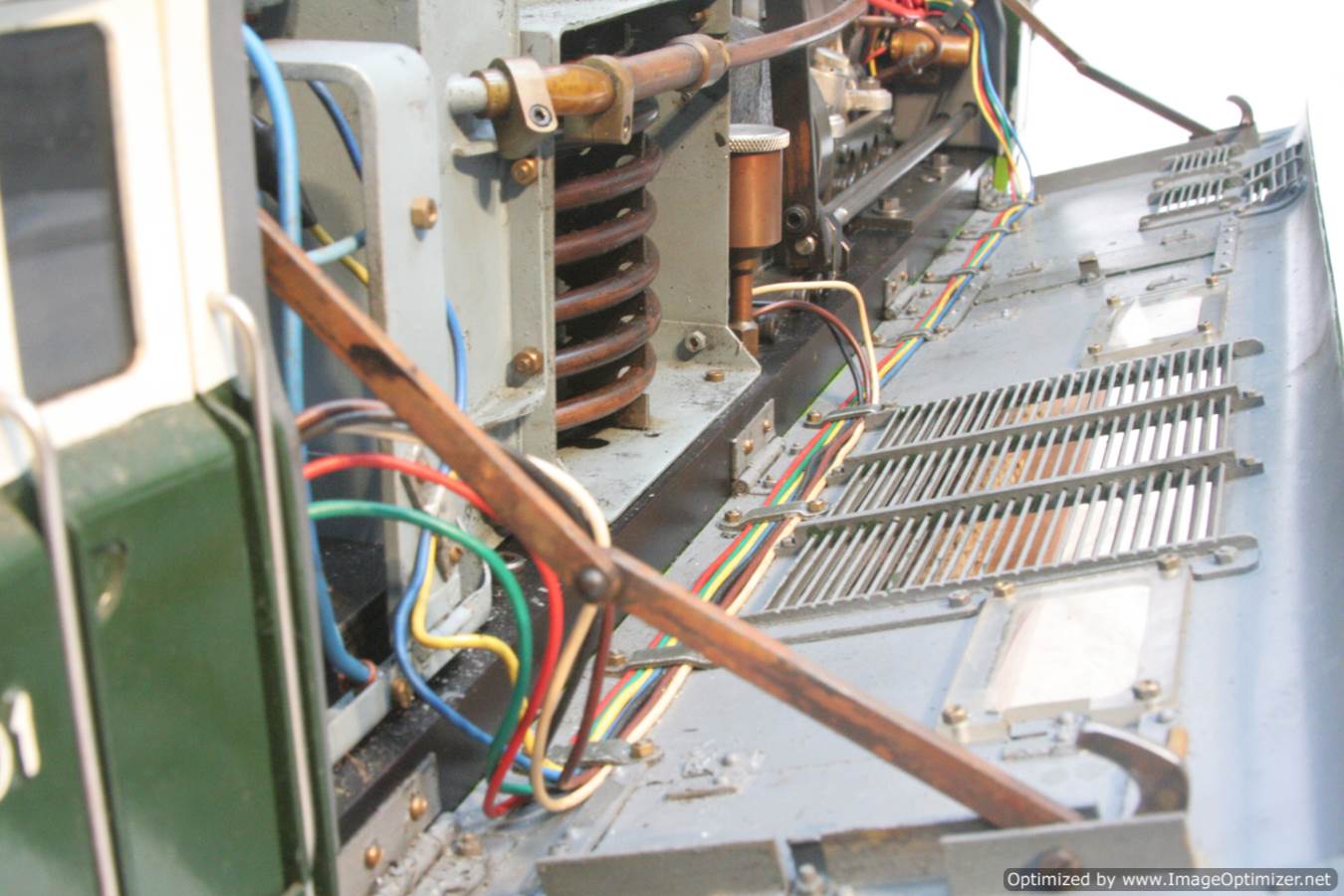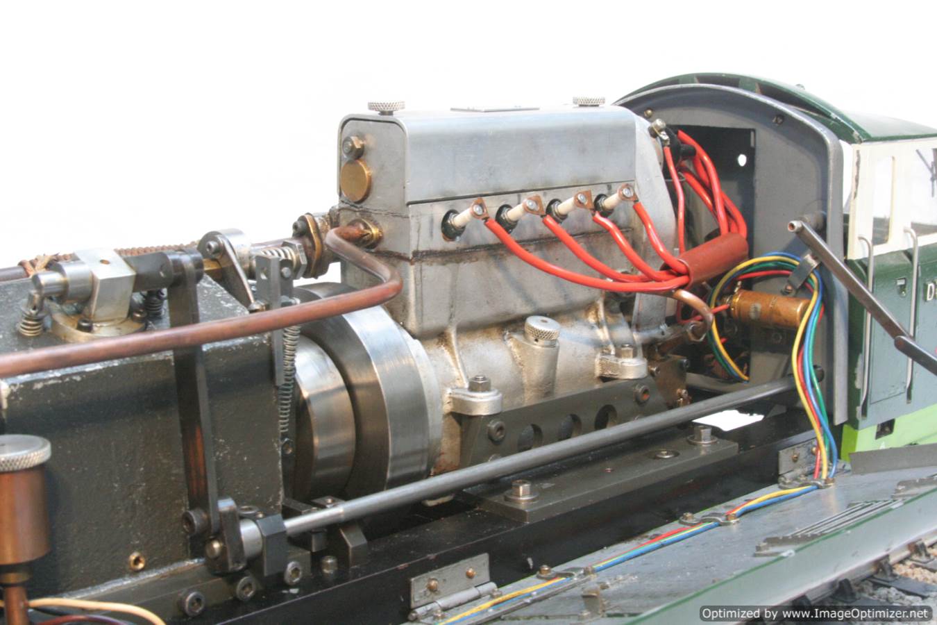 Built with a model engineer made Edgar T Westbury designed straight 4 cylinder 'Sealion' engine, this is a very well thought out and neatly packaged model. The model is powered by a pull start, whereupon the revs are then controlled by one of the handles protruding at the 'driver's' end of the model. The forward and reverse gearbox, controlled through a clutch is in the middle, transferring drive to both bogies and all wheels. The exhaust is fed into the blades of the cooling fan, and released through the tips of the blades, forcing it to spin. The cooling air is then pulled over a coiled water tube in a drum to keep things the right temperature. Water is balanced with a header tank as you might expect.