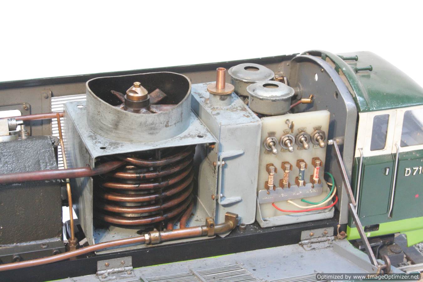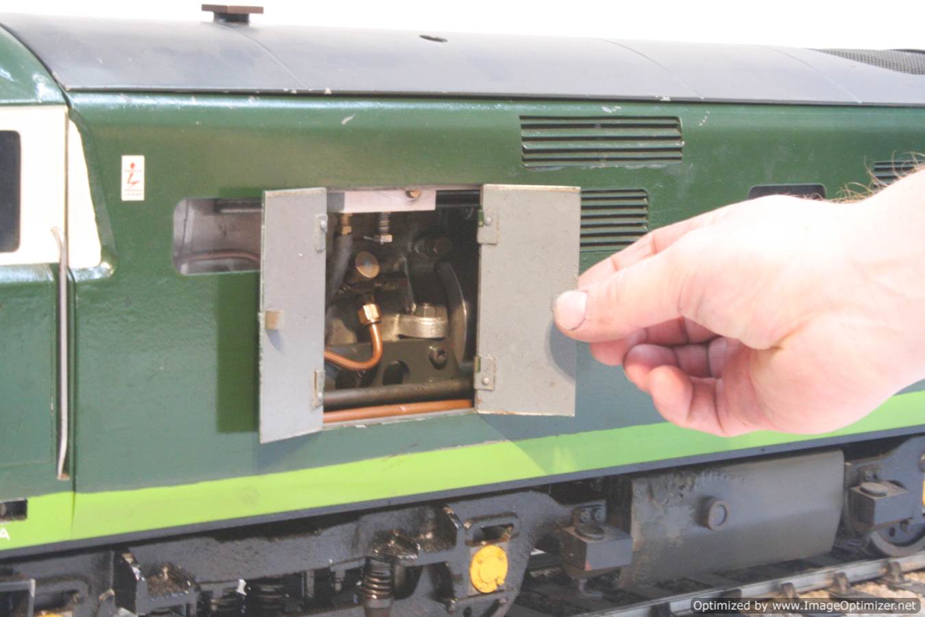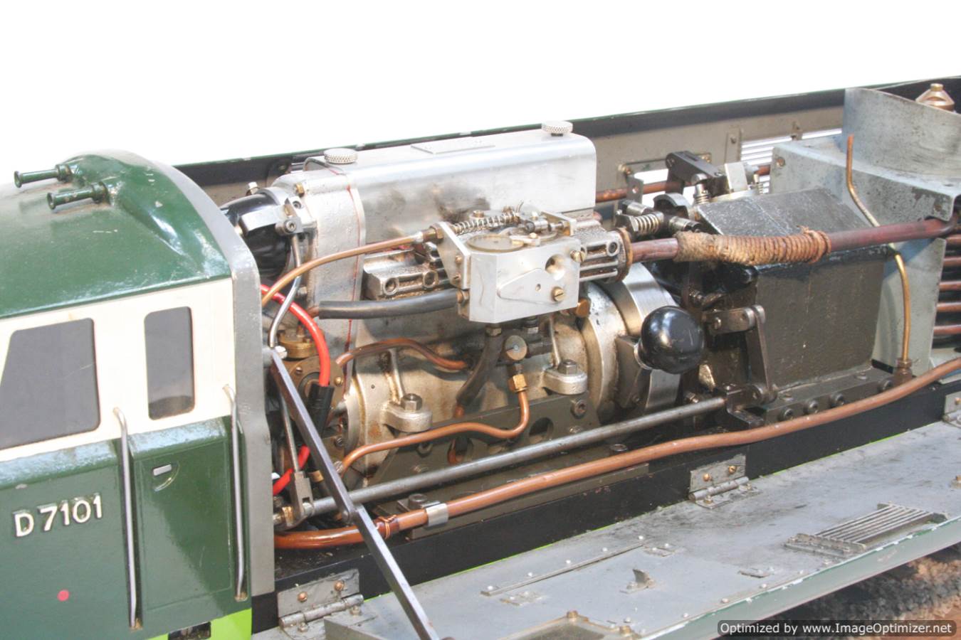 Here we have a rather special little thing. A petrol engined, full mechanical drive 3 1/2" gauge BR Class 35 Hymek! For some inexplicable reason, diesels are rare in 3 1/2" gauge for a start, but a well detailed, 'real' engined loco is rare as hen's teeth!