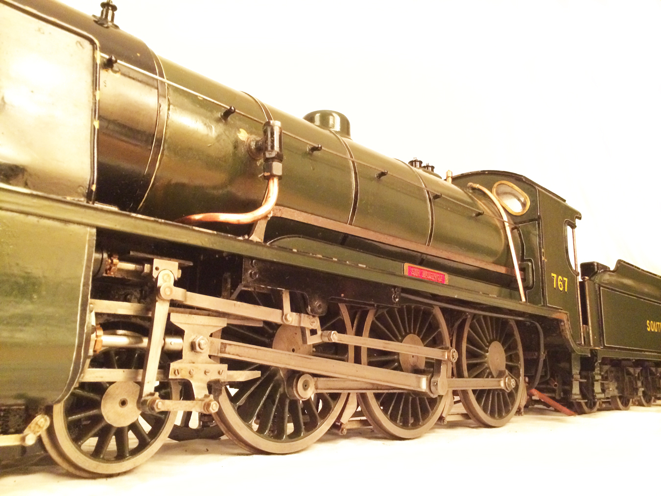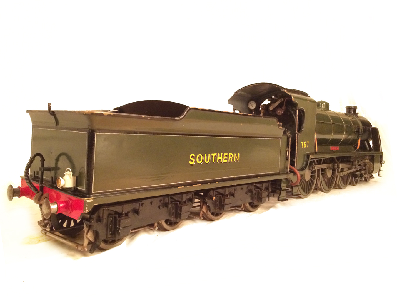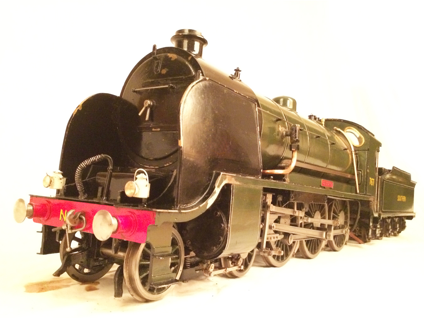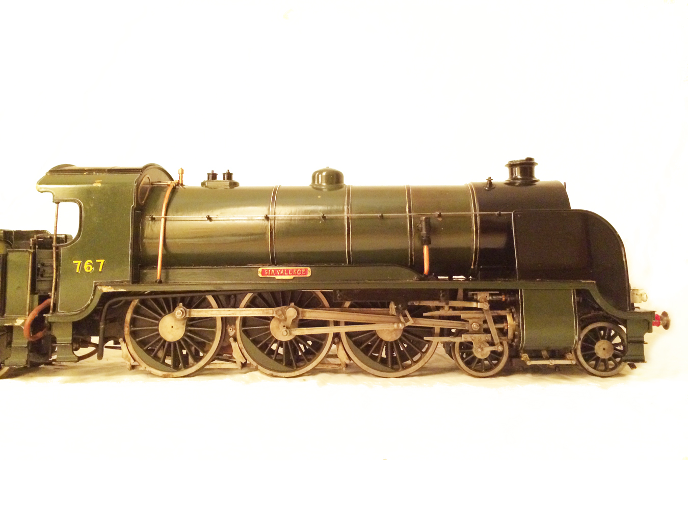 Here we have a rather nice 3 1/2" gauge model of a Southern Railway N15 King Arthur 4-6-0. It is a well used model, having been constructed in 1972 and so shows the usual signs of having been a good club runner and is a nicely built model. Numbered as 767 'Sir Valence', it's painted in Southern dark green, and is nicely lined out. It will be touched up a little in our paintshop very shortly, but I thought you good people would be able to see past the odd paint chip, so here she is in all her current glory!