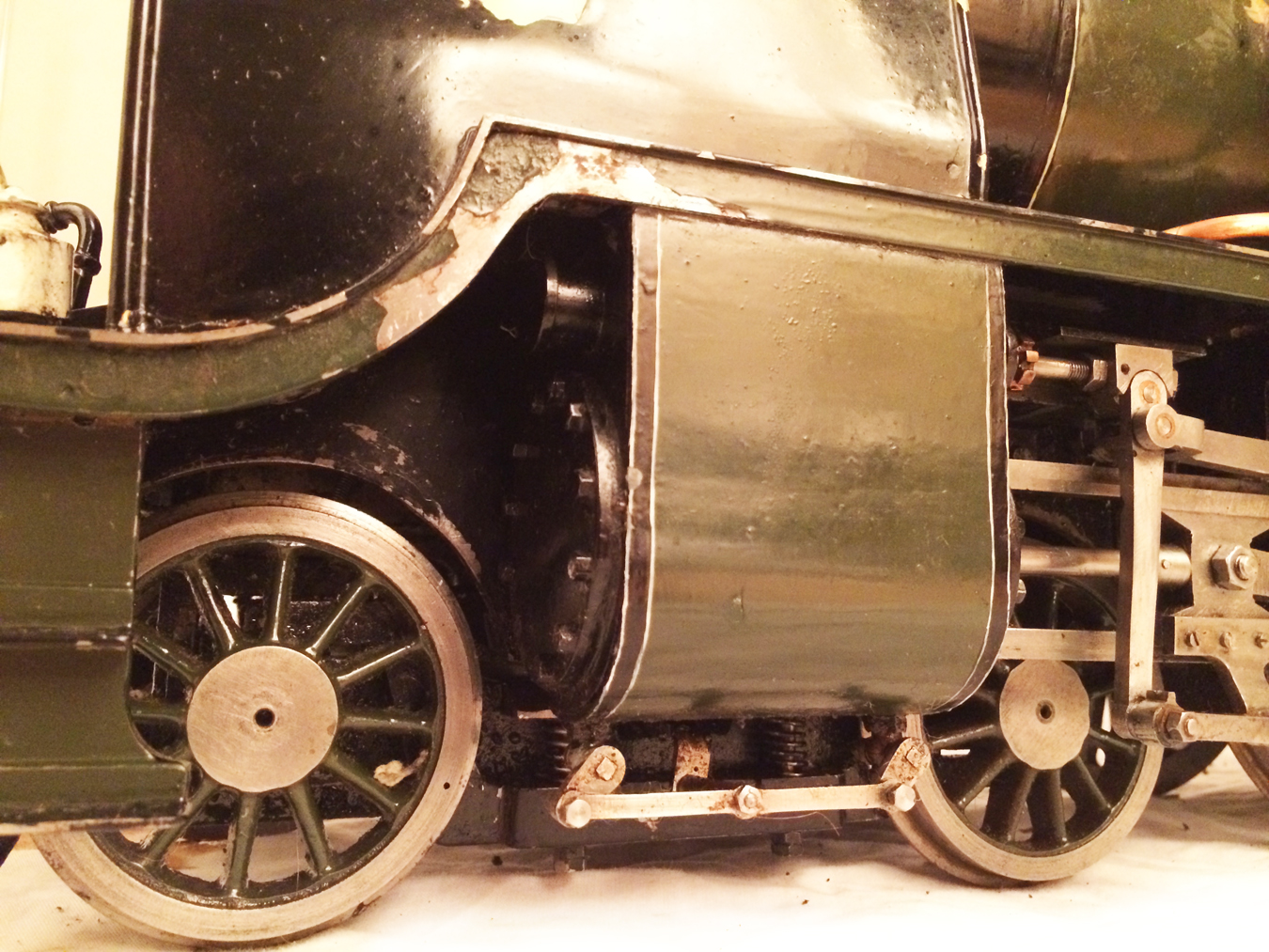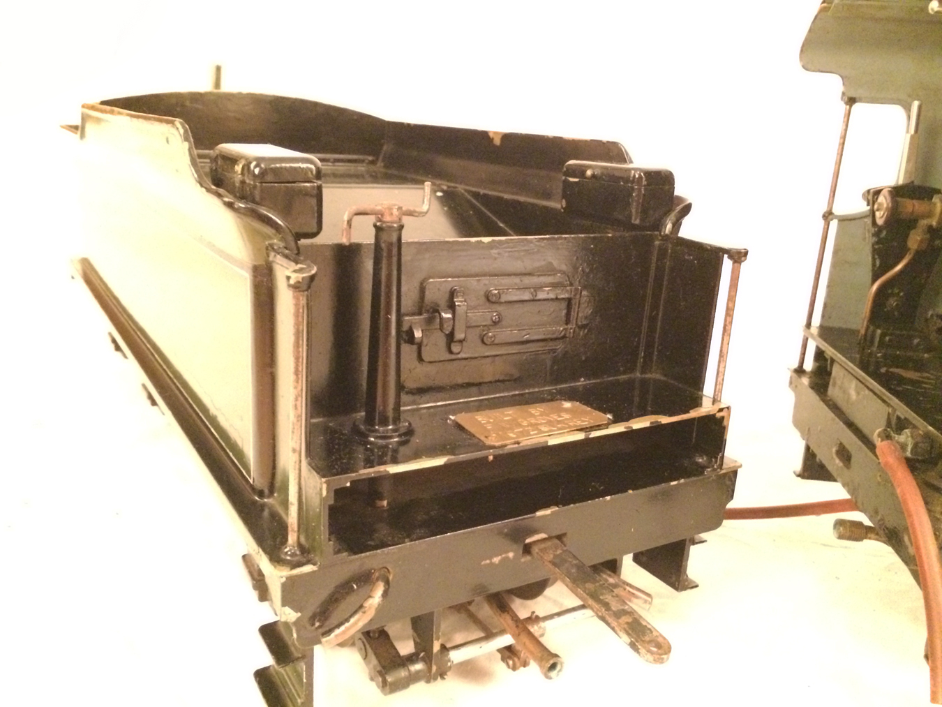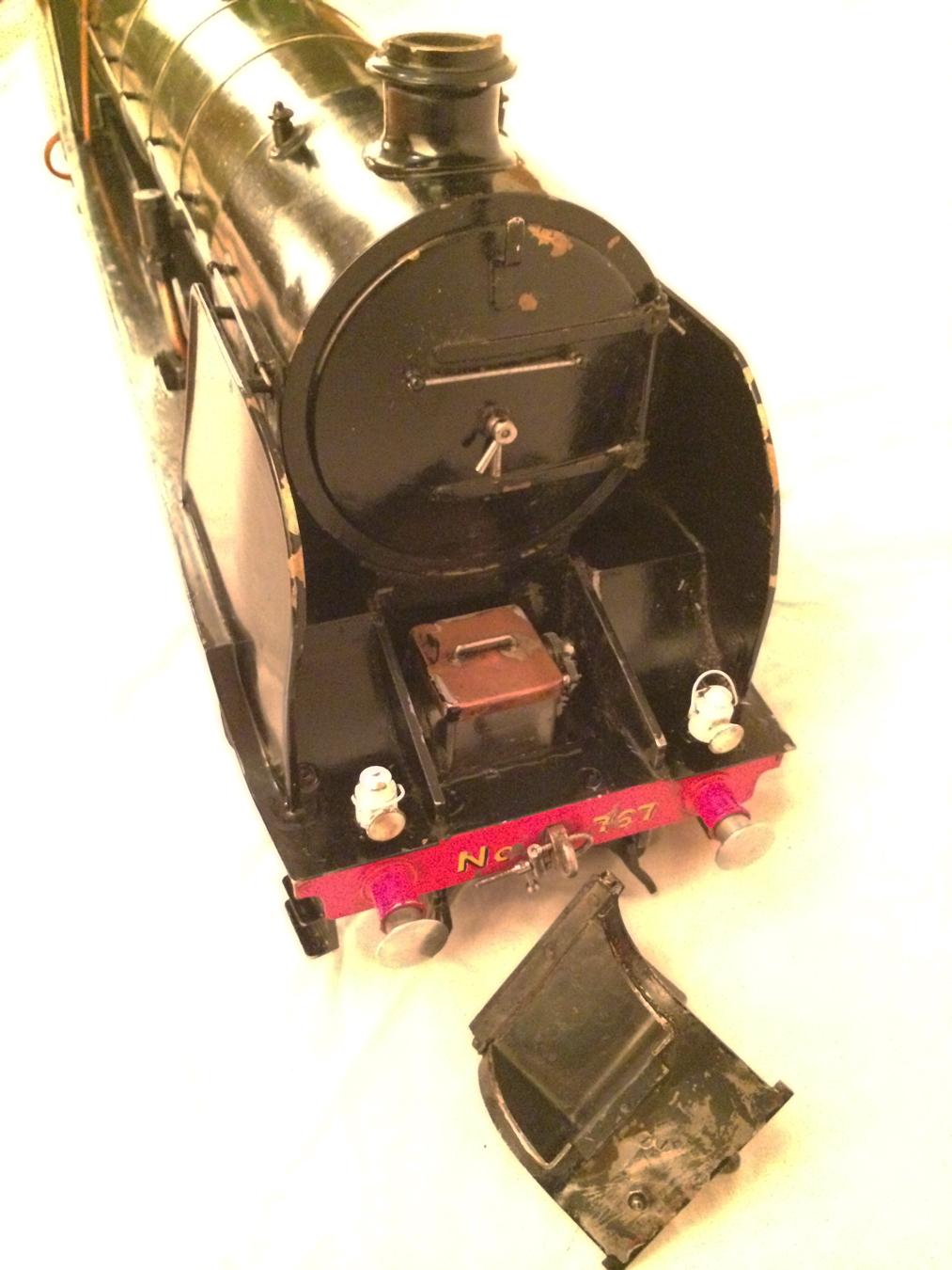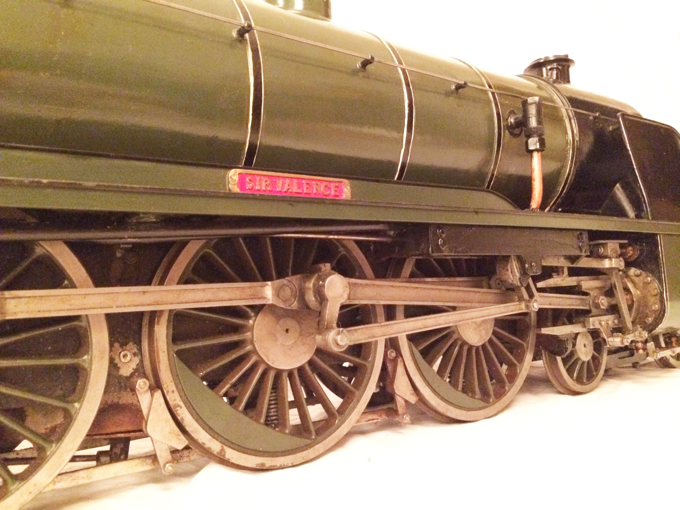 Here we have a rather nice 3 1/2" gauge model of a Southern Railway N15 King Arthur 4-6-0. It is a well used model, having been constructed in 1972 and so shows the usual signs of having been a good club runner and is a nicely built model. Numbered as 767 'Sir Valence', it's painted in Southern dark green, and is nicely lined out. It will be touched up a little in our paintshop very shortly, but I thought you good people would be able to see past the odd paint chip, so here she is in all her current glory!