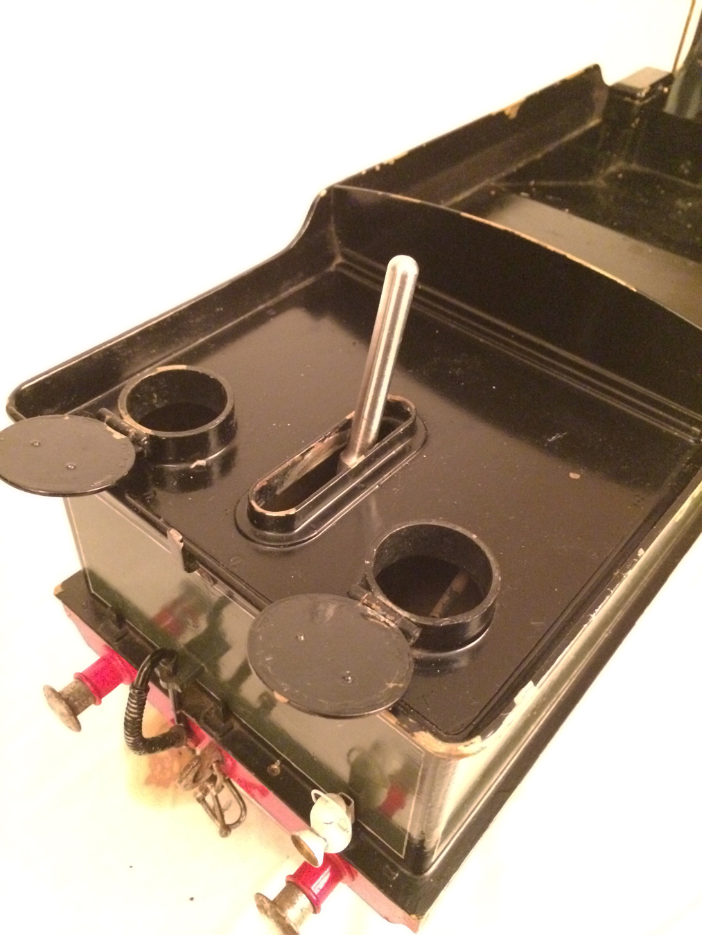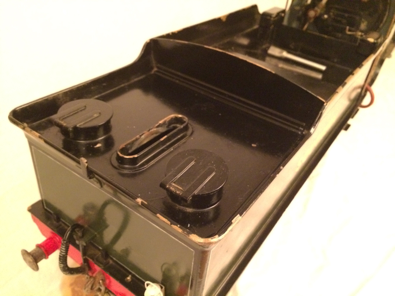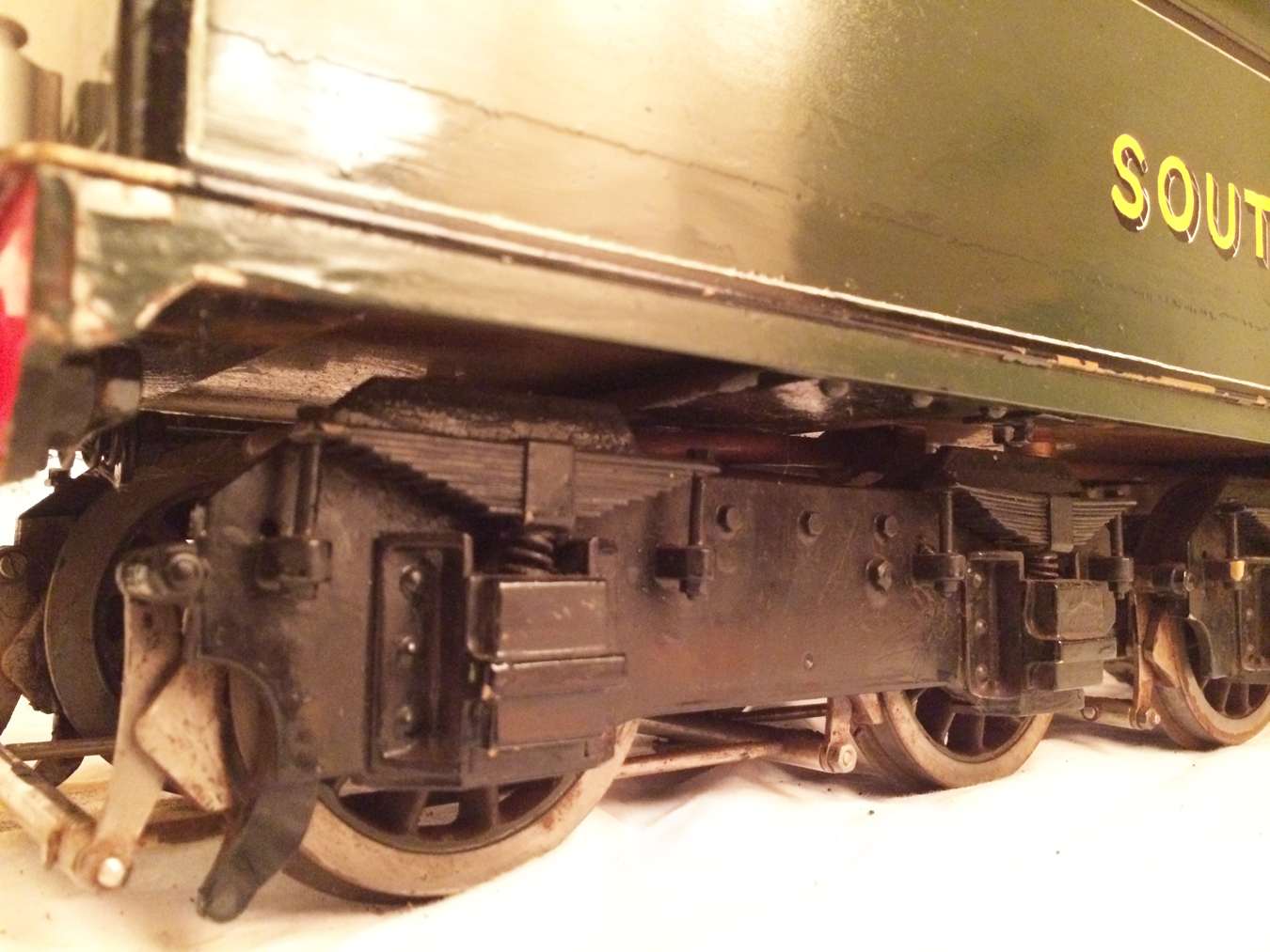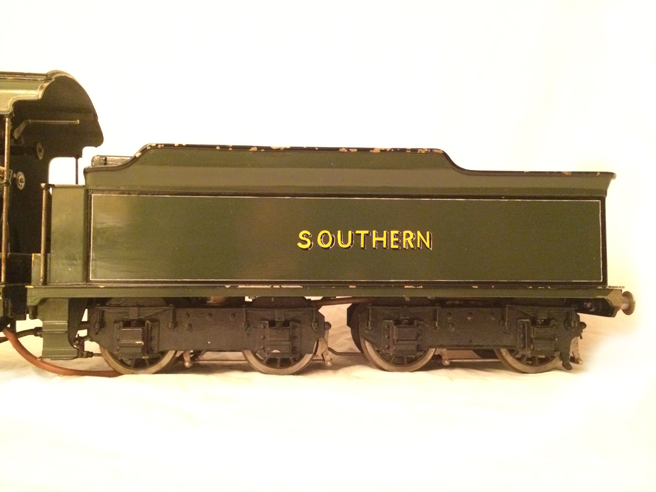 Here we have a rather nice 3 1/2" gauge model of a Southern Railway N15 King Arthur 4-6-0. It is a well used model, having been constructed in 1972 and so shows the usual signs of having been a good club runner and is a nicely built model. Numbered as 767 'Sir Valence', it's painted in Southern dark green, and is nicely lined out. It will be touched up a little in our paintshop very shortly, but I thought you good people would be able to see past the odd paint chip, so here she is in all her current glory!