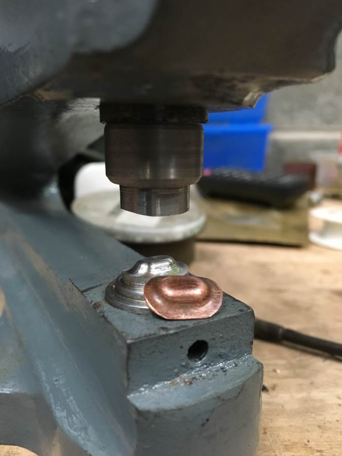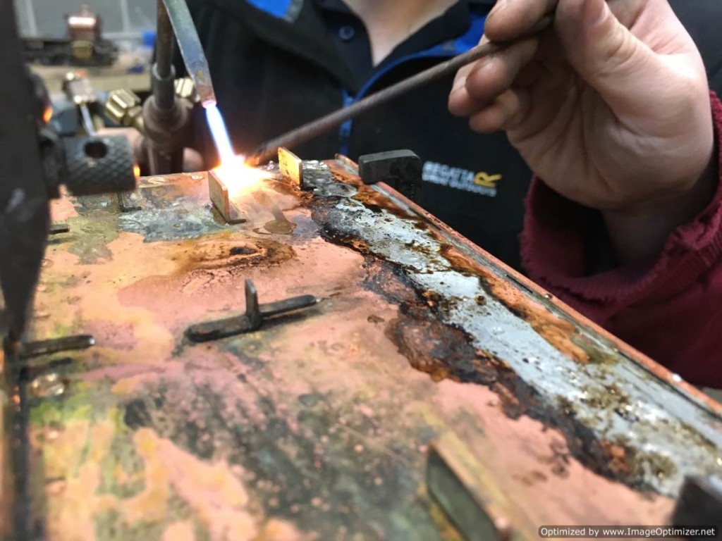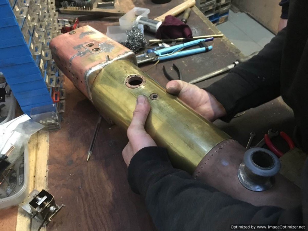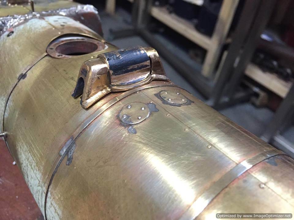 The top end benefited from considerable added detail and re-worked cladding. The main barrel cladding was entirely scrapped, and we've added detail such as the washout plugs, inspection covers and even the central split line with tiny bolt detail down the seam. The firebox cladding was extensively re-worked. The front edge was moved further back so that the radius could be eased off a little. It was quite sharp on the original loco. Again, washout plugs were manufactured and soldered onto the back face of the cladding (note we put them all on at different angles,..... irritating when you see a model with them all aligned). We made a press tool to make the top inspection covers, which turned out particularly well, and together with the split line and rivet detailing on the sides really finishes off the firebox detail.