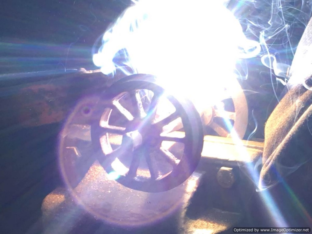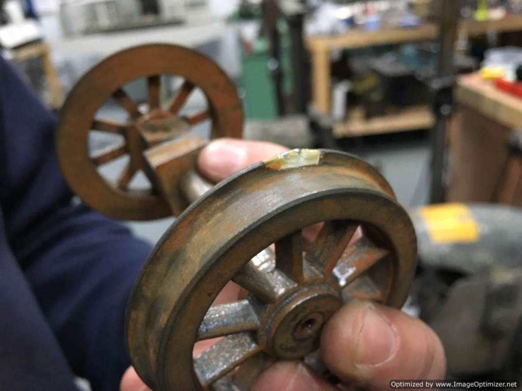 At this point we spotted we had a little problem with one of the bogie wheels. The cast iron flange had been chipped at some point, and repaired in fine Heath Robinson fashion! A couple of holes drilled, some nails crammed in and then the whole thing filled with car body filler. To be fair,.... it had obviously worked! We obviously stripped it all off, cleaned up the face of the chip and cast iron welded a lump into the hole, which was then machined back to the correct profile.