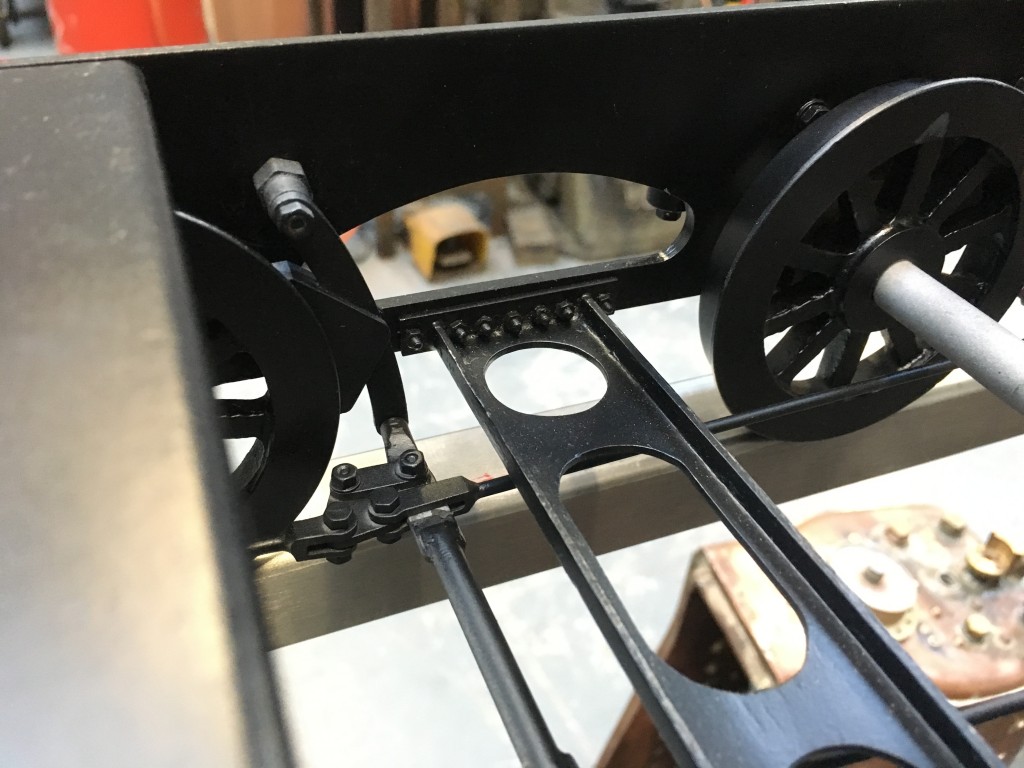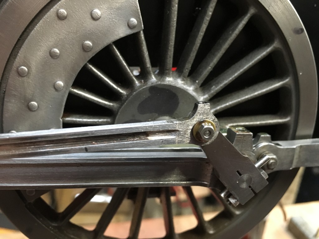 Next it was time to press the wheels onto the axles and re-assemble the valve gear. The return crank was set and we had to chop and extend the eccentric rod to get the timing to work as nicely as we wanted. If you look closely at the last of the 4 photos here you can see the subtle silver solder lines showing where we added a segment. It's obviously been cleaned up and nicely shaped since, so you can hardly see the join now.