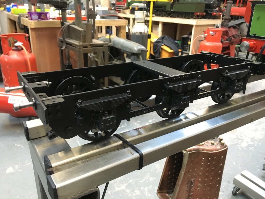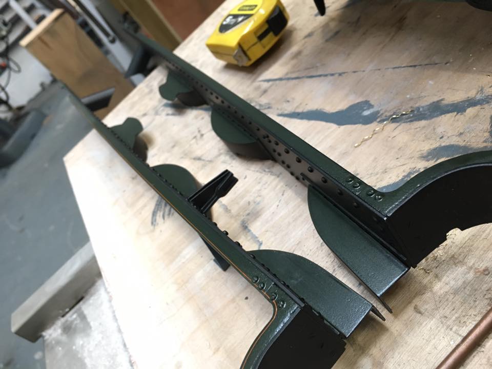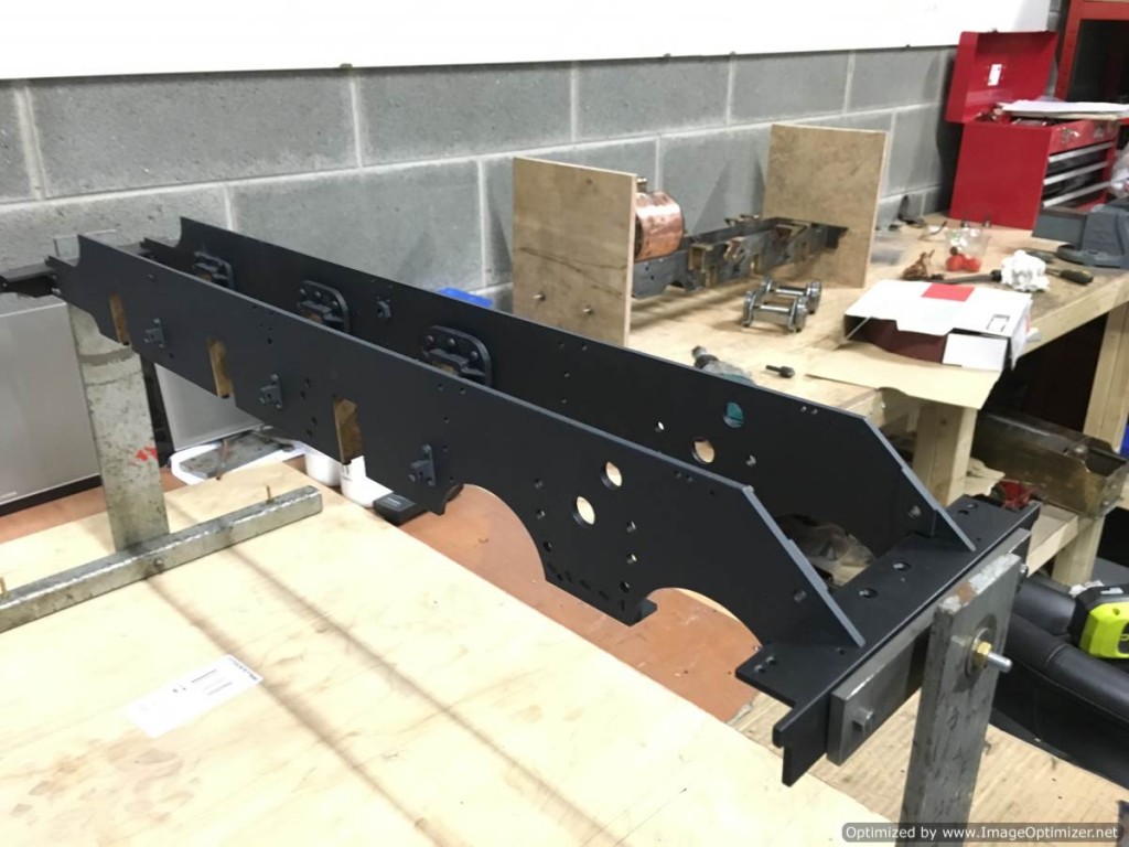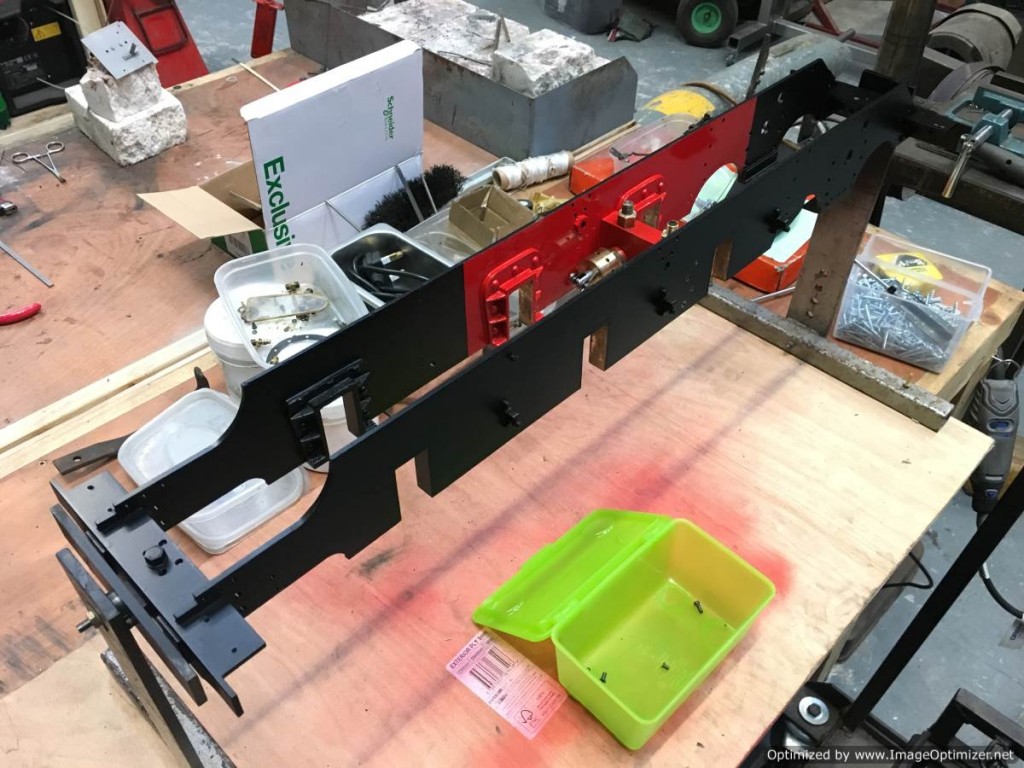 The tender frames were completely disassembled, stripped right back to the bare frames, bead blasted, etch primed and then re-painted. We will spare you the individual photos, but this it the tender chassis in it's re-built state, ready to take the body. The detail is very nice, and certainly justifies the rebuild that we are doing on it.