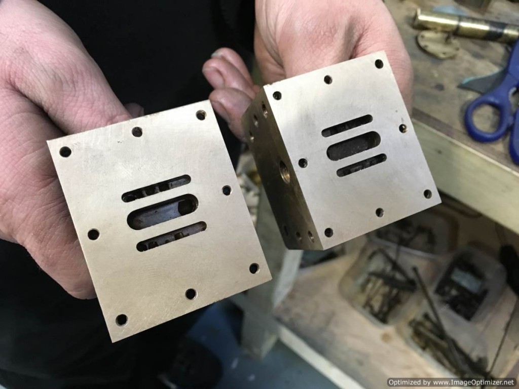 The cylinders! They needed a bit of work. The port faces were skimmed up and re-faced to make sure that all the steam seals were tight and that the loco should have a nice crisp bark. But if you look at the original photos, the loco, being slide valve has the usual square topped valve chest on top of the cylinders, which cuts quite intrusively into the running board valance,.... and frankly looks horrible. So,.... the decision was taken to reduce the height of the valve chest in the milling machine. This obviously meant that the valve it's self would also need skimming down to fit inside the now shallower valve chest. We were limited by the position of the valve spindle it's self, and also the consideration of ensuring that the valve chest was still big enough in volume to allow the steam to flow fast enough to make the loco perform. But all that in mind, we finished off the top valve chest cover with a radius to enable the new cylinder cladding to now curve under the valance, more or less as it should on the full size. A little bit of a compromise on this, as there just wasn't enough 'meat' in the block to get as gentle a shape as we would have liked, but a considerable improvement over the square topped jobbies!