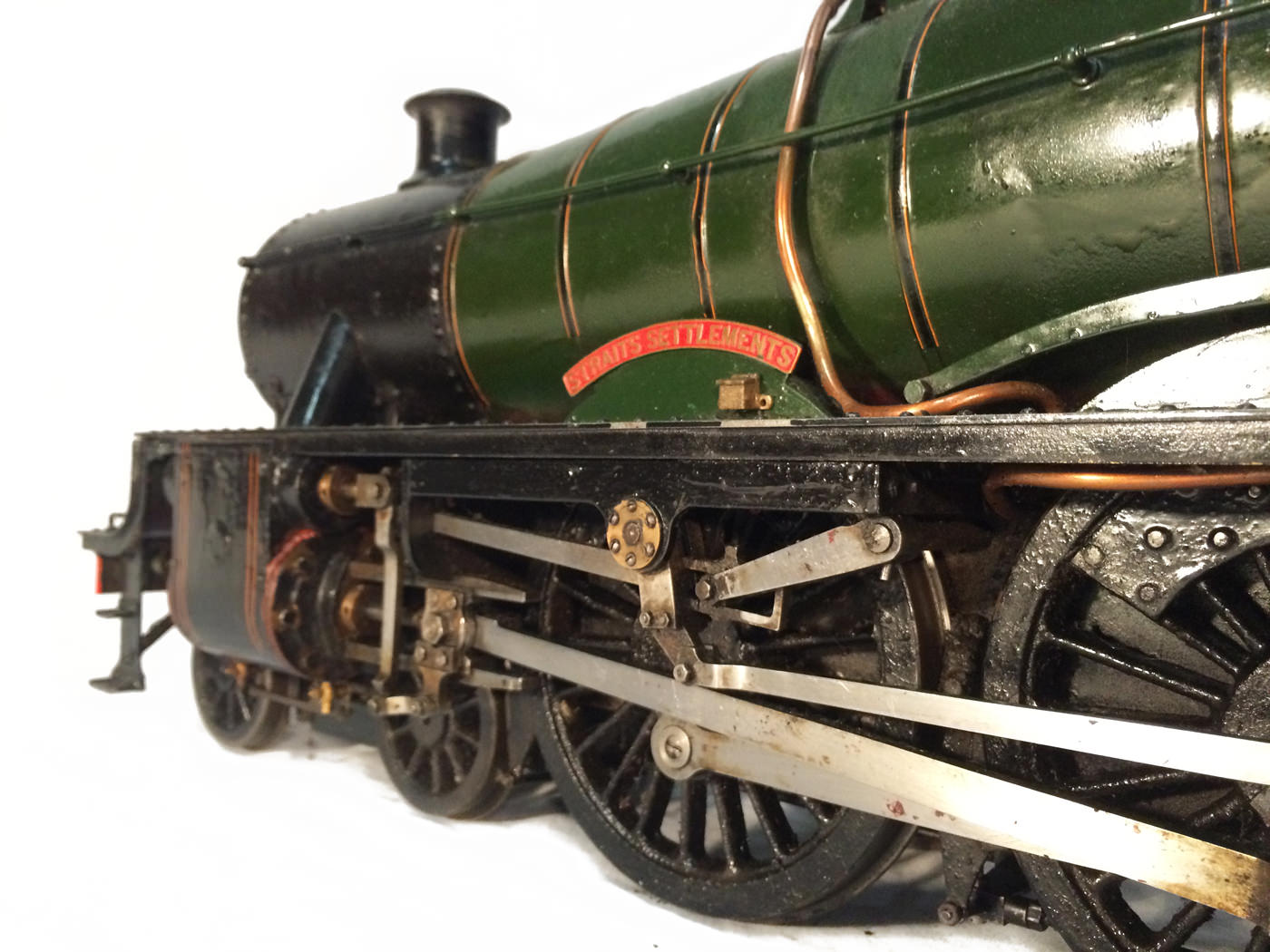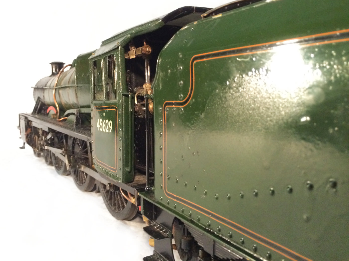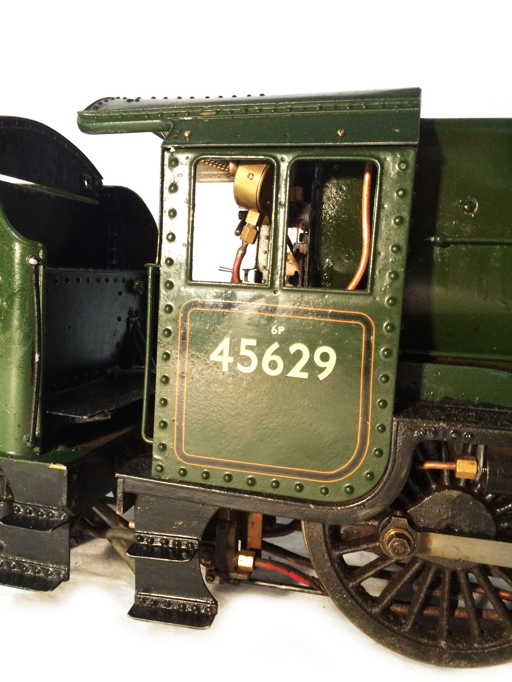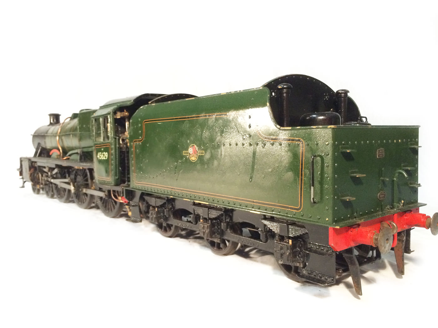 Here we have another rare little thing. A 3 1/2" gauge LMS Stanier Jubilee, 45629 'Straits Settlements'. Although this is only a 2 cylinder model, it isn't simply a black 5 (Doris) painted green! The builder has taken pains to create something different, and has successfully produced a model that certainly looks the part. This is a great proven performer too, having been enjoyed by the previous owners over the last few years, running regularly and visiting many club tracks. It's not by any stretch an exhibition piece, the paintwork being that of a well used model, but it's in good order, ready to play and will probably be the only 3 1/2" Jubilee that you're ever likely to bump into!