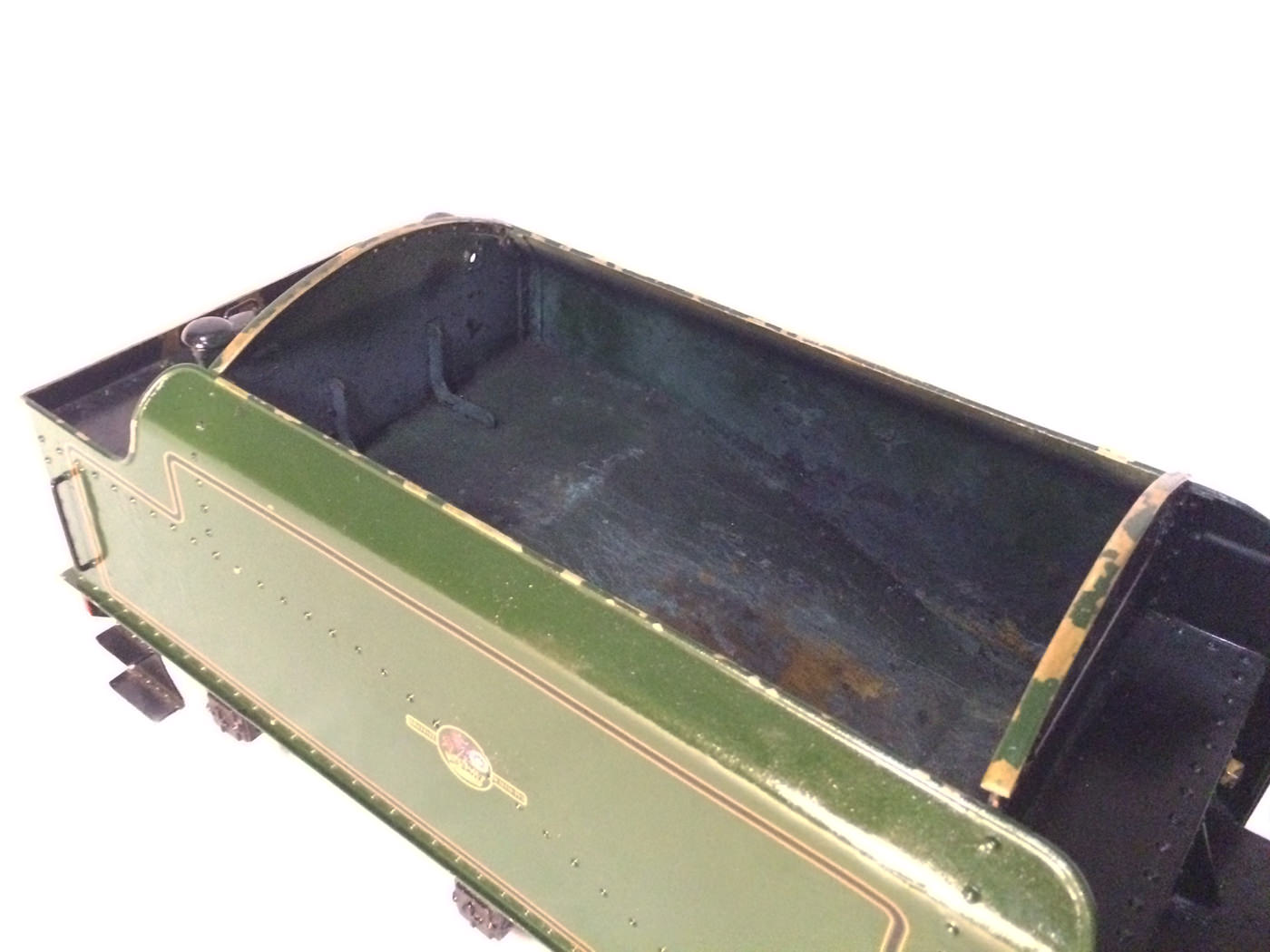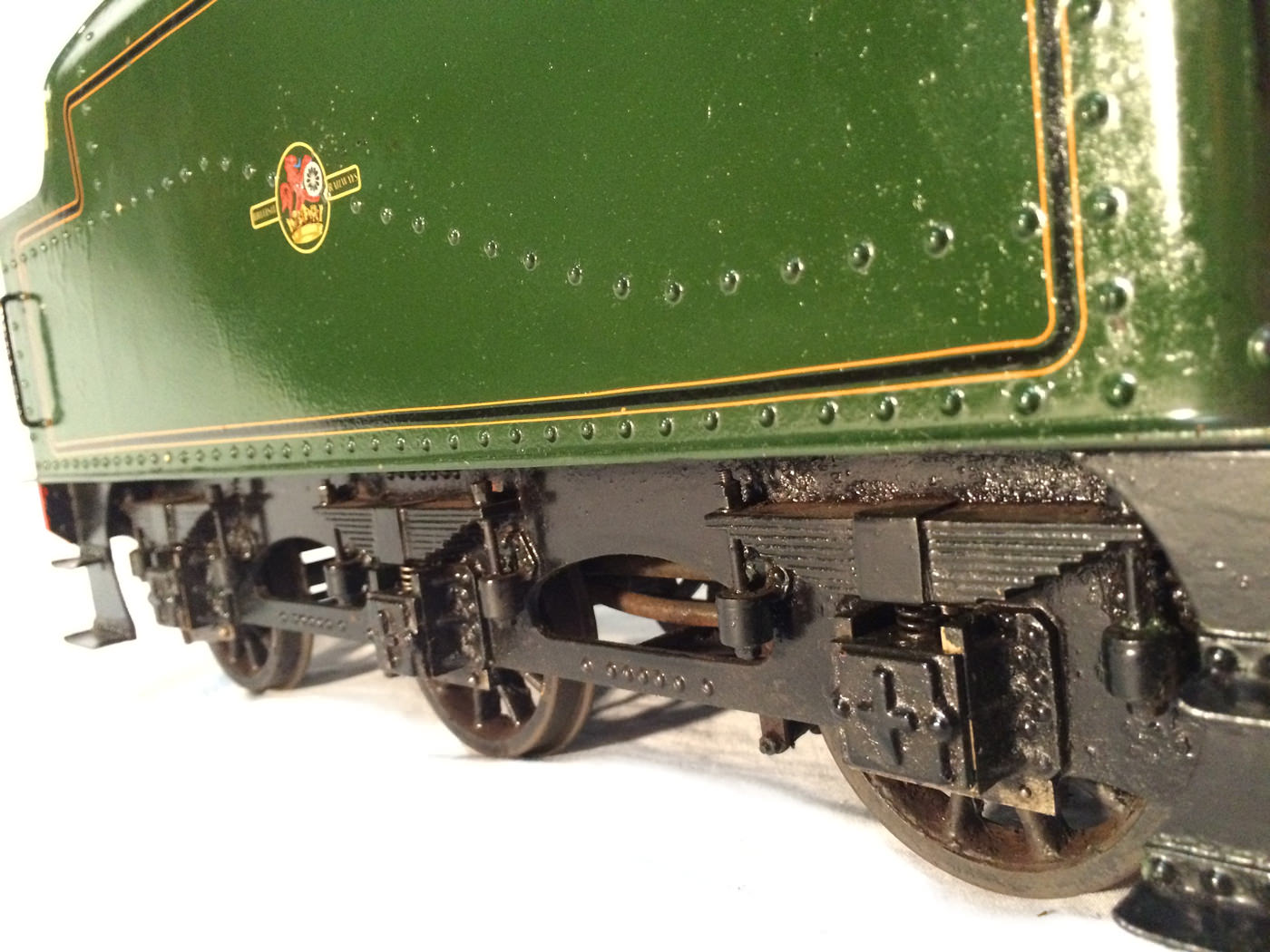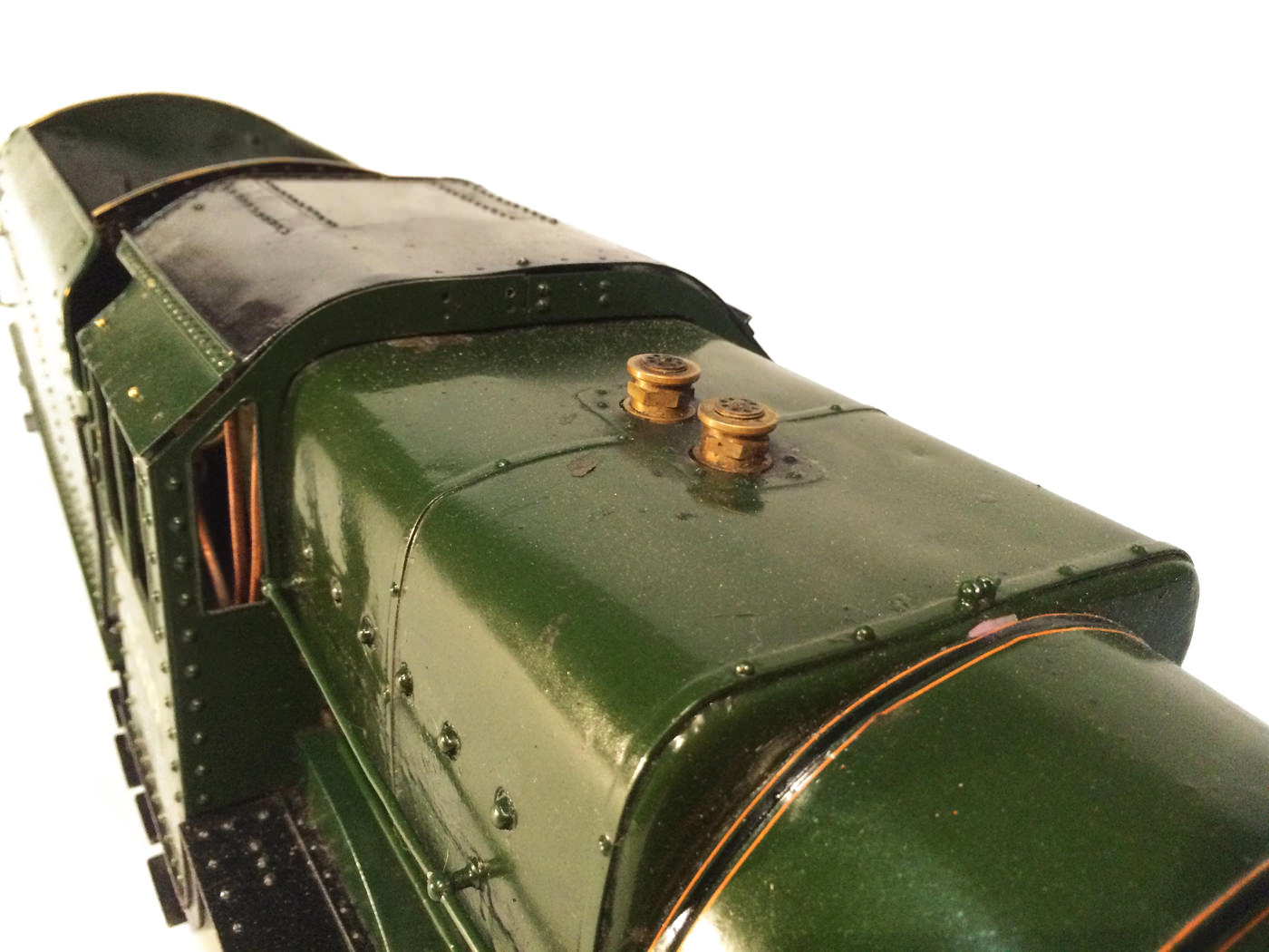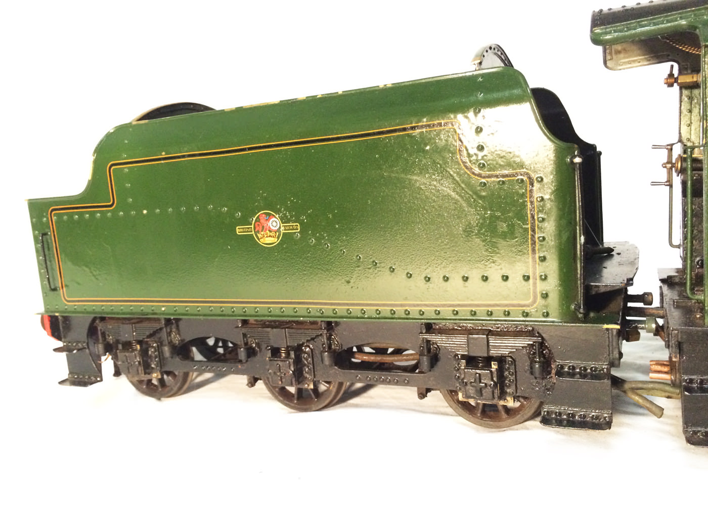Here we have another rare little thing. A 3 1/2" gauge LMS Stanier Jubilee, 45629 'Straits Settlements'. Although this is only a 2 cylinder model, it isn't simply a black 5 (Doris) painted green! The builder has taken pains to create something different, and has successfully produced a model that certainly looks the part. This is a great proven performer too, having been enjoyed by the previous owners over the last few years, running regularly and visiting many club tracks. It's not by any stretch an exhibition piece, the paintwork being that of a well used model, but it's in good order, ready to play and will probably be the only 3 1/2" Jubilee that you're ever likely to bump into!