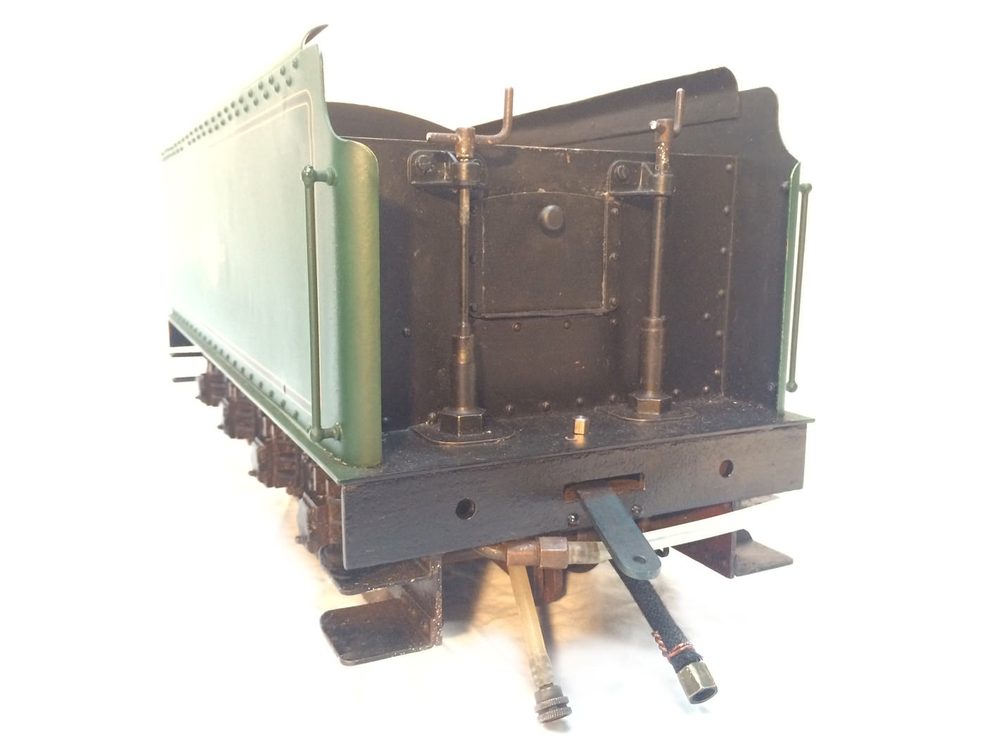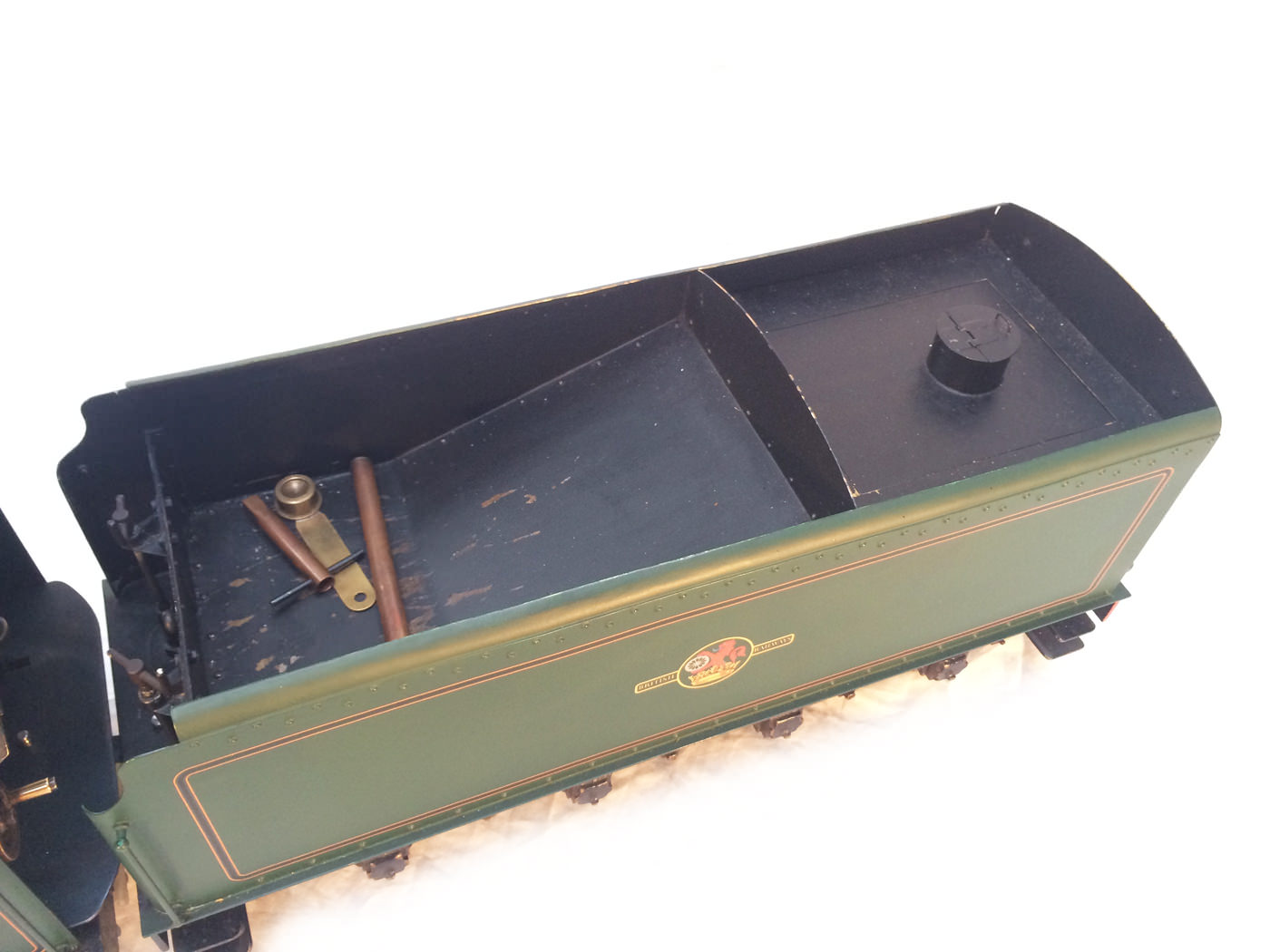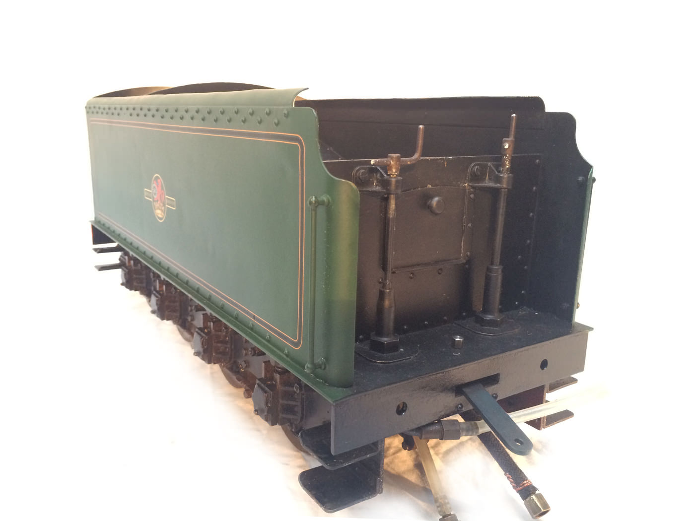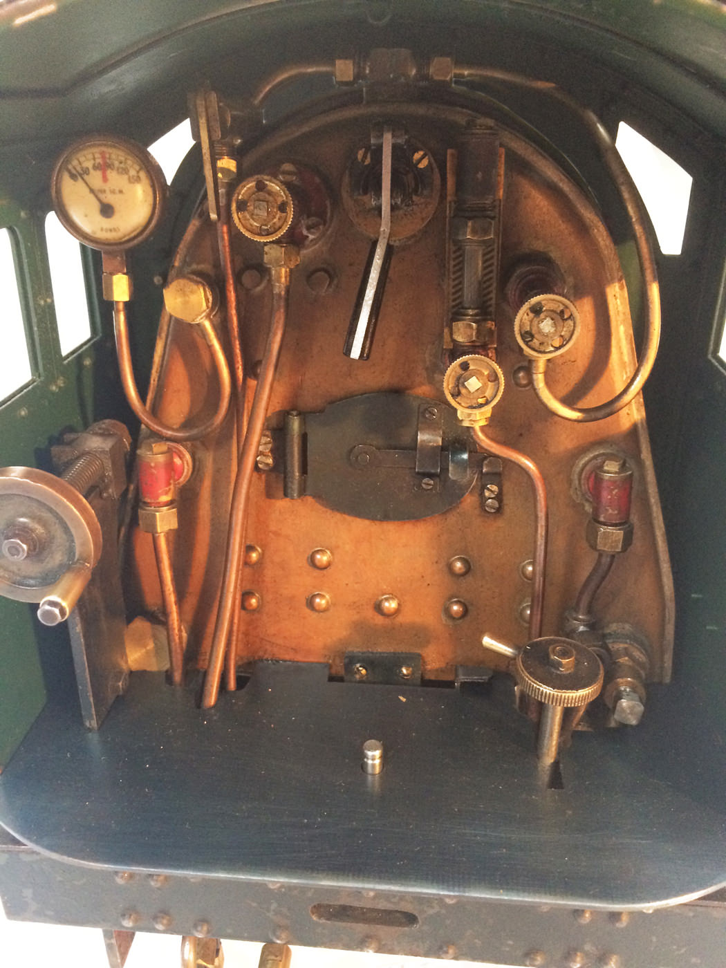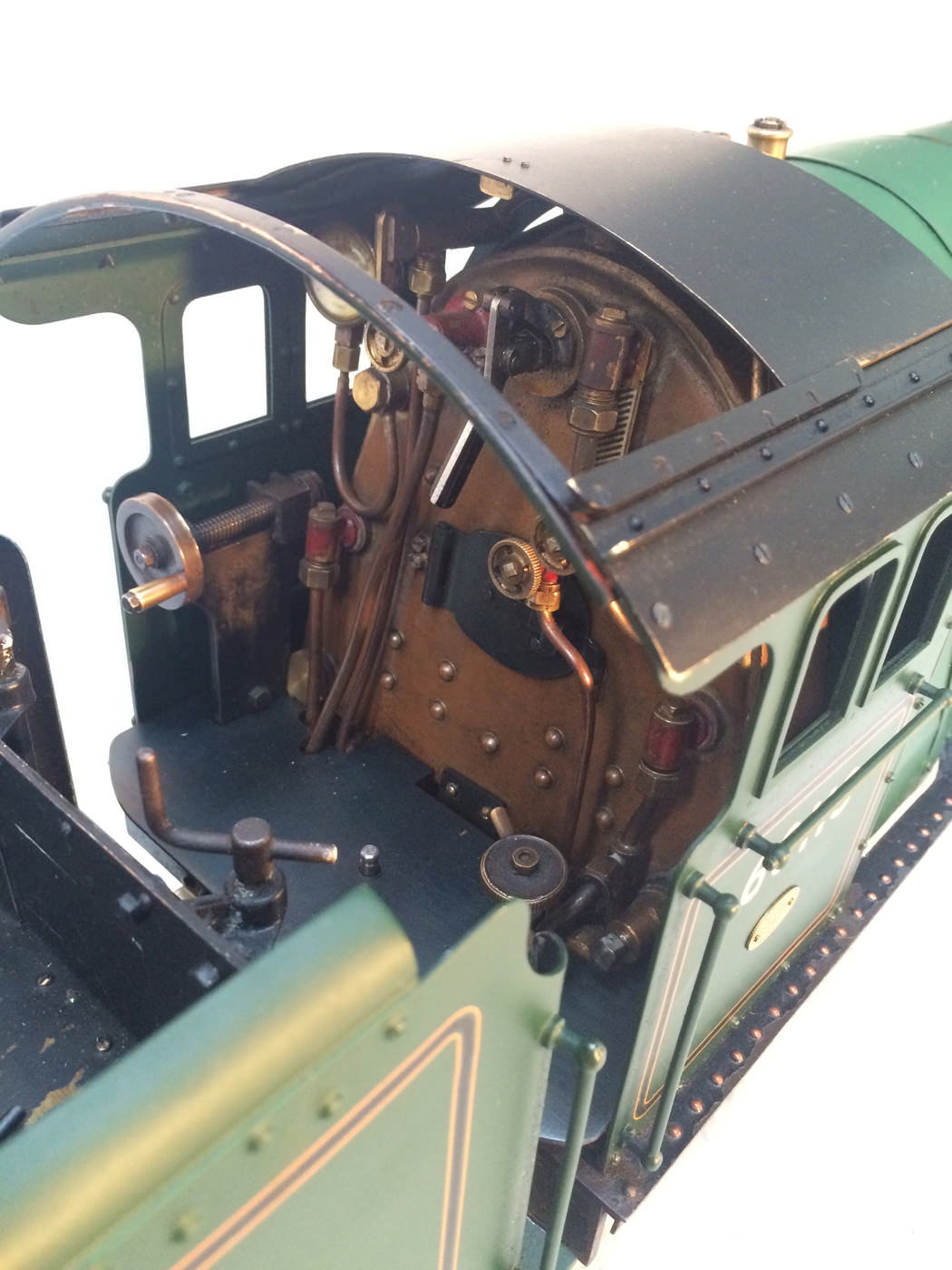 There are all the usual things, injector, mechanical axle pump, emergency hand pump in the tender. Mechanical lubricator under the front running boards and footplate operated draincocks. It has a professionally made Swindon boiler on it, and is another loco that has come to us from a very competent and careful model engineer. Fully sorted and ready to play.