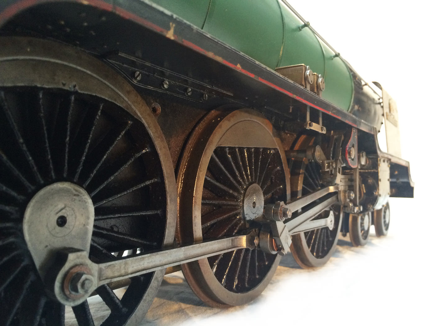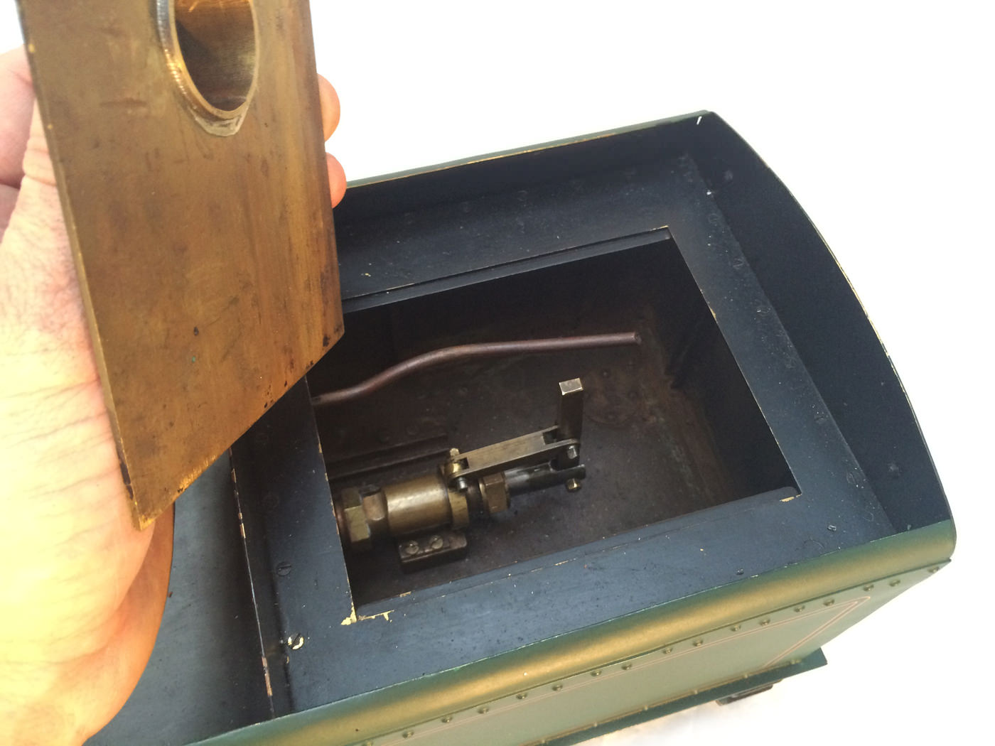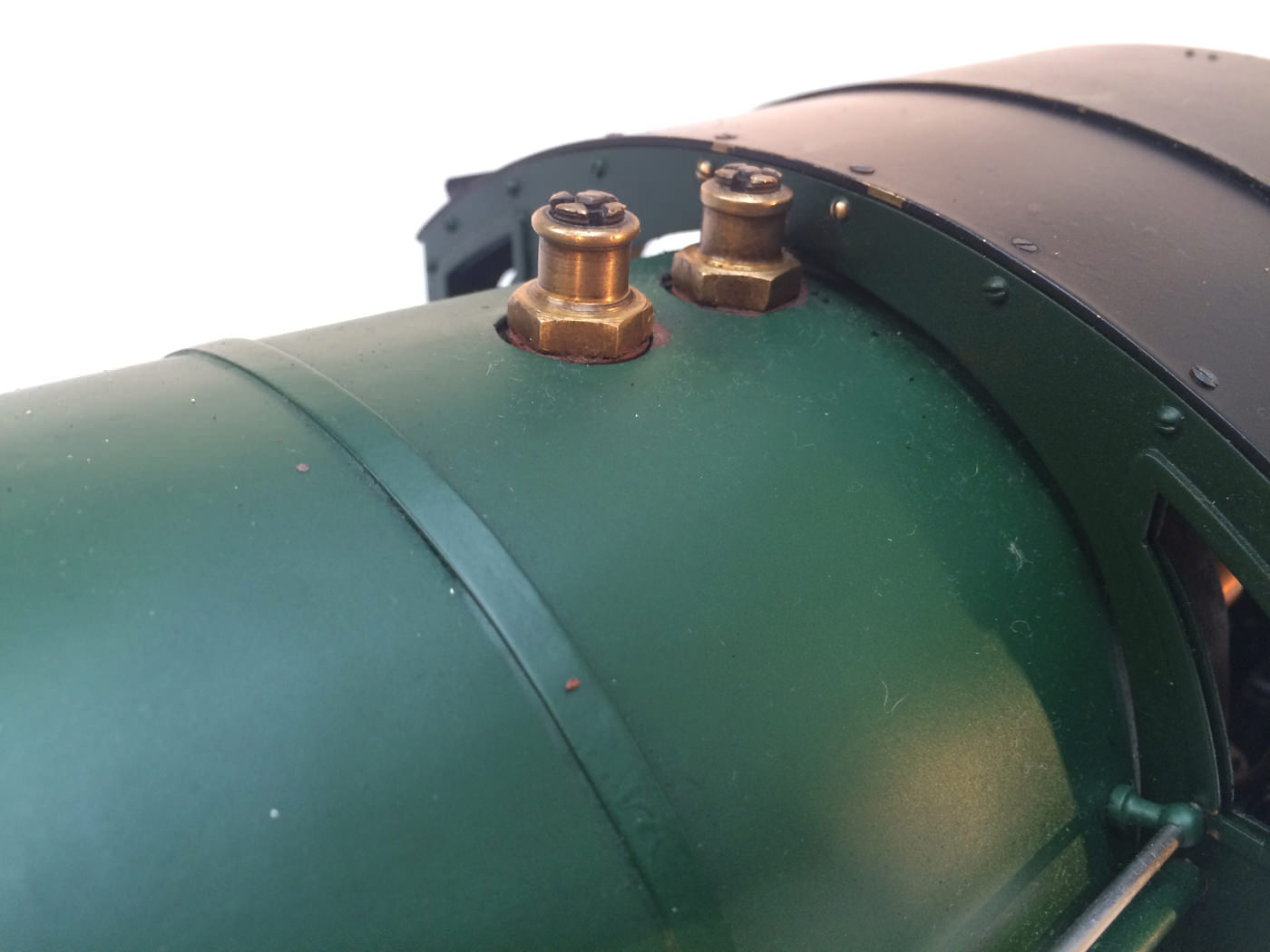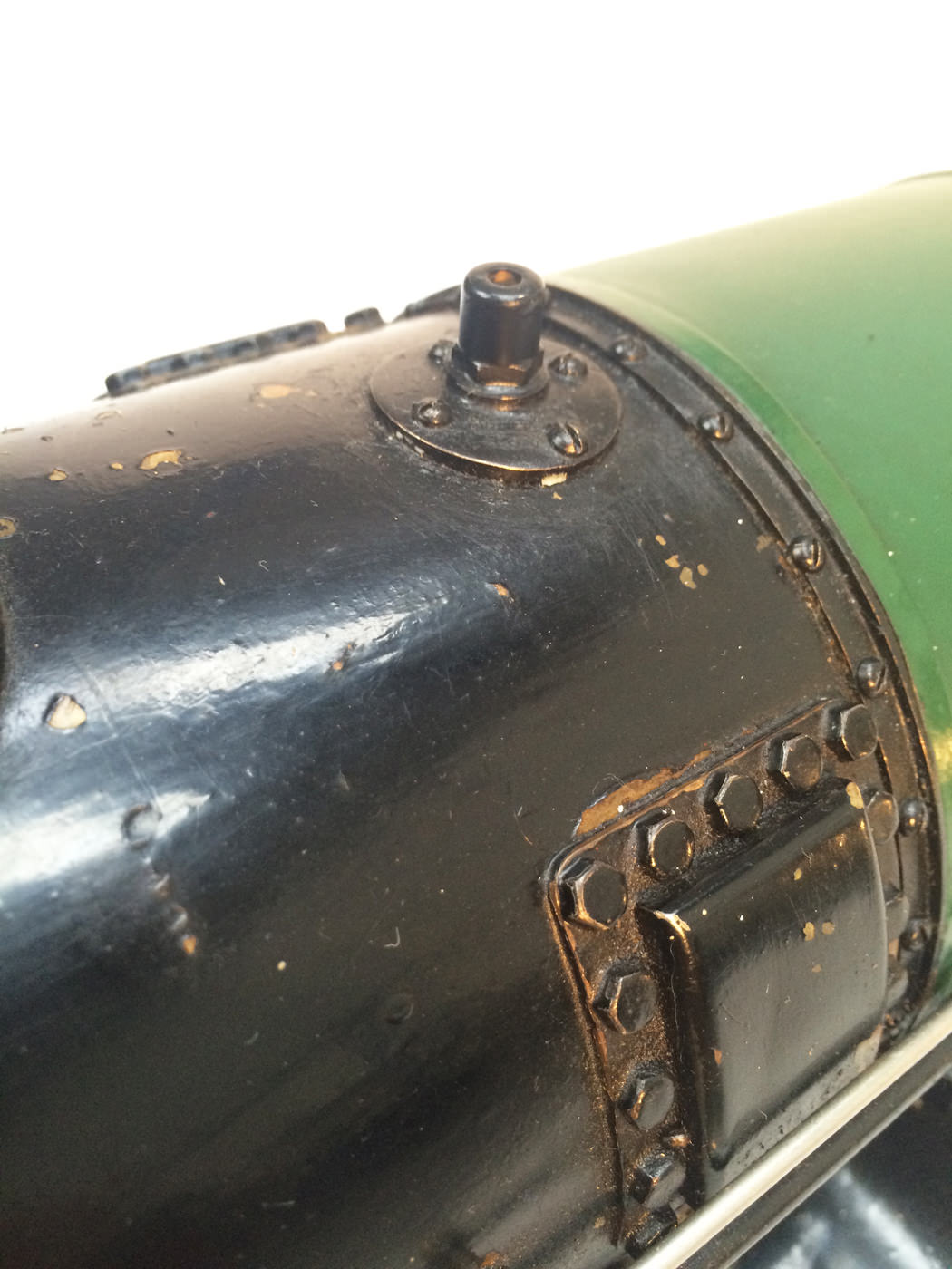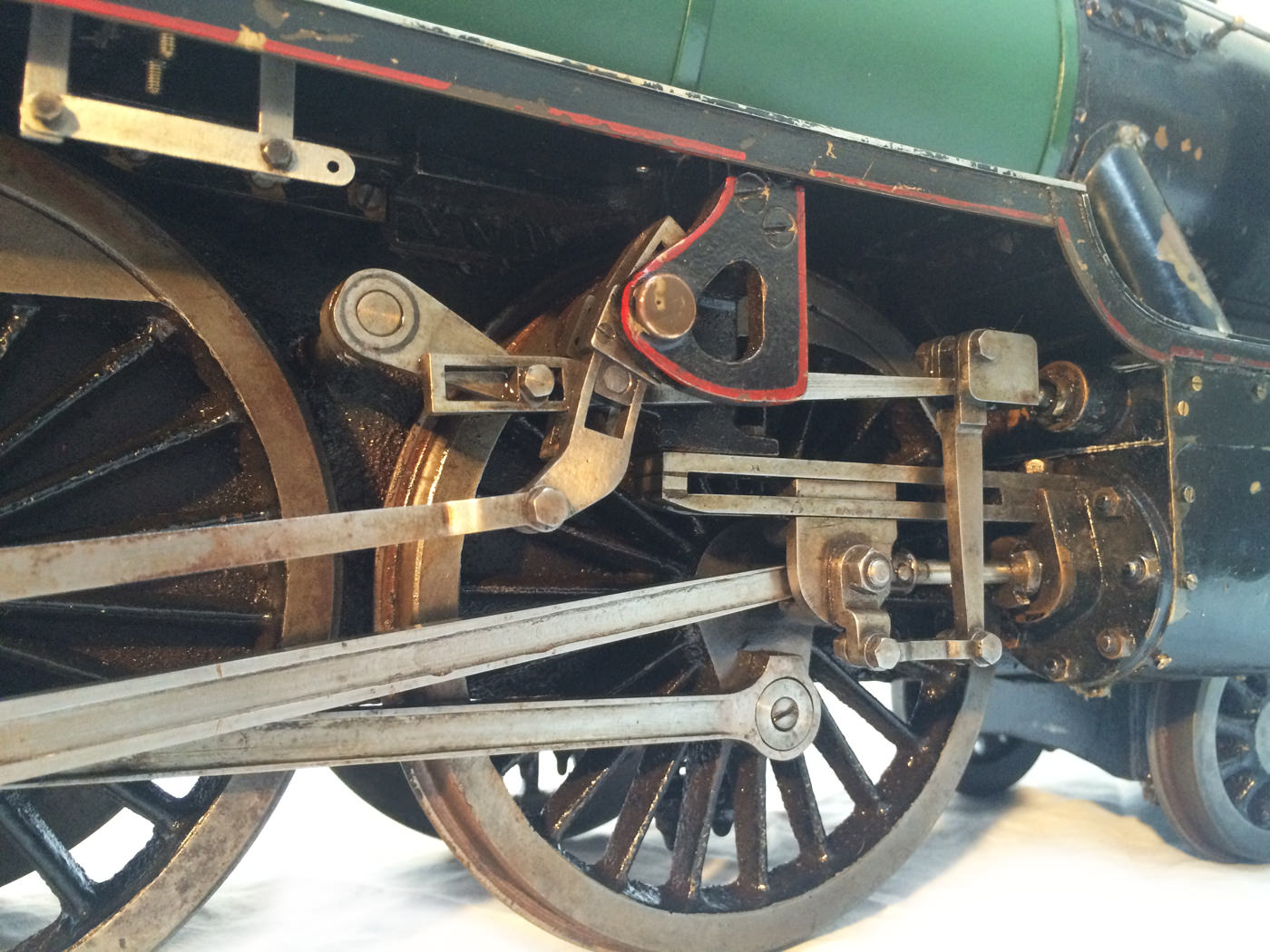 There are all the usual things, injector, mechanical axle pump, emergency hand pump in the tender. Mechanical lubricator under the front running boards and footplate operated draincocks. It has a professionally made Swindon boiler on it, and is another loco that has come to us from a very competent and careful model engineer. Fully sorted and ready to play.