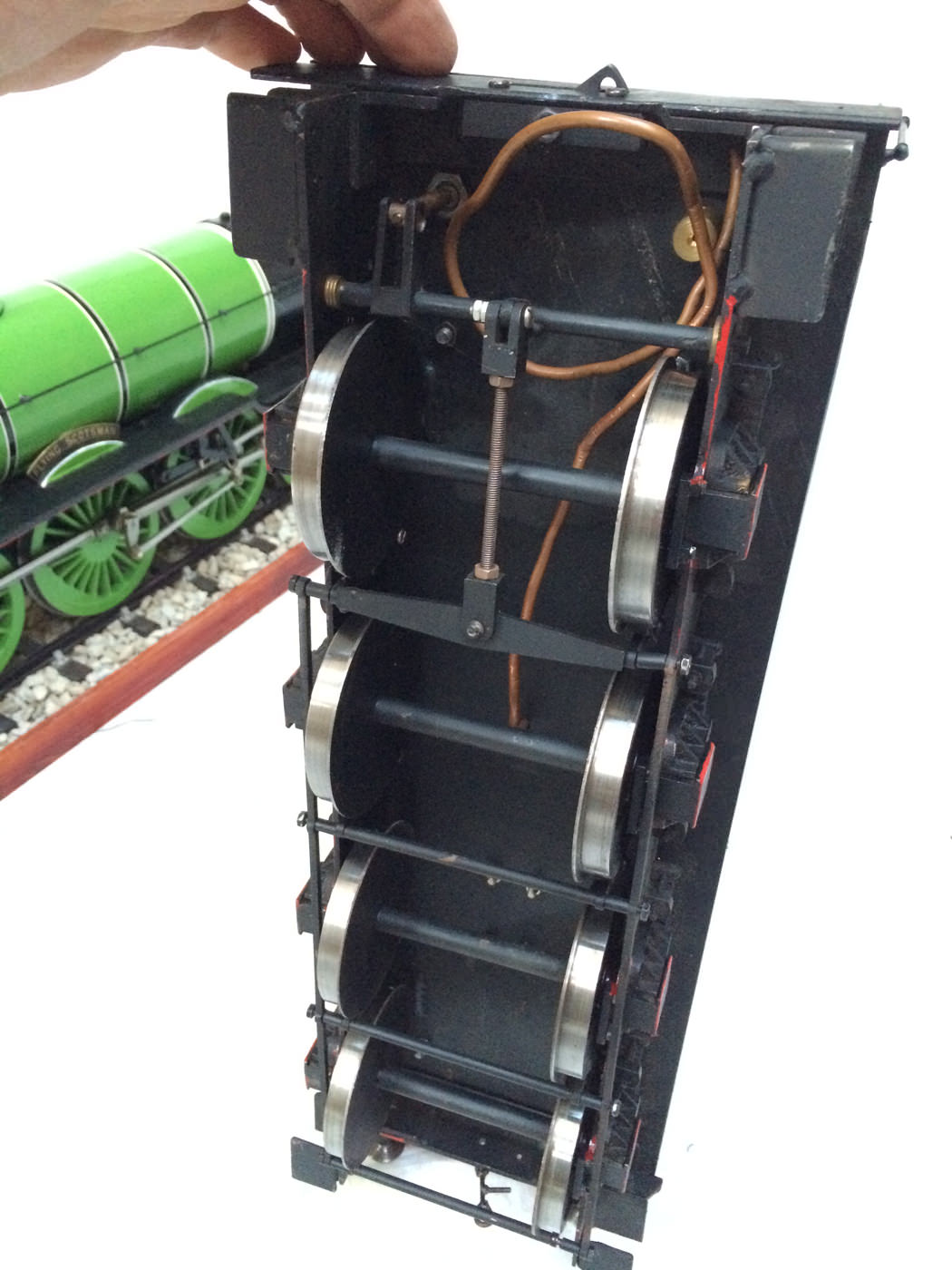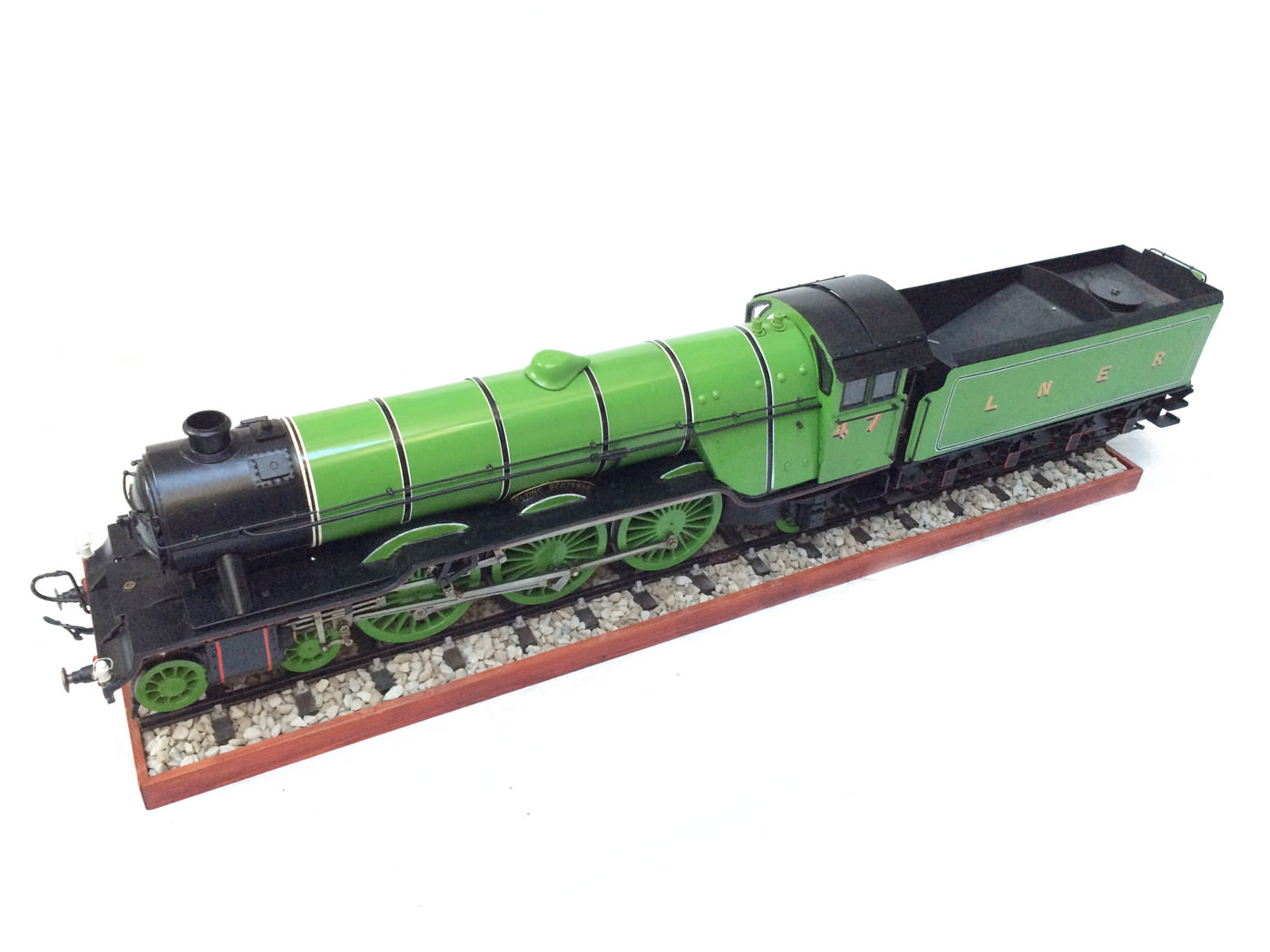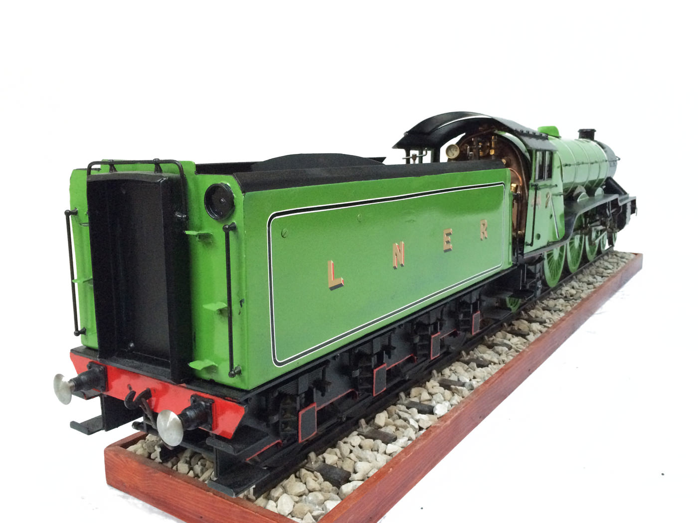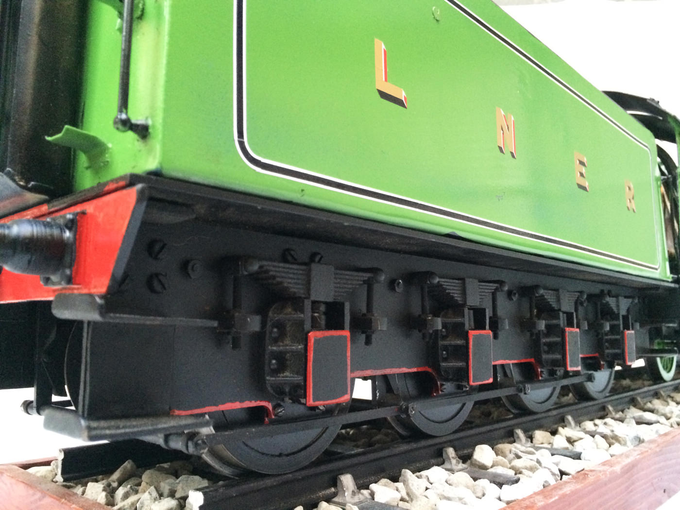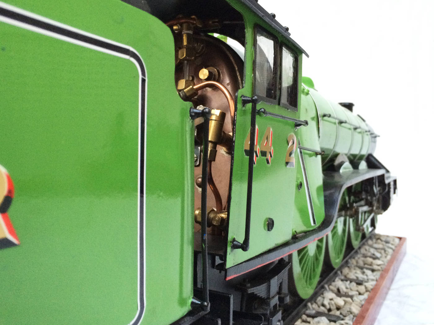 Here we have a 3 1/2" LNER A3, 'Flying Scotsman'.  This is a relatively rare Clarksons design loco, and is the full 3 cylinder job.  The loco is brand new, unsteamed, and carries a very tidy professional boiler.  We've run the model on air, and although it will turn over, it is very tight and the valves haven't yet been set.  Similarly it isn't quite finished, still requiring a few little plumbing jobs before the first fire is lit.  The front end and steam pathway pipes are all done, and generally it is just plumbing in the tender water pipes and injector.