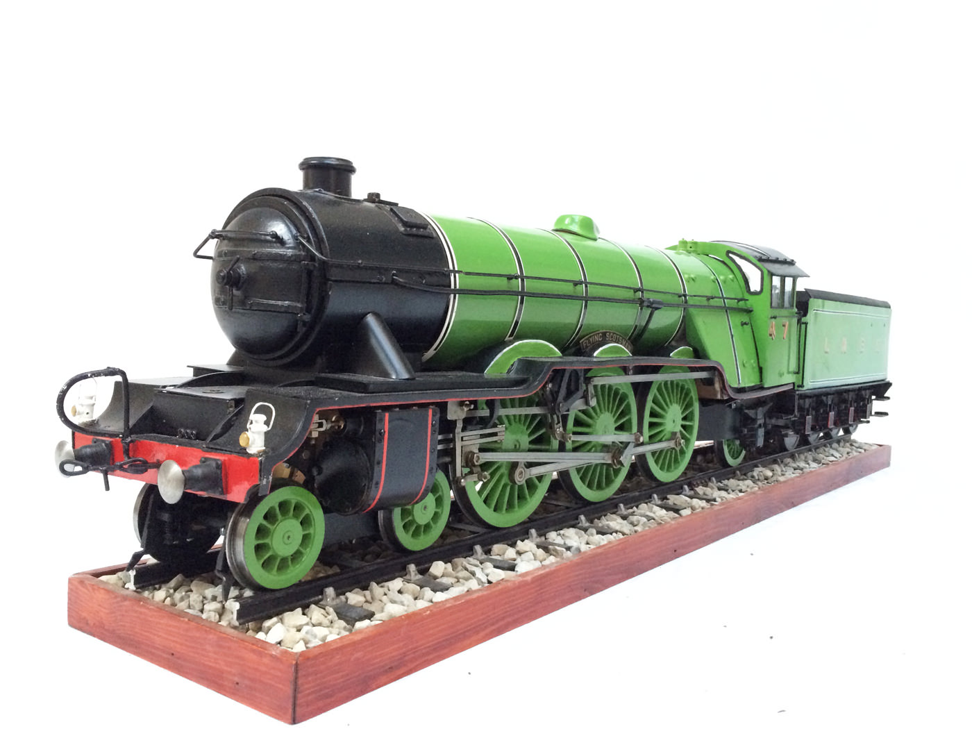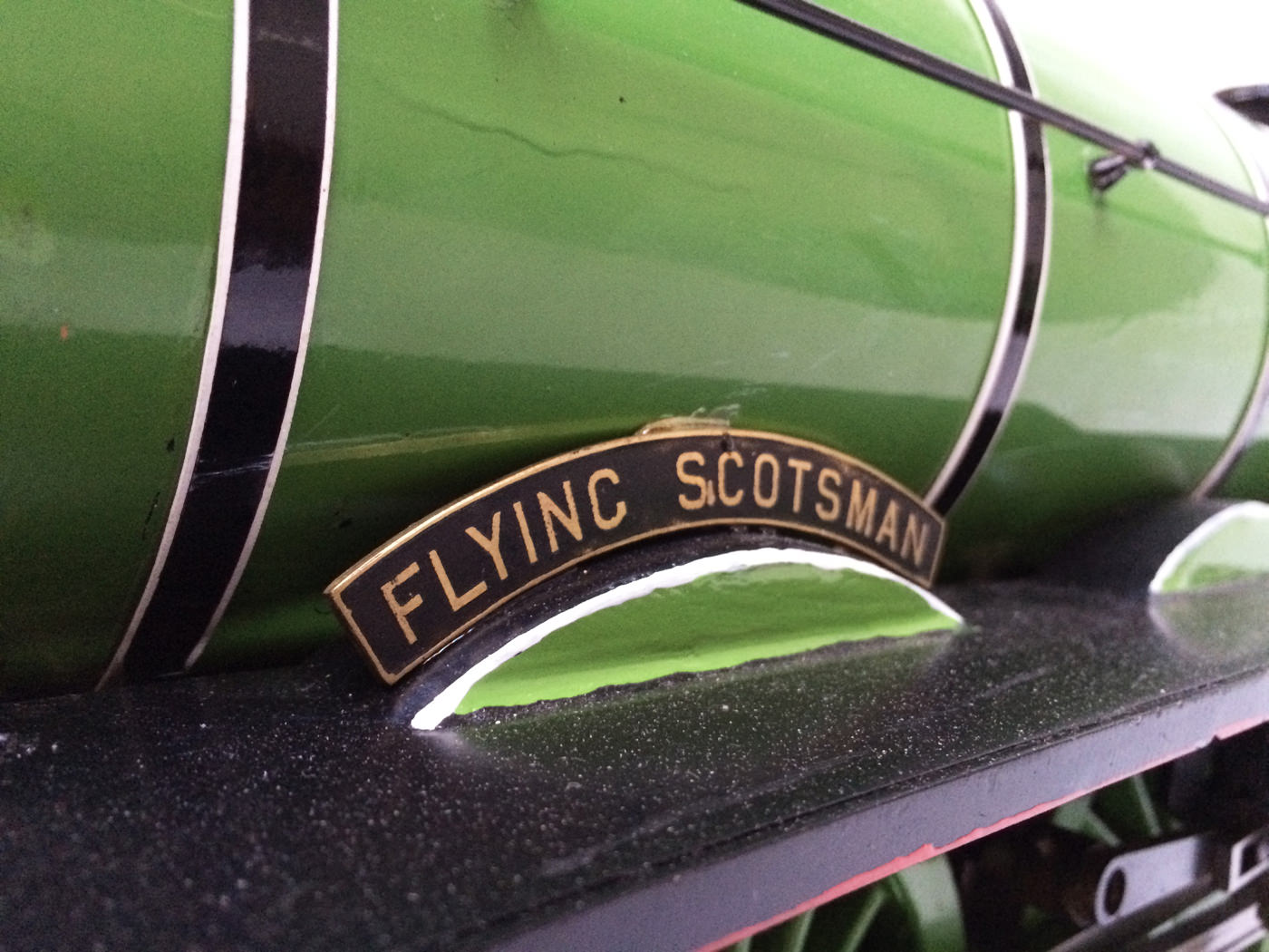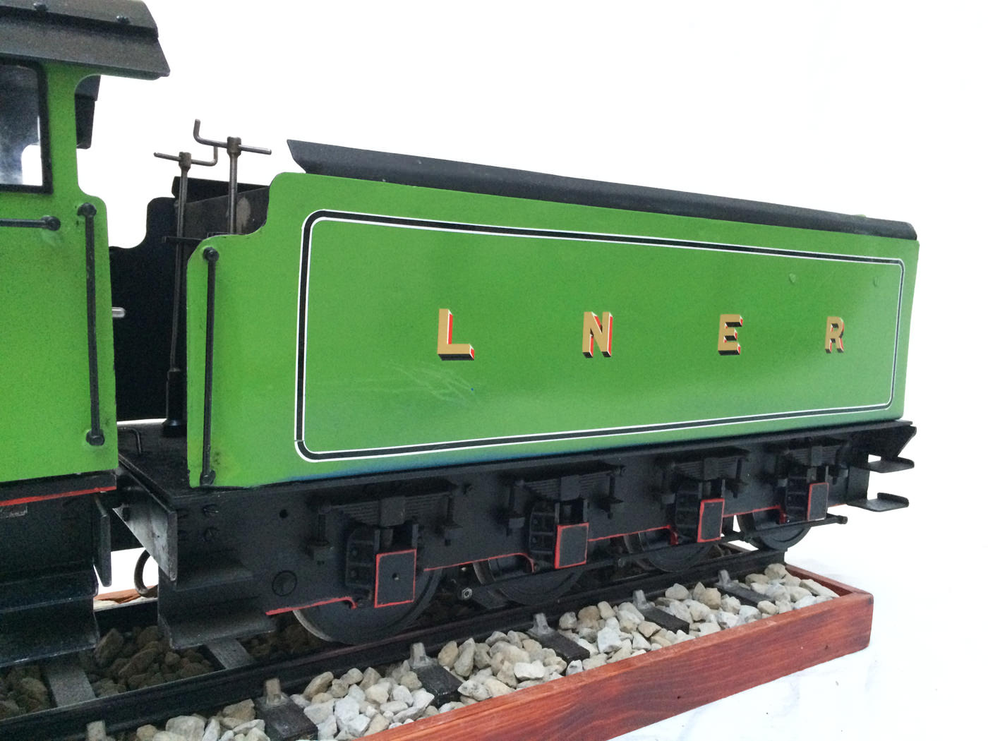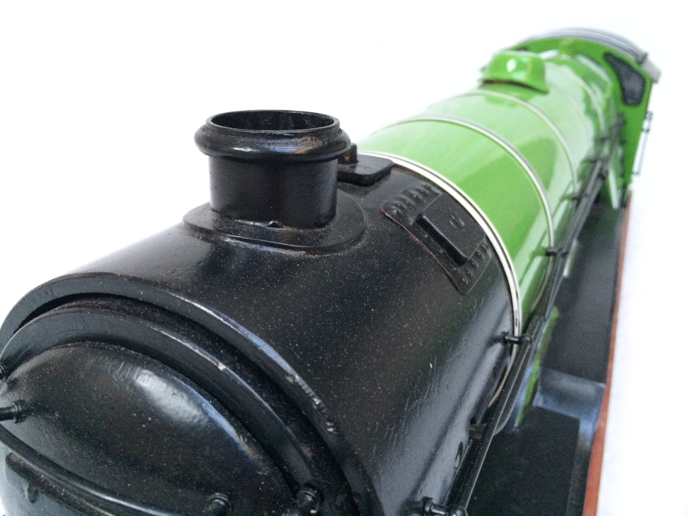 Here we have a 3 1/2" LNER A3, 'Flying Scotsman'.  This is a relatively rare Clarksons design loco, and is the full 3 cylinder job.  The loco is brand new, unsteamed, and carries a very tidy professional boiler.  We've run the model on air, and although it will turn over, it is very tight and the valves haven't yet been set.  Similarly it isn't quite finished, still requiring a few little plumbing jobs before the first fire is lit.  The front end and steam pathway pipes are all done, and generally it is just plumbing in the tender water pipes and injector.