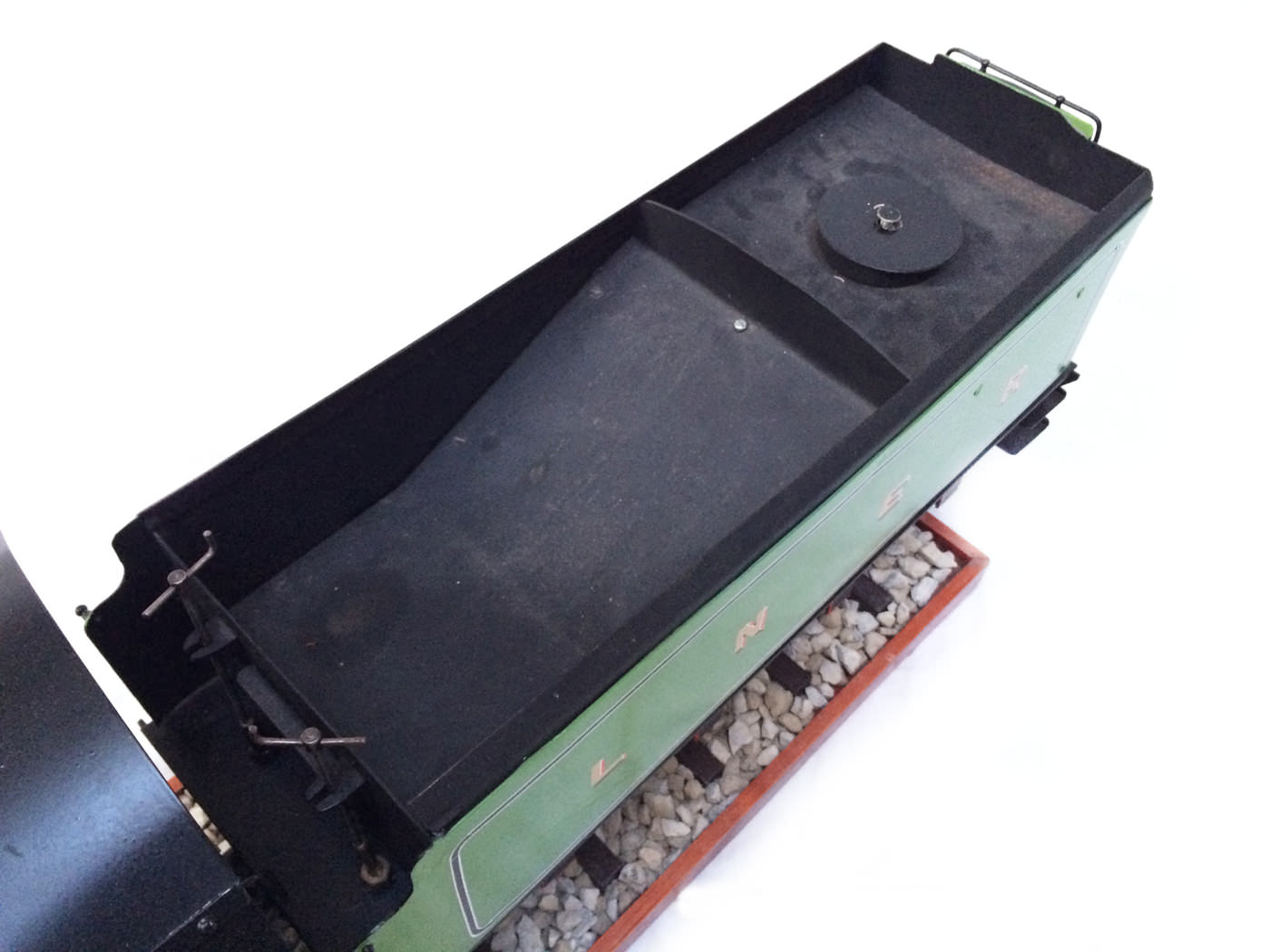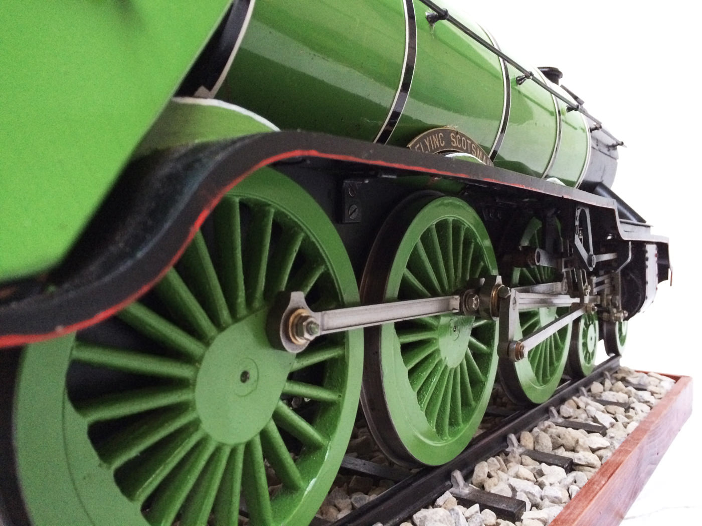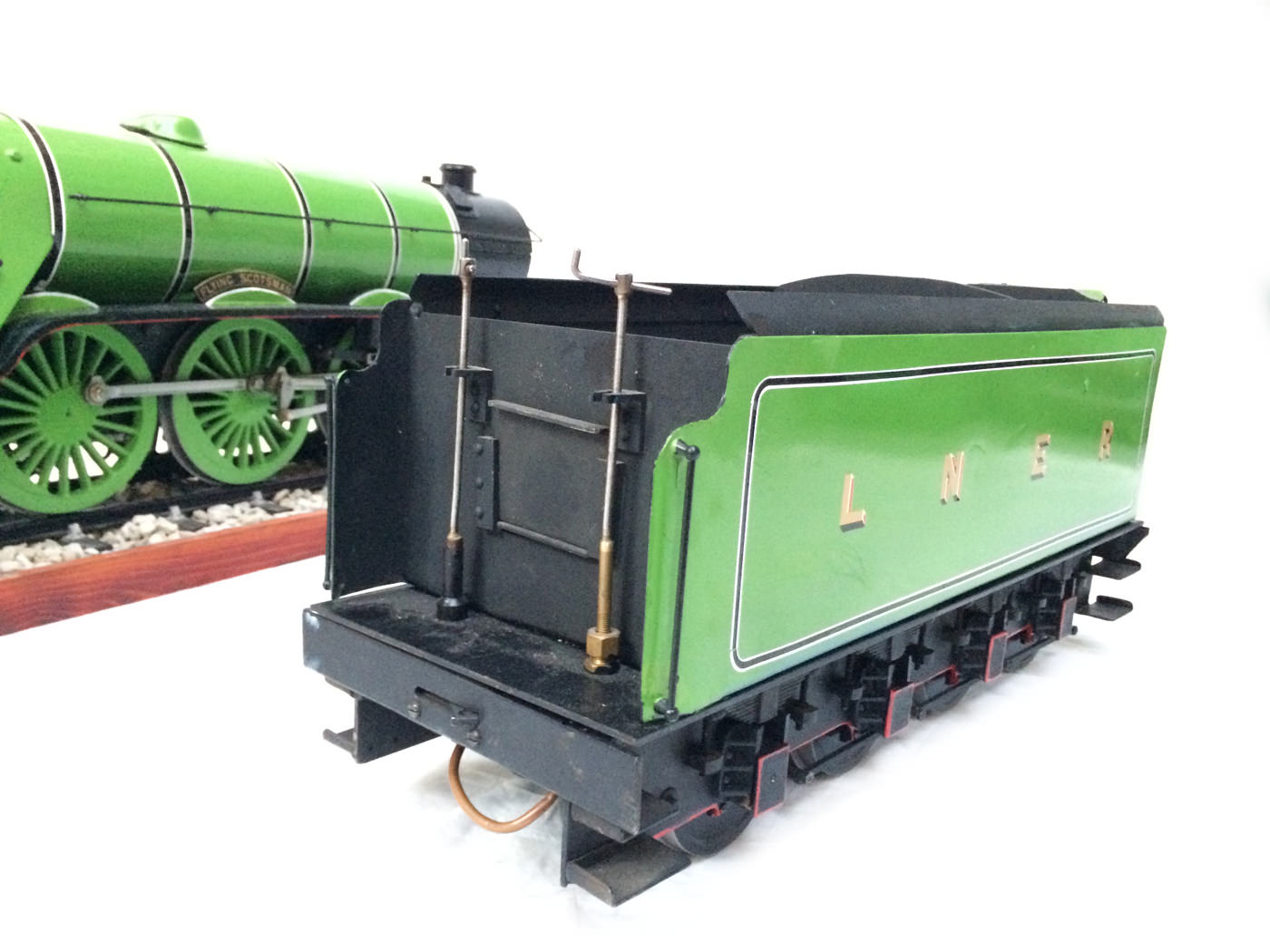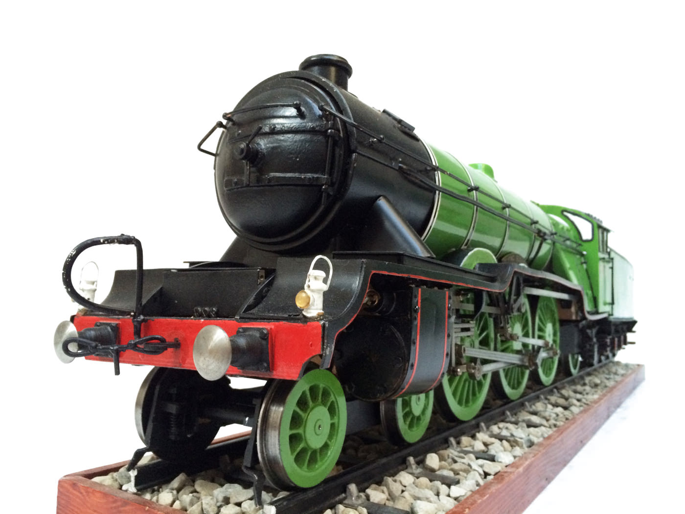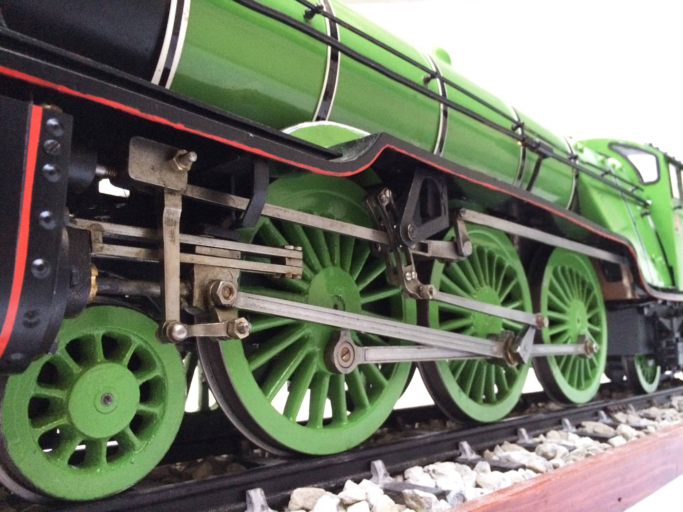Here we have a 3 1/2" LNER A3, 'Flying Scotsman'.  This is a relatively rare Clarksons design loco, and is the full 3 cylinder job.  The loco is brand new, unsteamed, and carries a very tidy professional boiler.  We've run the model on air, and although it will turn over, it is very tight and the valves haven't yet been set.  Similarly it isn't quite finished, still requiring a few little plumbing jobs before the first fire is lit.  The front end and steam pathway pipes are all done, and generally it is just plumbing in the tender water pipes and injector.