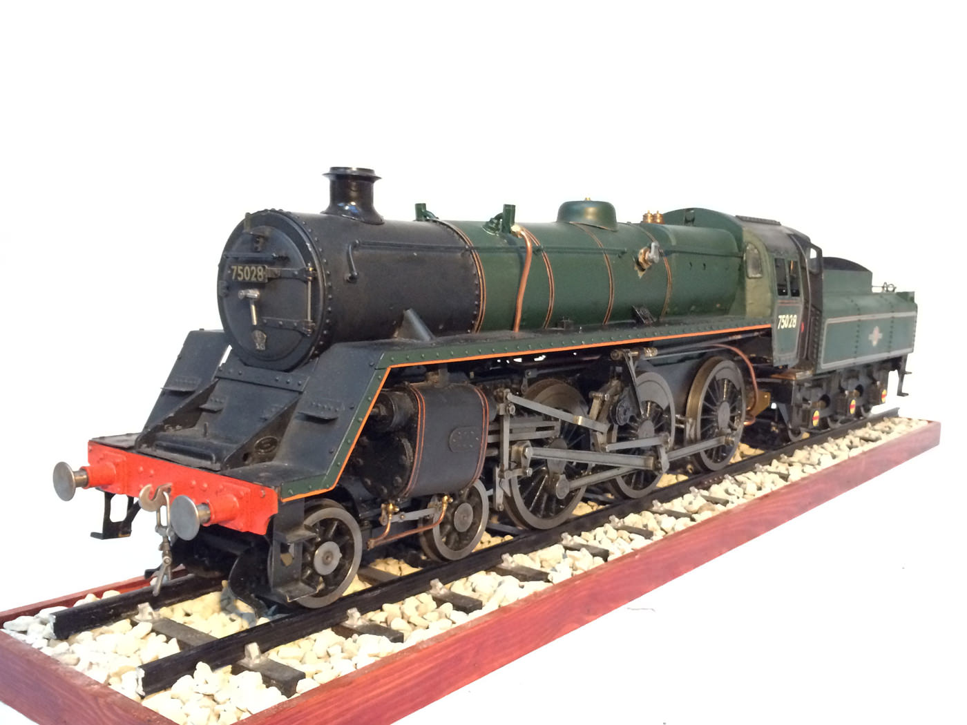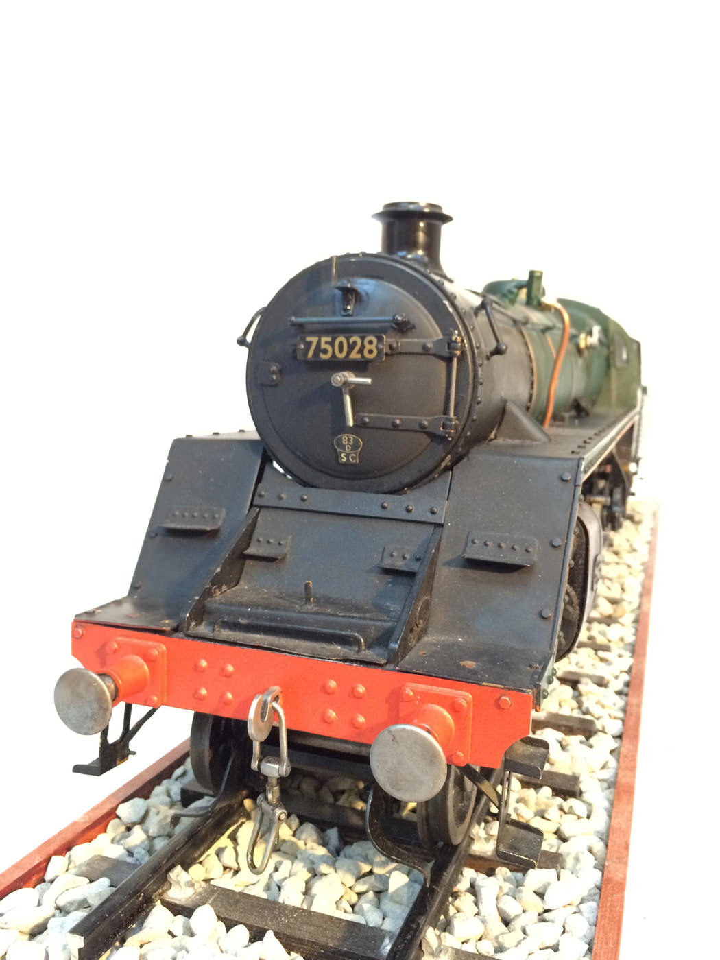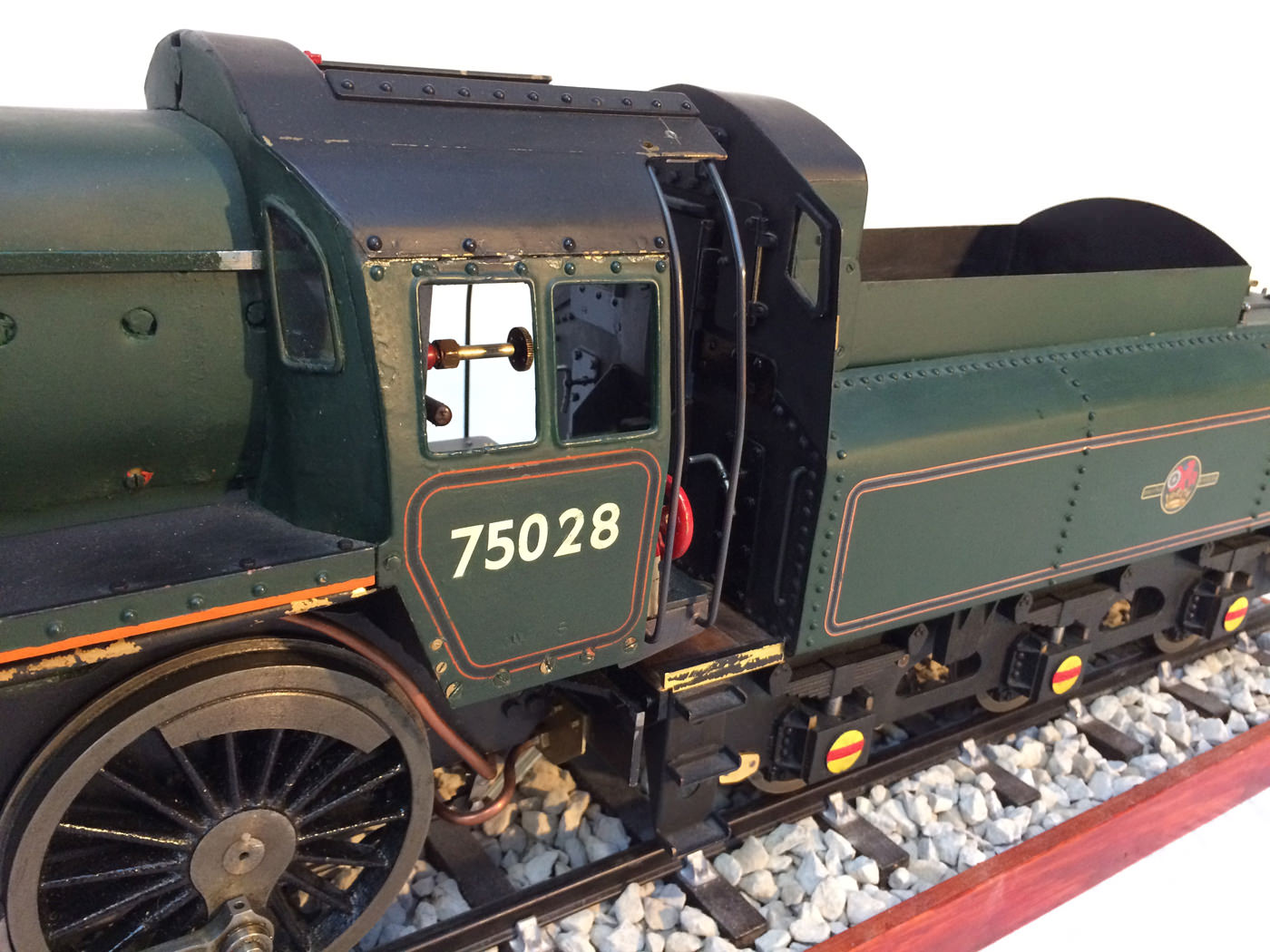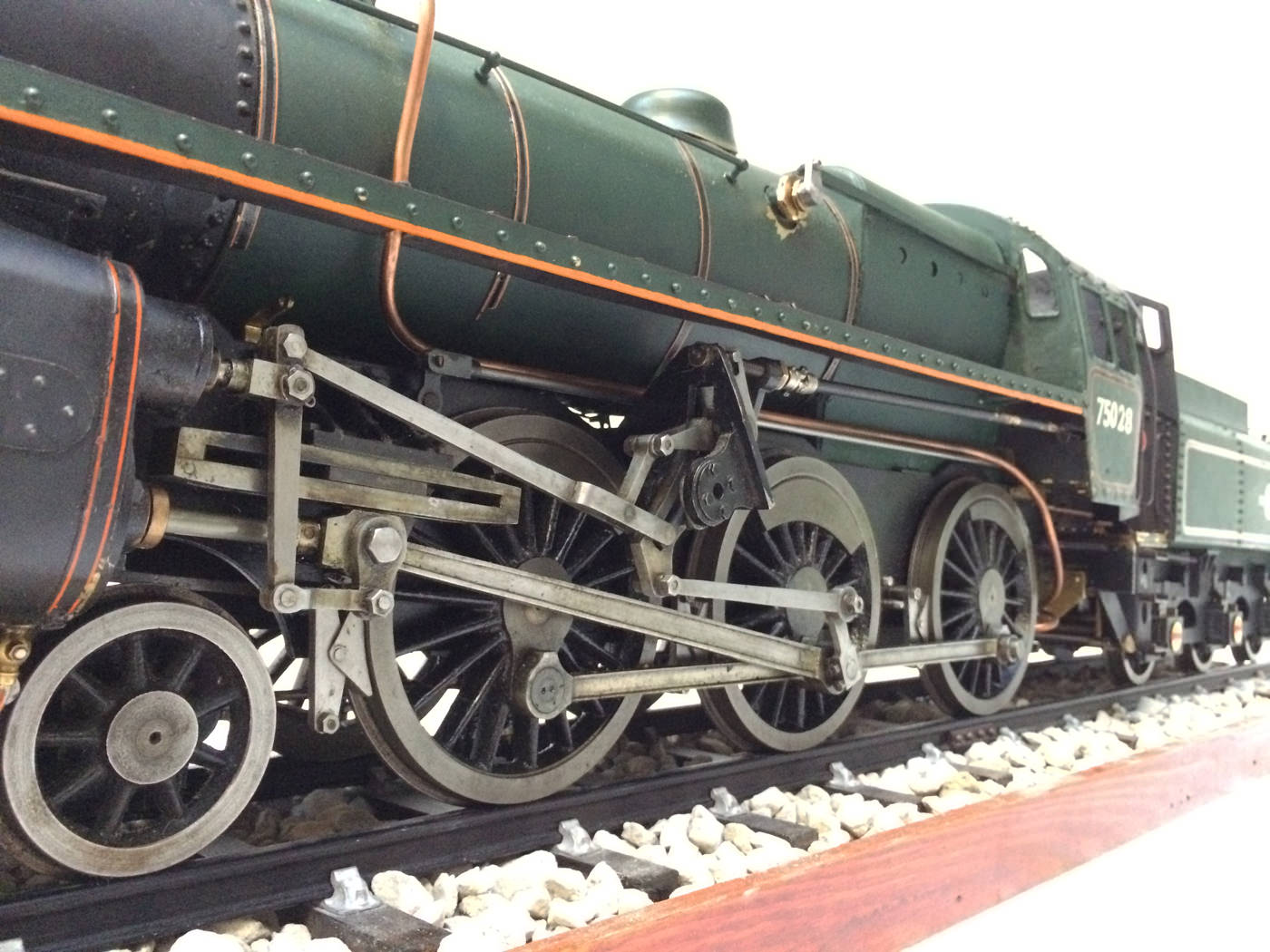 Well, here we have a fairly rare beast.  We know of three of them out there, but certainly not a model that pops up very often.  A 3 1/2" gauge BR Standard class 4.  This is a brand new model, with a professional boiler.  The machining work is really very crisp and tidy, and it certainly runs very well.  We've test steamed her a couple of weeks ago to find out exactly what needed before she was fully commissioned and ready to go, and actually everything worked pretty much perfectly straight out of the box.  The only issue was that the front set of driving wheels wasn't keyed to the axle and slipped round a fraction ending the fun.  We've since finished the model, keying the wheel, and she'd now ready to hit the track.