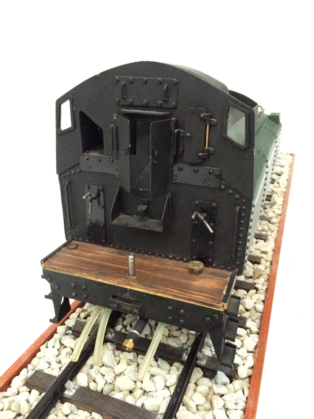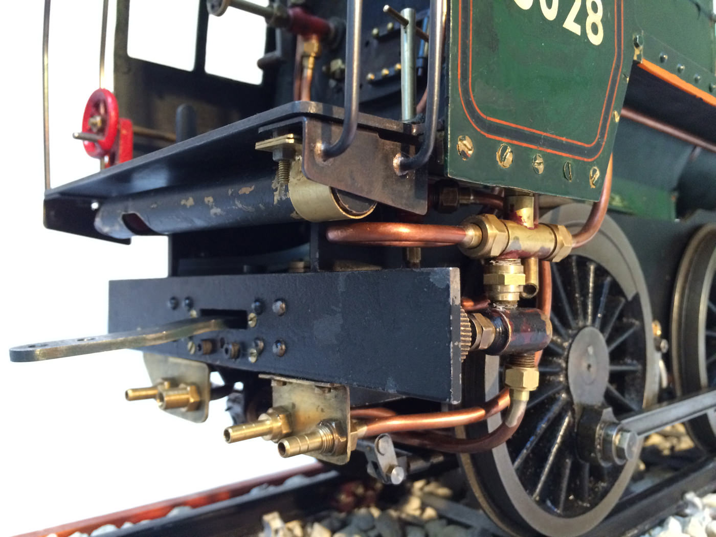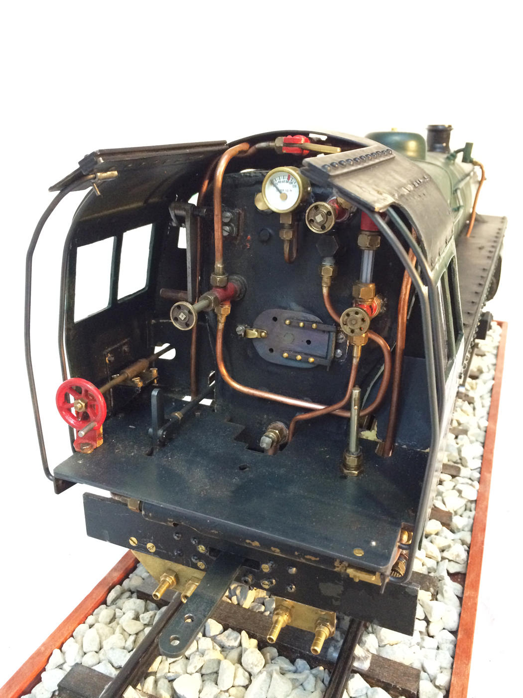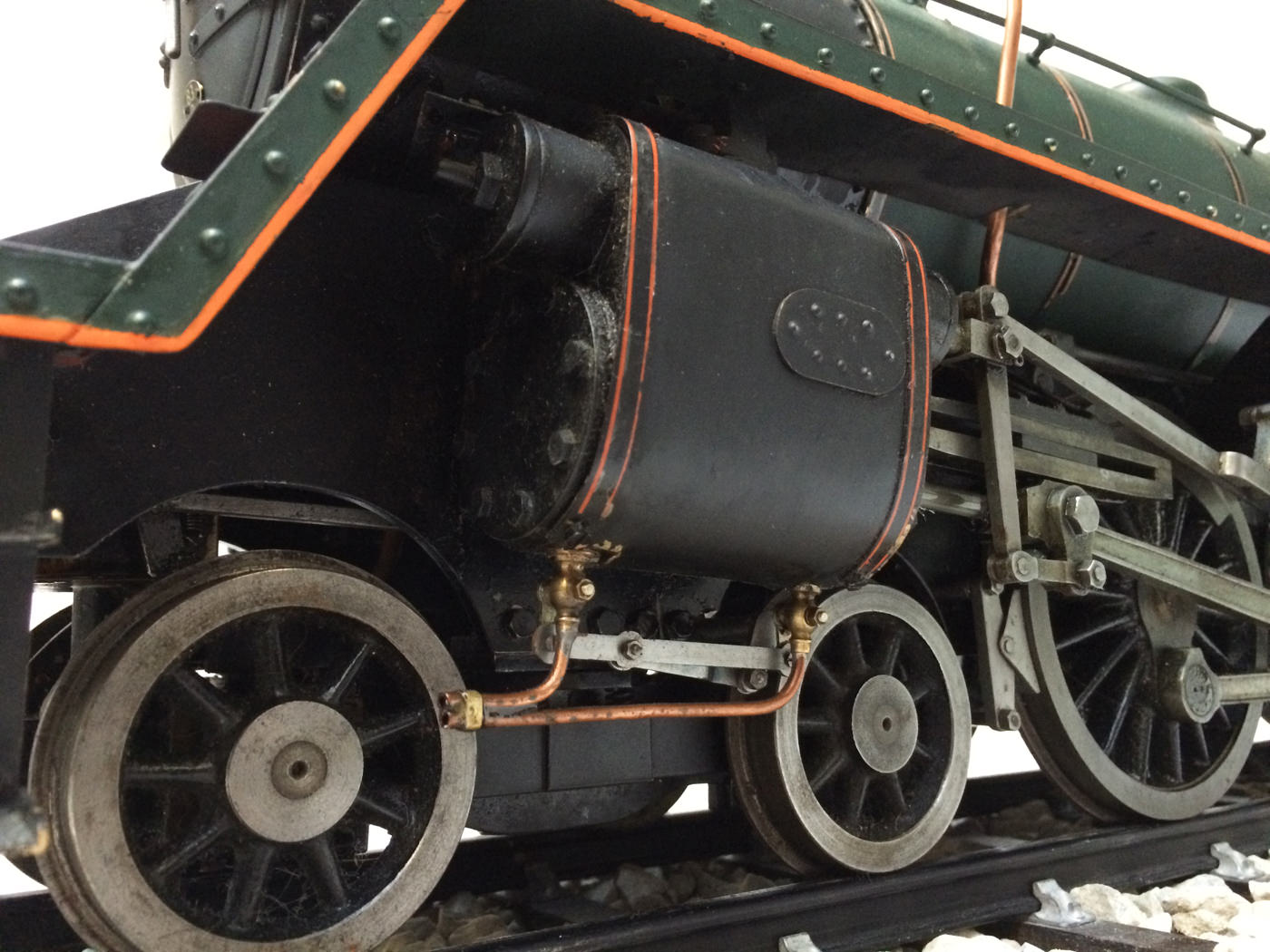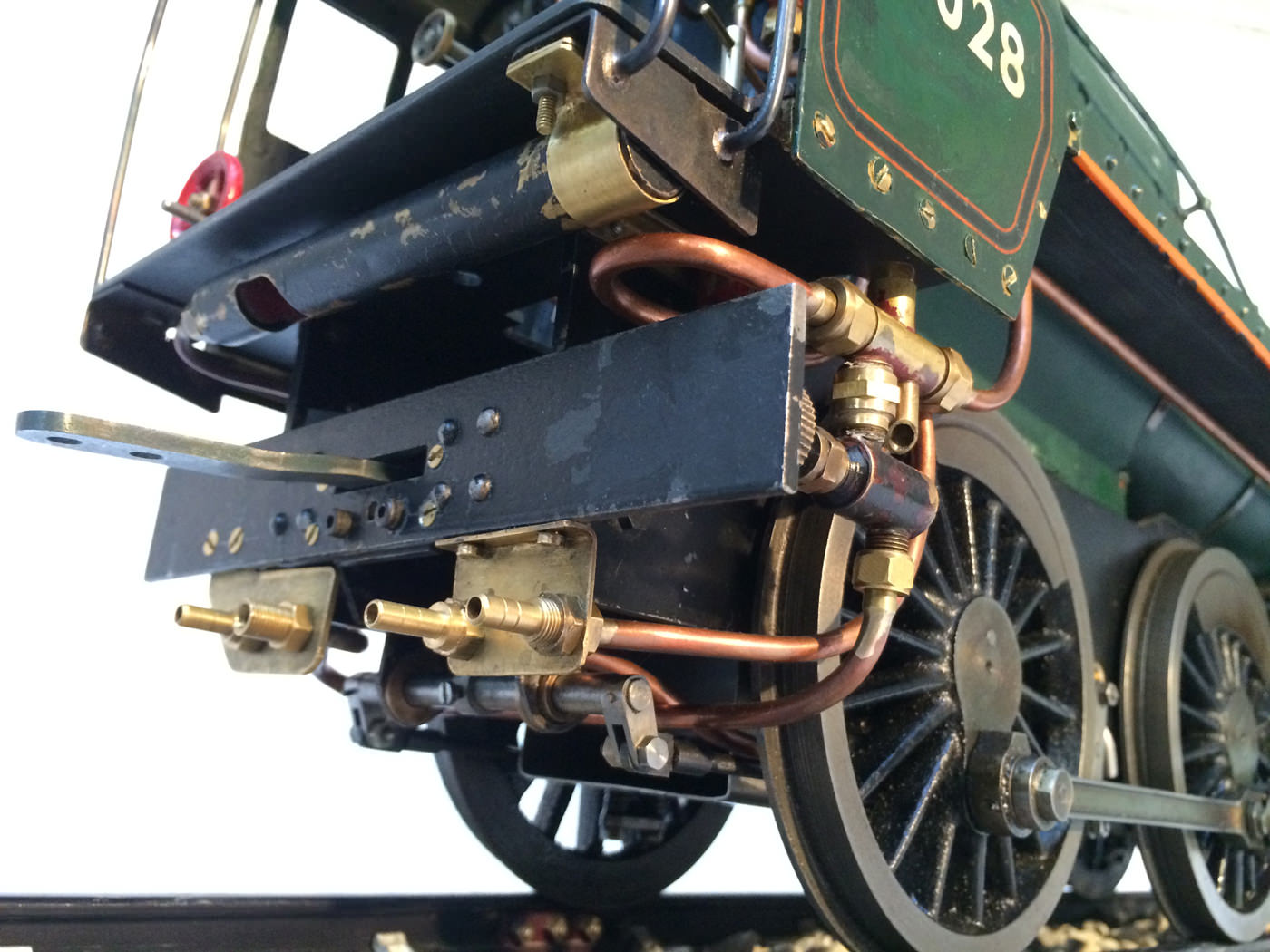 Although the paint finish has the odd scratch and chip, and in places the platework is a bit on the functional side, this is still a well made, and brand new model with only a couple of test steamings under it's belt.  All the usual things are there, injector, axle pump with footplate mounted bypass valve, and of course the hand pump in the tender.  Footplate operated draincocks, and lubrication is from the usual mechanical pump hidden under the front footplate.