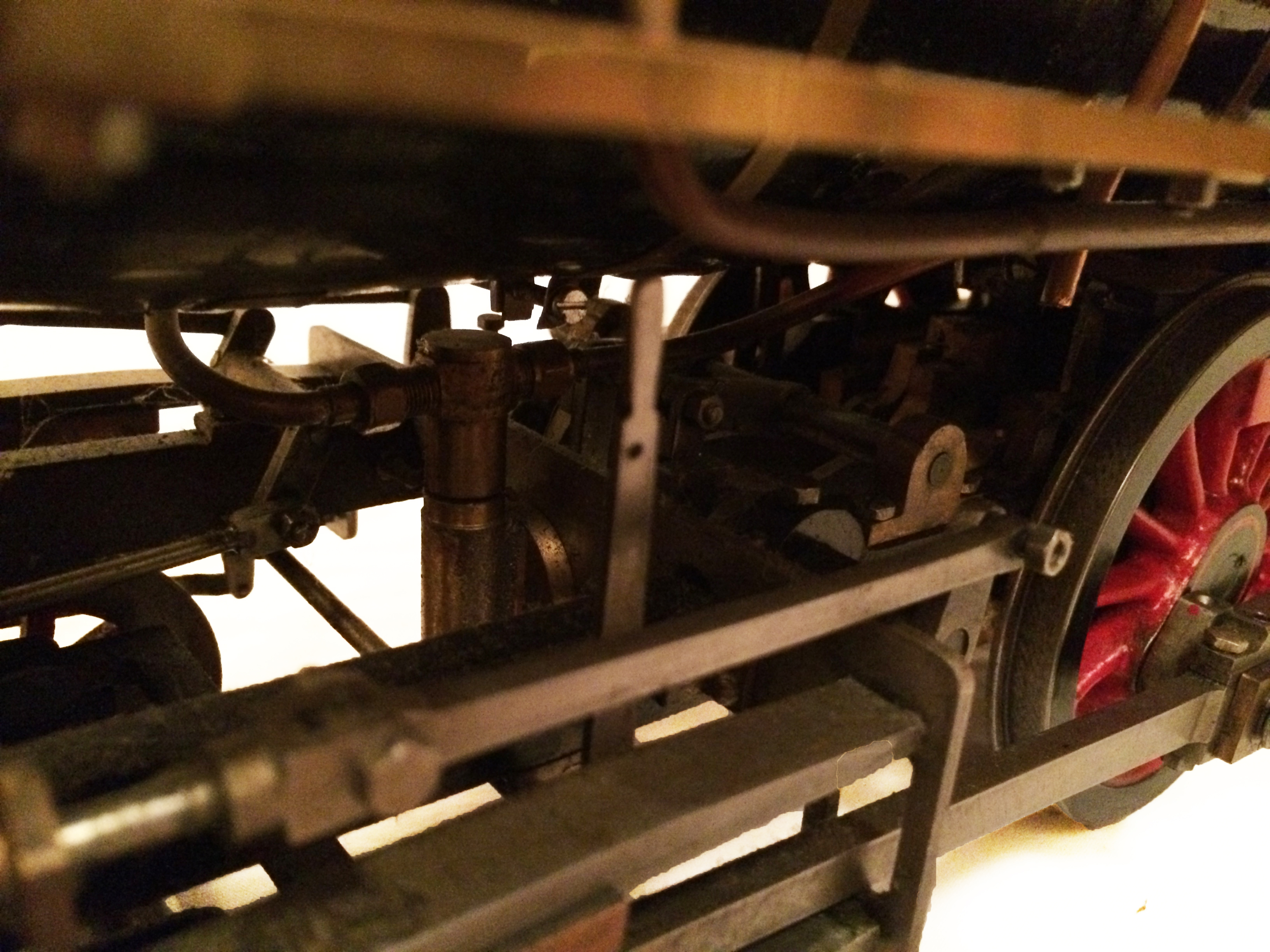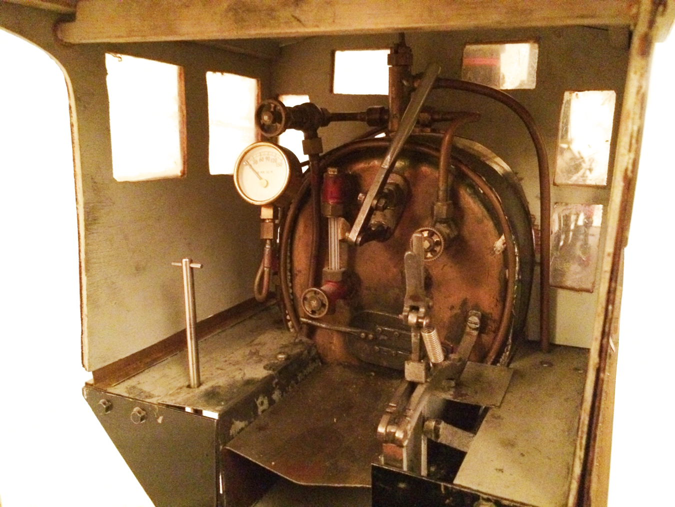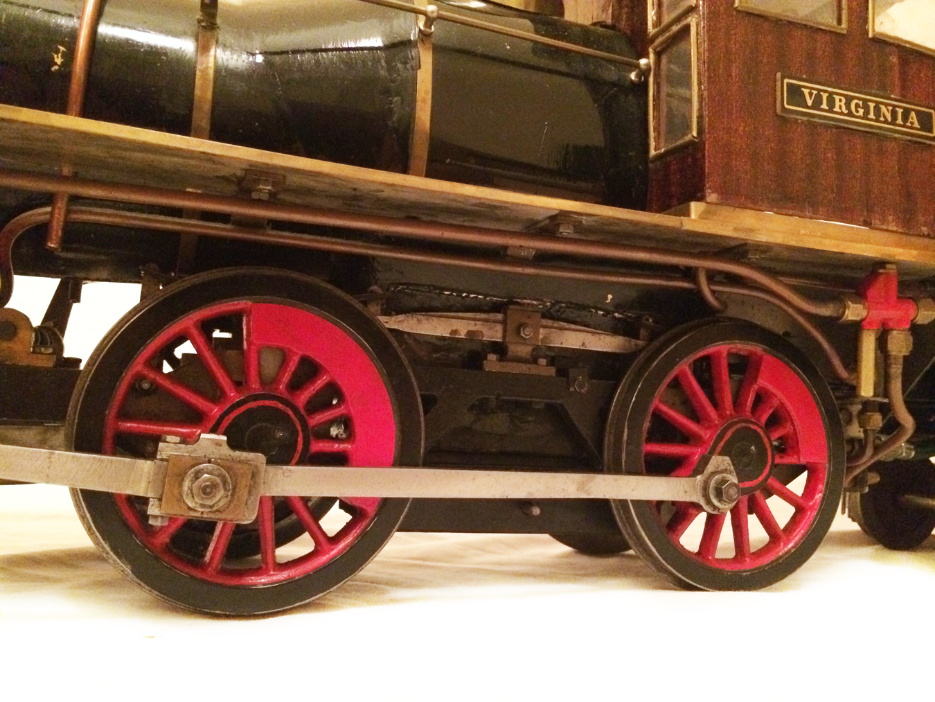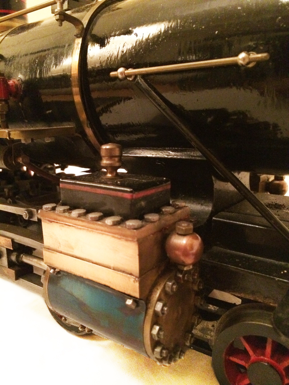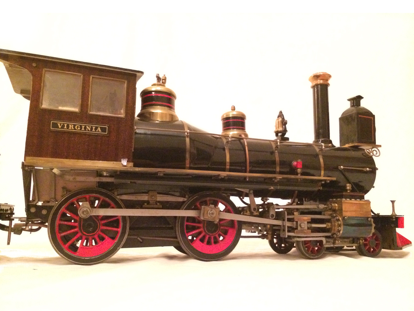Here we have an example of the venerable LBSC Virginia 4-4-0 locomotive. This is an older model that would benefit from a little TLC! Its well built though, with nice detailing and it runs very nicely on air. It sports an axle pump with footplate mounted bypass valve, and injector and a tender hand pump. Draincocks are operated from a vertical lever on either side of the boiler just behind the cylinders, and theres a nice big mechanical lubricator feeding through a clack mounted on the front underneath the smokebox.