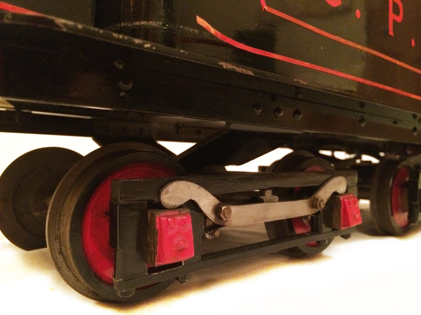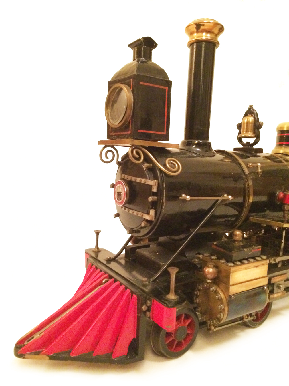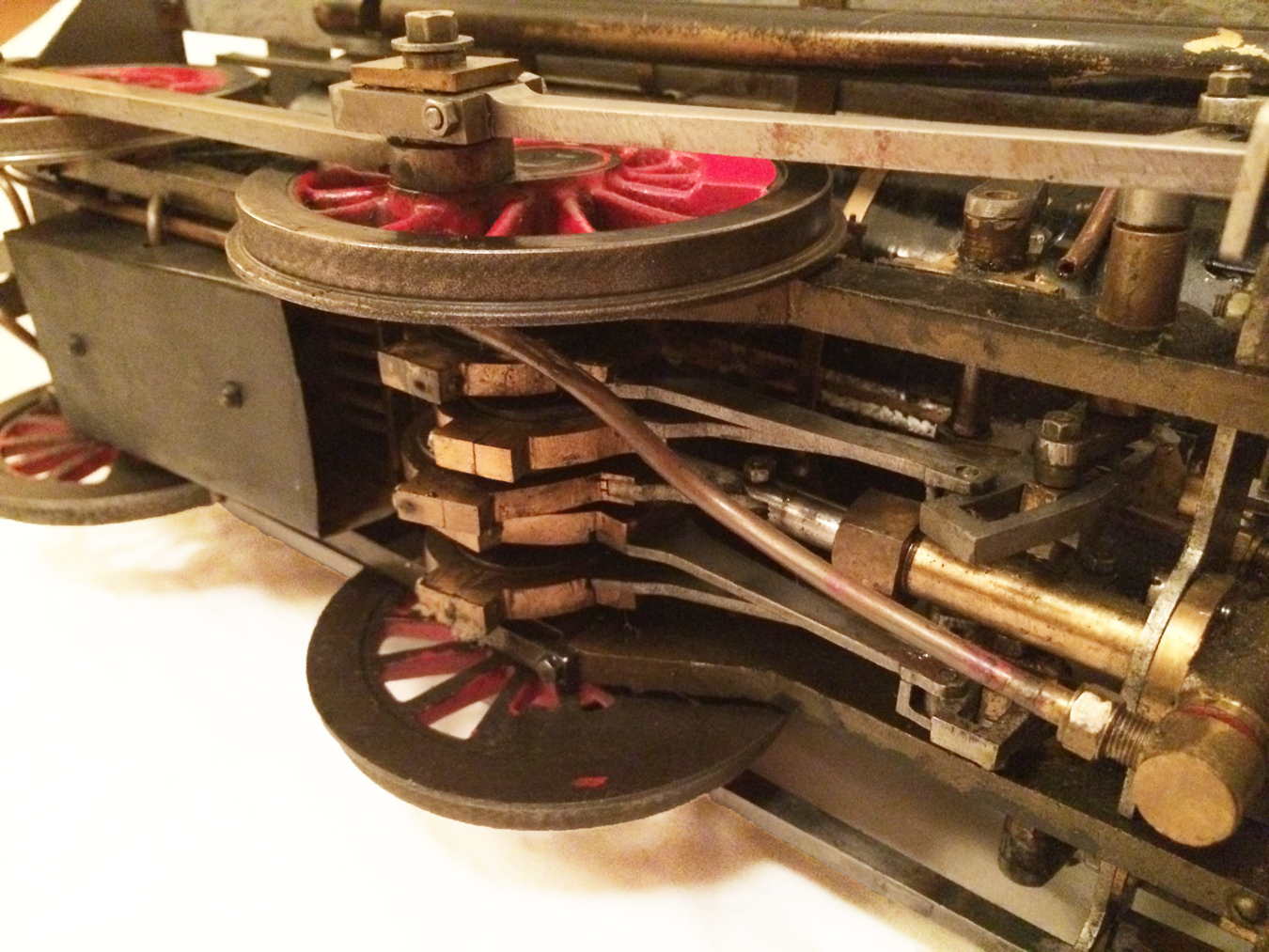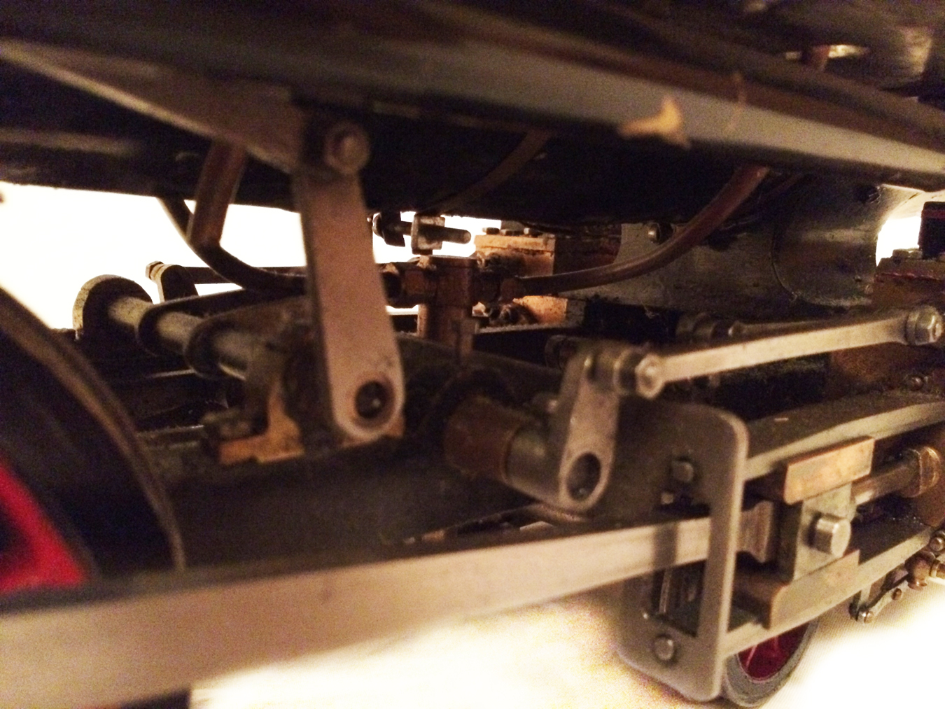 Here we have an example of the venerable LBSC Virginia 4-4-0 locomotive. This is an older model that would benefit from a little TLC! Its well built though, with nice detailing and it runs very nicely on air. It sports an axle pump with footplate mounted bypass valve, and injector and a tender hand pump. Draincocks are operated from a vertical lever on either side of the boiler just behind the cylinders, and theres a nice big mechanical lubricator feeding through a clack mounted on the front underneath the smokebox.