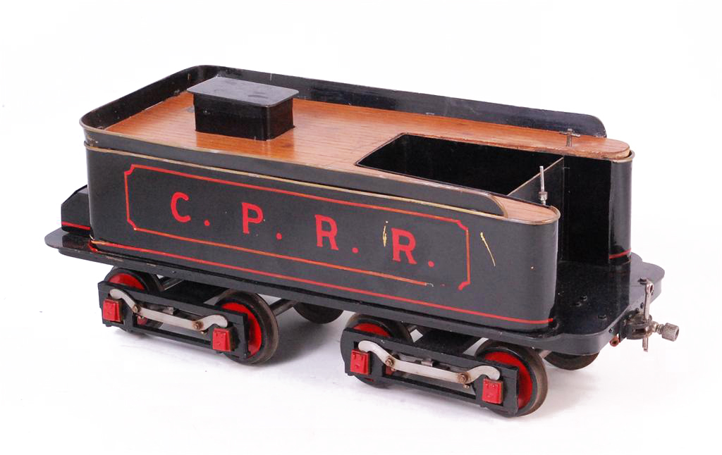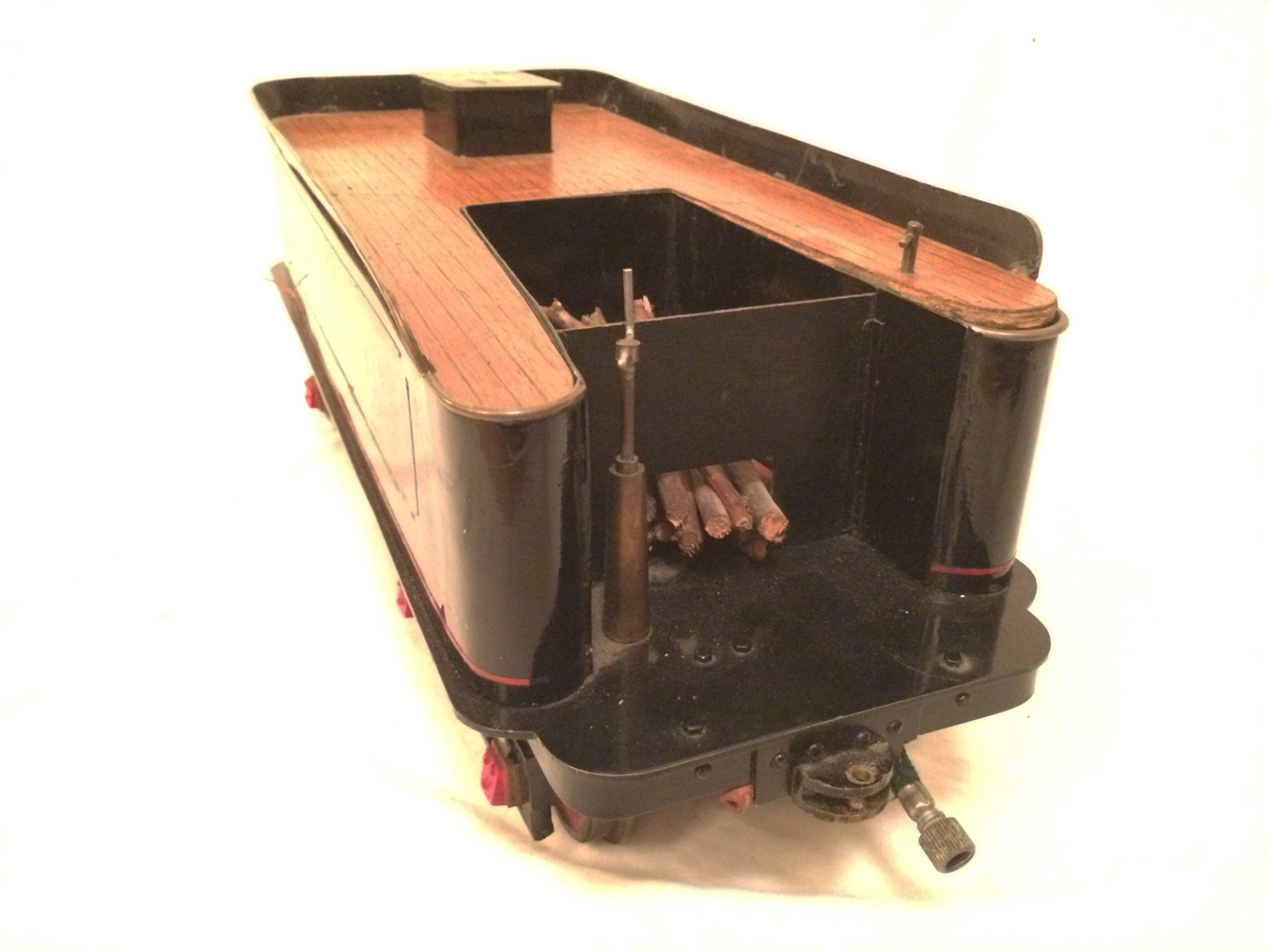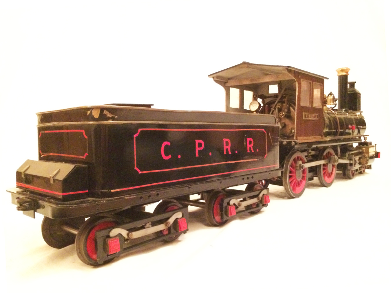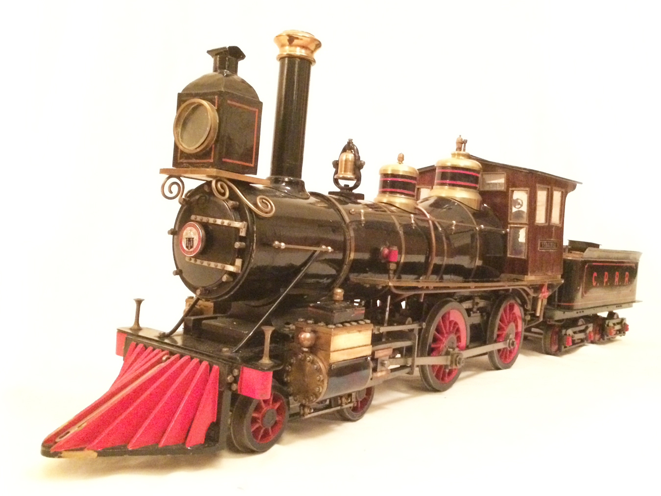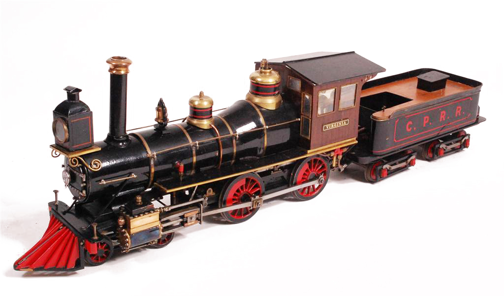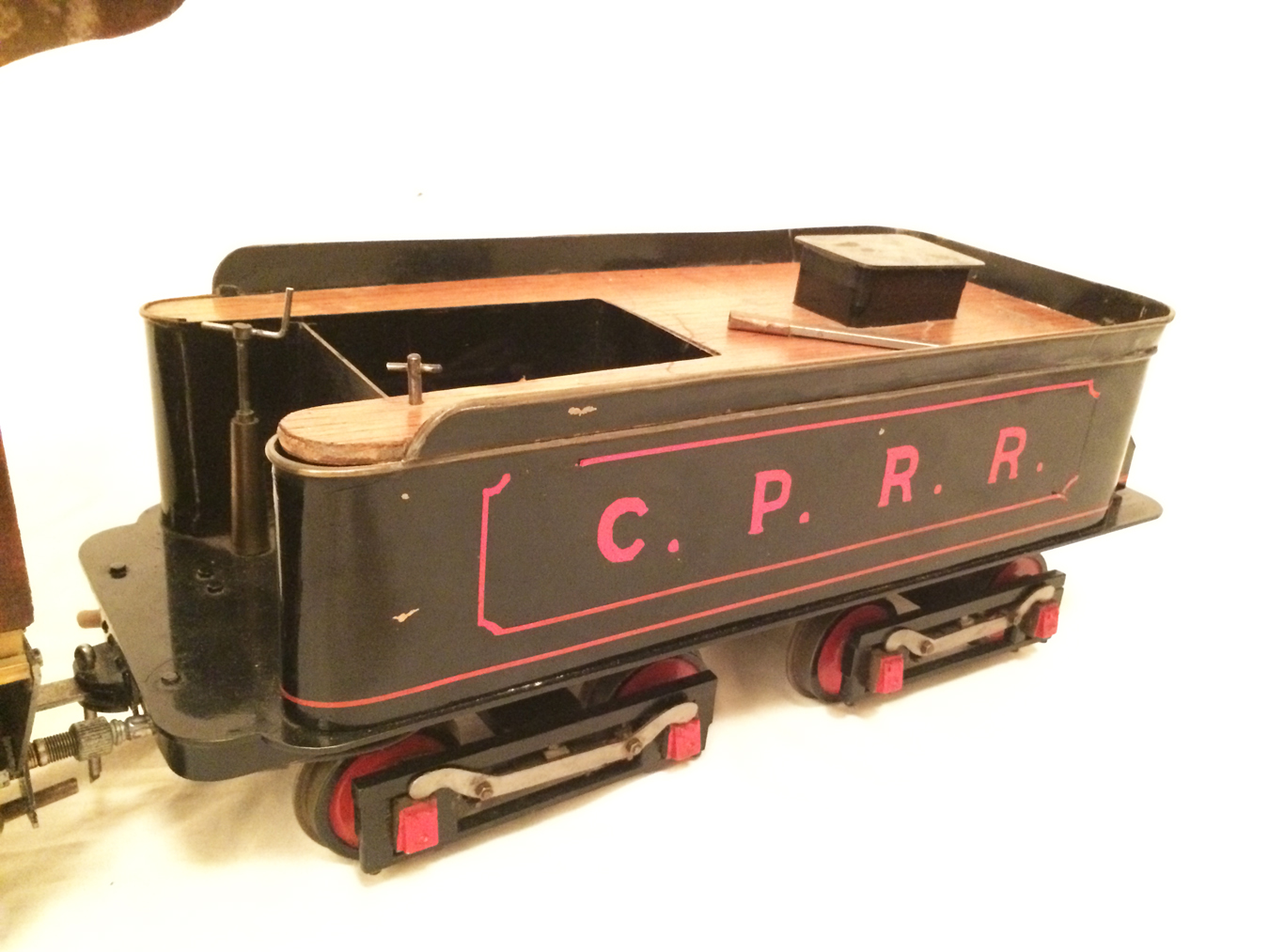 Here we have an example of the venerable LBSC Virginia 4-4-0 locomotive. This is an older model that would benefit from a little TLC! Its well built though, with nice detailing and it runs very nicely on air. It sports an axle pump with footplate mounted bypass valve, and injector and a tender hand pump. Draincocks are operated from a vertical lever on either side of the boiler just behind the cylinders, and theres a nice big mechanical lubricator feeding through a clack mounted on the front underneath the smokebox.