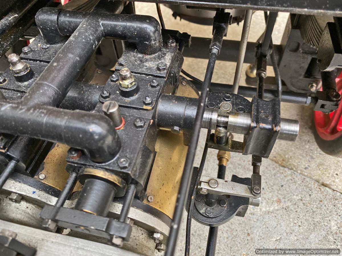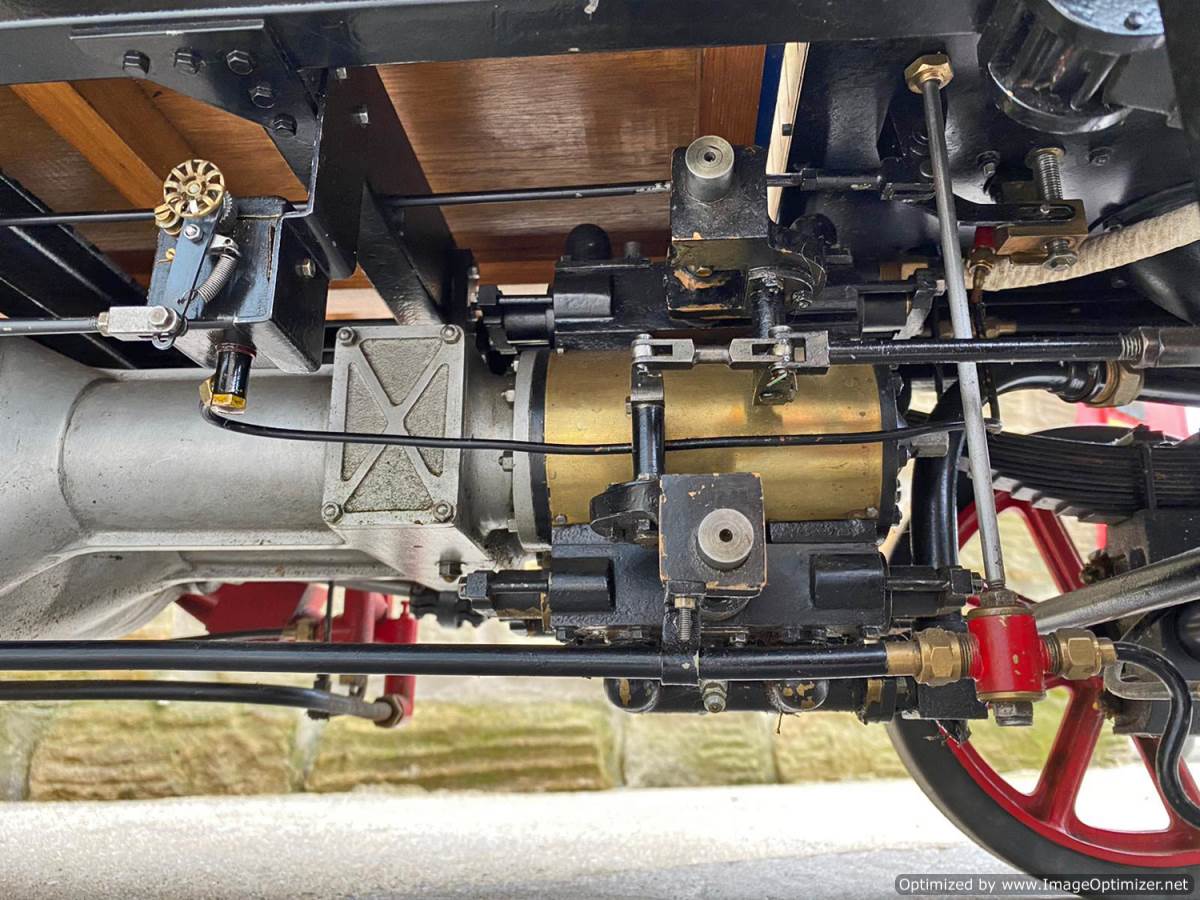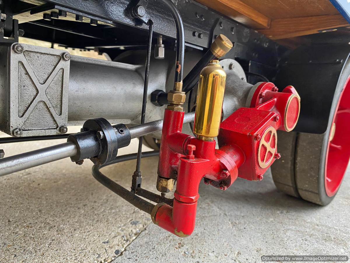 Water is fed by an injector tucked away under the cab floor, as well as a crank pump and cab mounted bypass valve. The pump it's self passes through an anti-surge plenum chamber and then through a pre-heater in the cab to raise the temperature before it enters the boiler. There is a neat little locking pin located behind the rear axle that enables the model to be clicked out of gear so that the engine (and water pump) can be run whilst stationary. Lubrication is mechanical and tucked neatly under the deck, and she's also fitted with a water lifter which, like the rest of the model works beautifully.